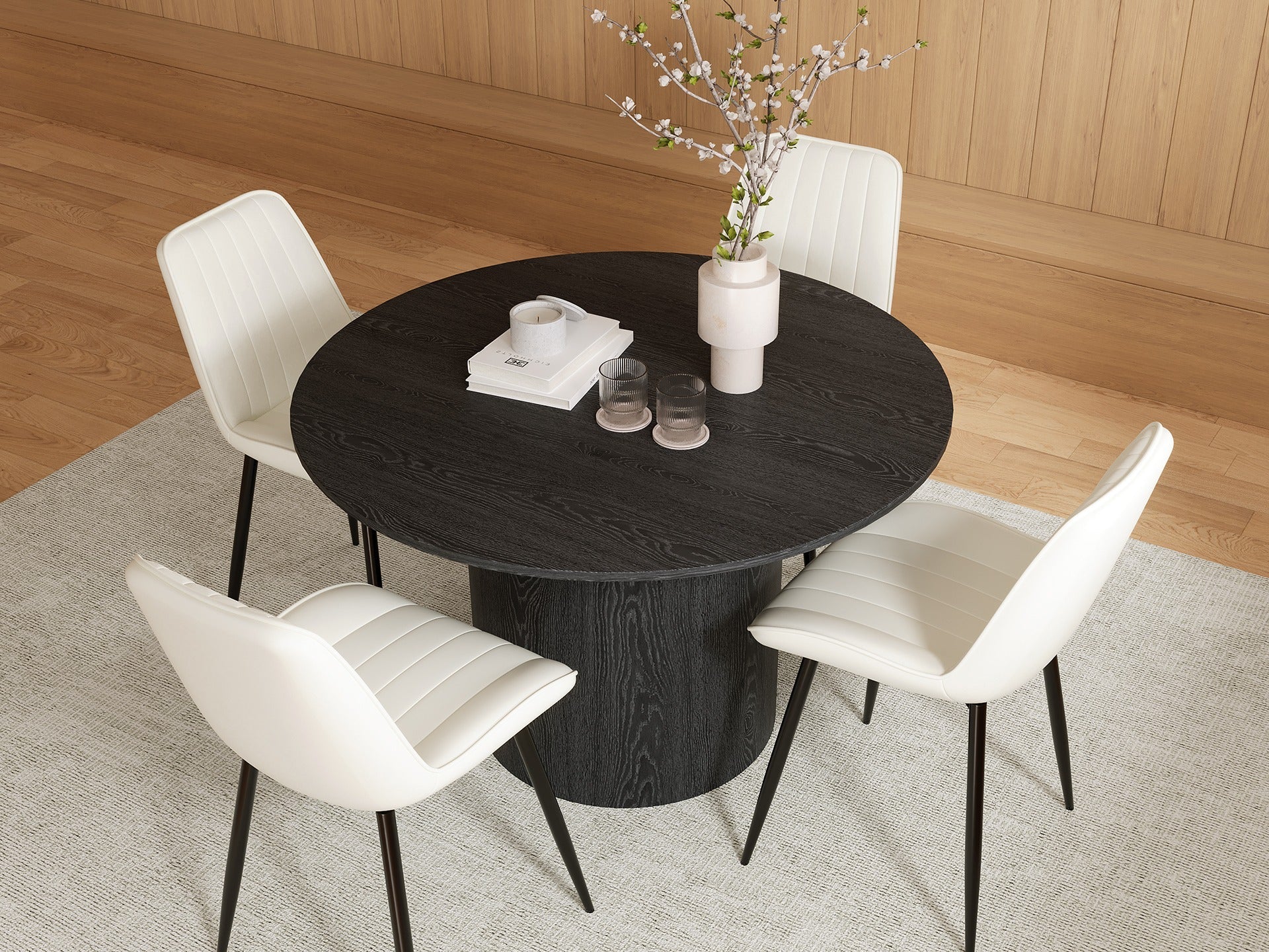 The Adley Round Dining Table features a sleek MDF board wood-look paper laminate for a stylish and durable surface. Its cylindrical pedestal base offers stable support and modern aesthetics. The round, edge-free design ensures safety, making it ideal for homes or cafes. Effortless assembly saves time.