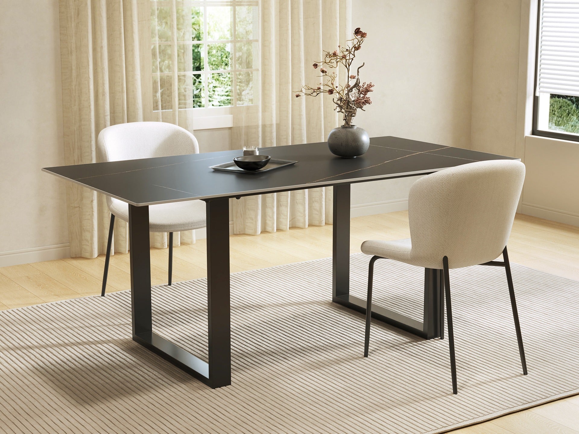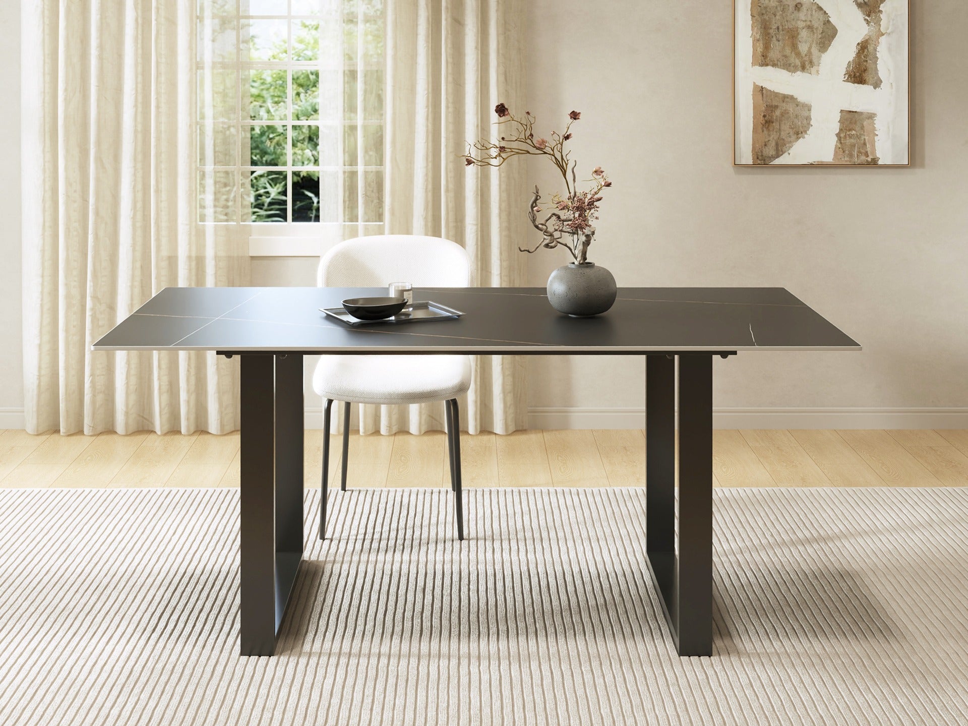 With a refined ceramic top, the Ainsley Dining Table combines modern style with durability. Its black powder-coated legs offer stability and are scratch-resistant. The generous surface suits various uses, making it ideal for homes, cafes and so on. Simple assembly and effortless cleaning.