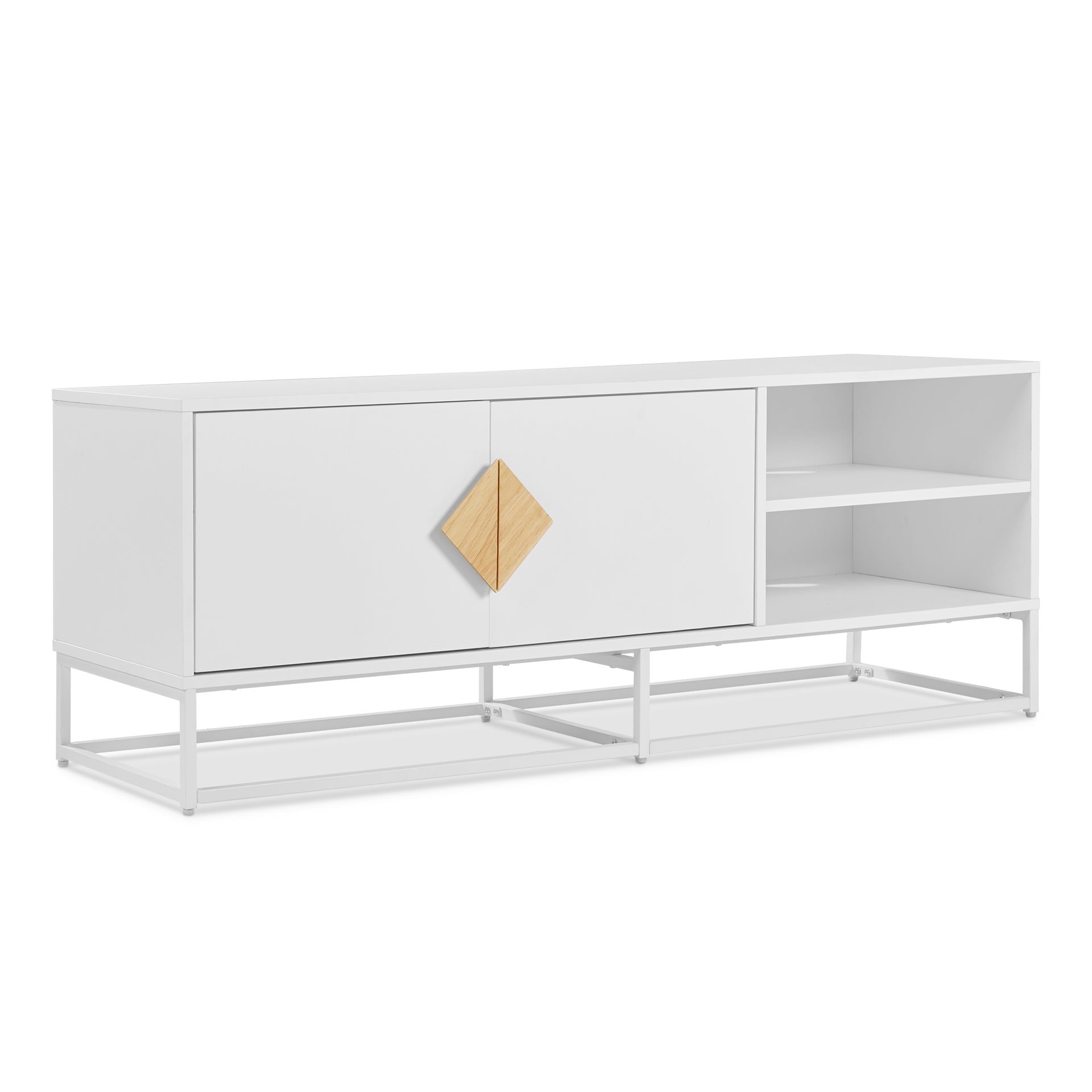 This alaska entertainment unit is one of our alaska range products and features a stylish minimalist style, which provides a great home decor to take the look of your living room to the higher level. With its clean lines, elegant white finish and multi-functional storage options, it will brighten up any living space and will be a practical addition to your home. Constructed from high quality materials and a powder-coated metal frame, this tv stand has a sturdy construction that will last for years, while the open metal frame gives it an airy feel. Not only that, this alaska tv cabinet features a large flat top for various types of tv or media storage, as well as two individual cabinets for extra storage space for your games consoles, headphones and various accessories. And the unique solid wood rhombus handle makes it a pleasure to use. It is not only an entertainment unit but also a decorative piece for the family living room which will bring a contemporary and elegant style to your home