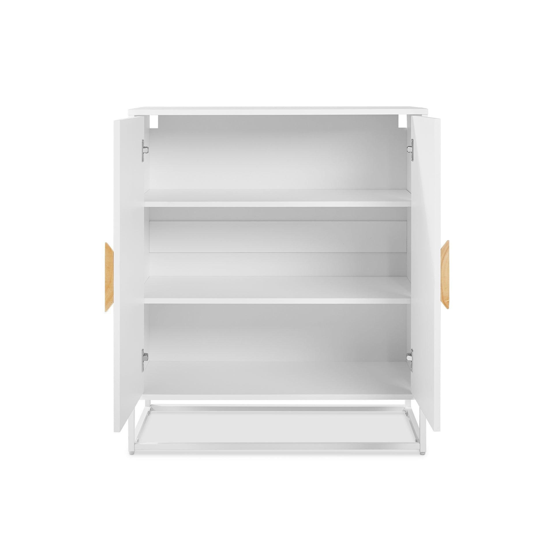 This alaska cabinet is one of our alaska range products and features a stylish minimalist design that will not only leave your home clutter-free, but with its clean-lined look, which looks stunning in any space. Made from high-quality materials and a powder-coated metal frame, it provides a strong base for years of use, while the open metal frame gives it an airy feel. Offering a simple double door design, this storage cabinet contains three spacious shelves inside, which provide you with a variety of storage options, while the unique solid wood rhombus handles make it a pleasure to use. No matter if you are storing shoes, hats and sundries in your entrance, keeping files in your home office or using it as a medium sized buffet in a restaurant, this double door storage cabinet is a perfect choice as it will help you keep items close but out of sight.