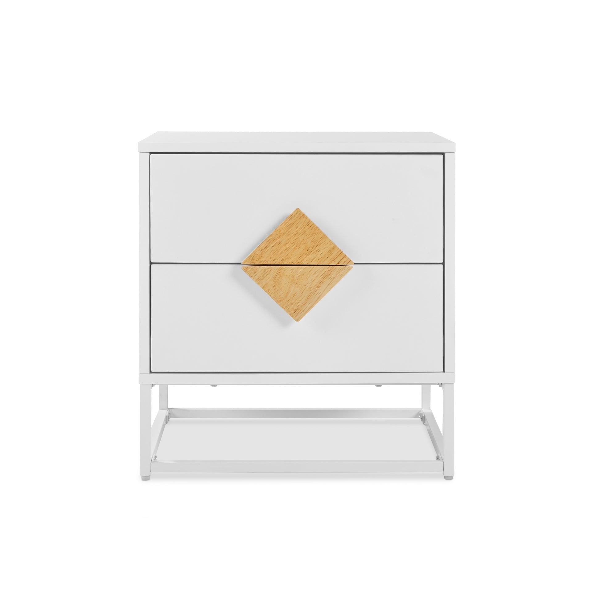 Drawing inspiration from Alaska's serene snowy landscapes, the ALASKA bedside table combines sleek design with functionality. Its white finish and metal frame reflect the natural beauty of snow-capped mountains, complemented by distinctive rhombus wood handles reminiscent of the morning sun.
