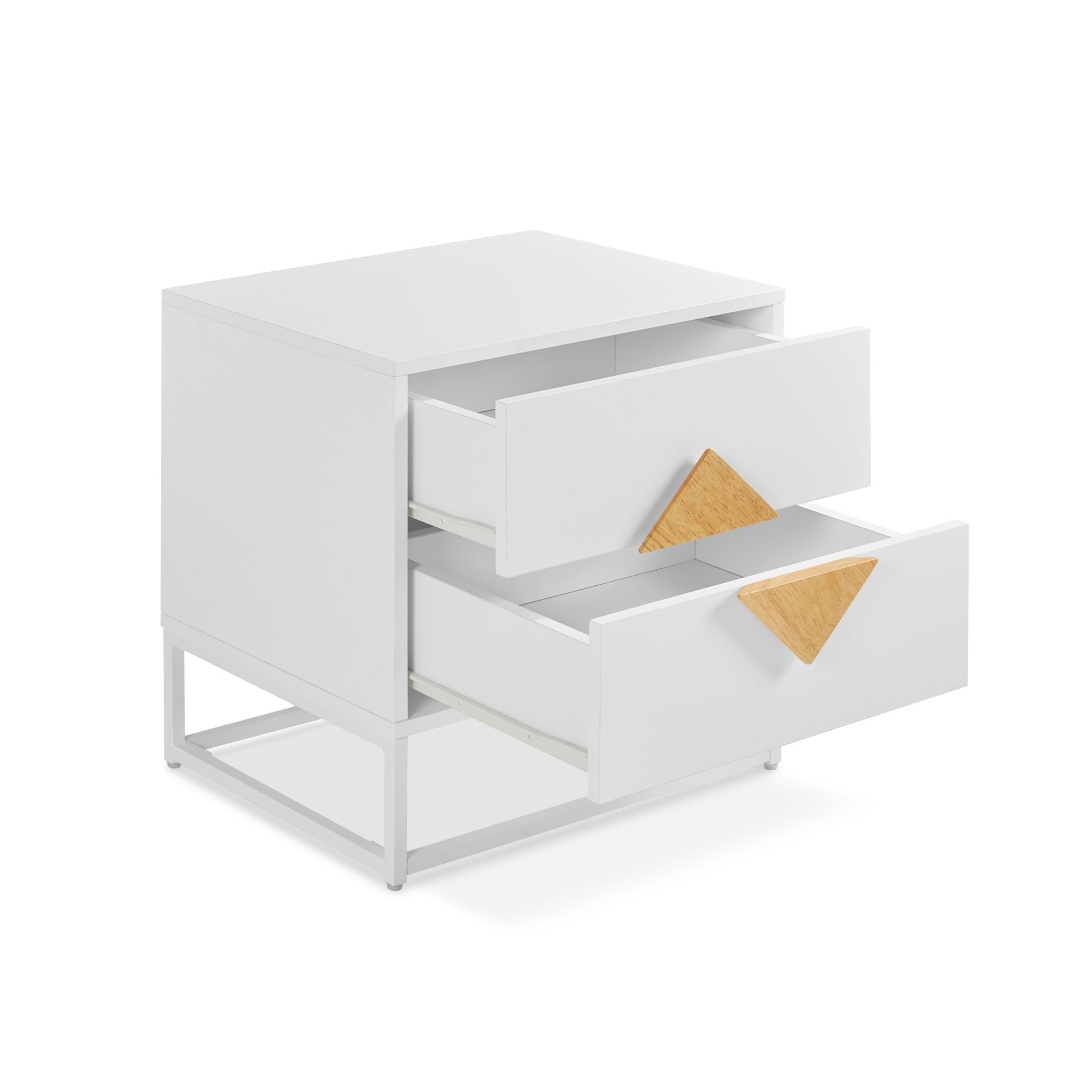 Crafted with a sturdy powder-coated metal frame, this nightstand offers lasting support and features two sliding drawers for discreet storage, keeping your bedroom clutter-free. The open frame design adds an airy feel and extra storage space, while the ample tabletop ensures your essentials are always within reach.