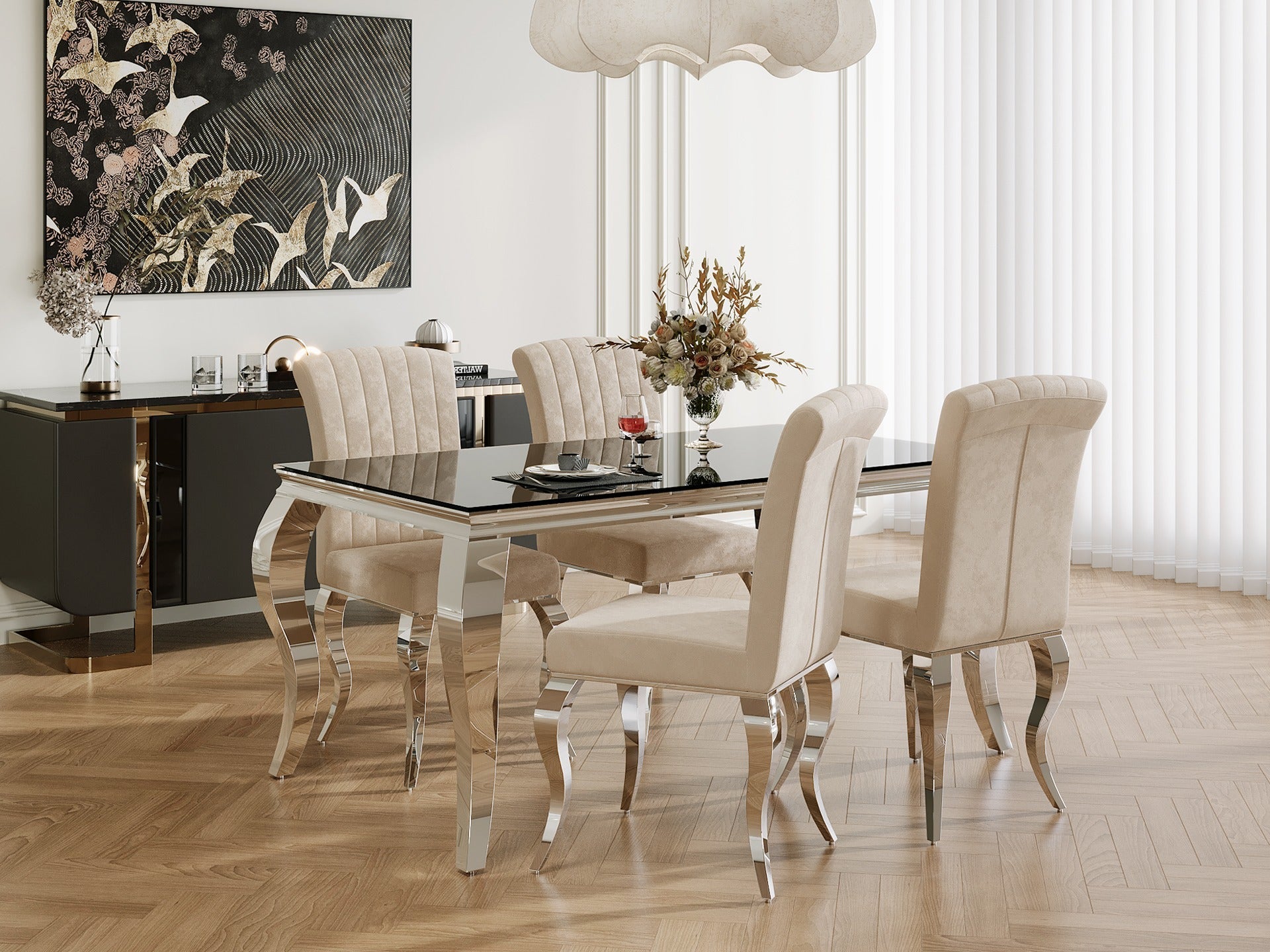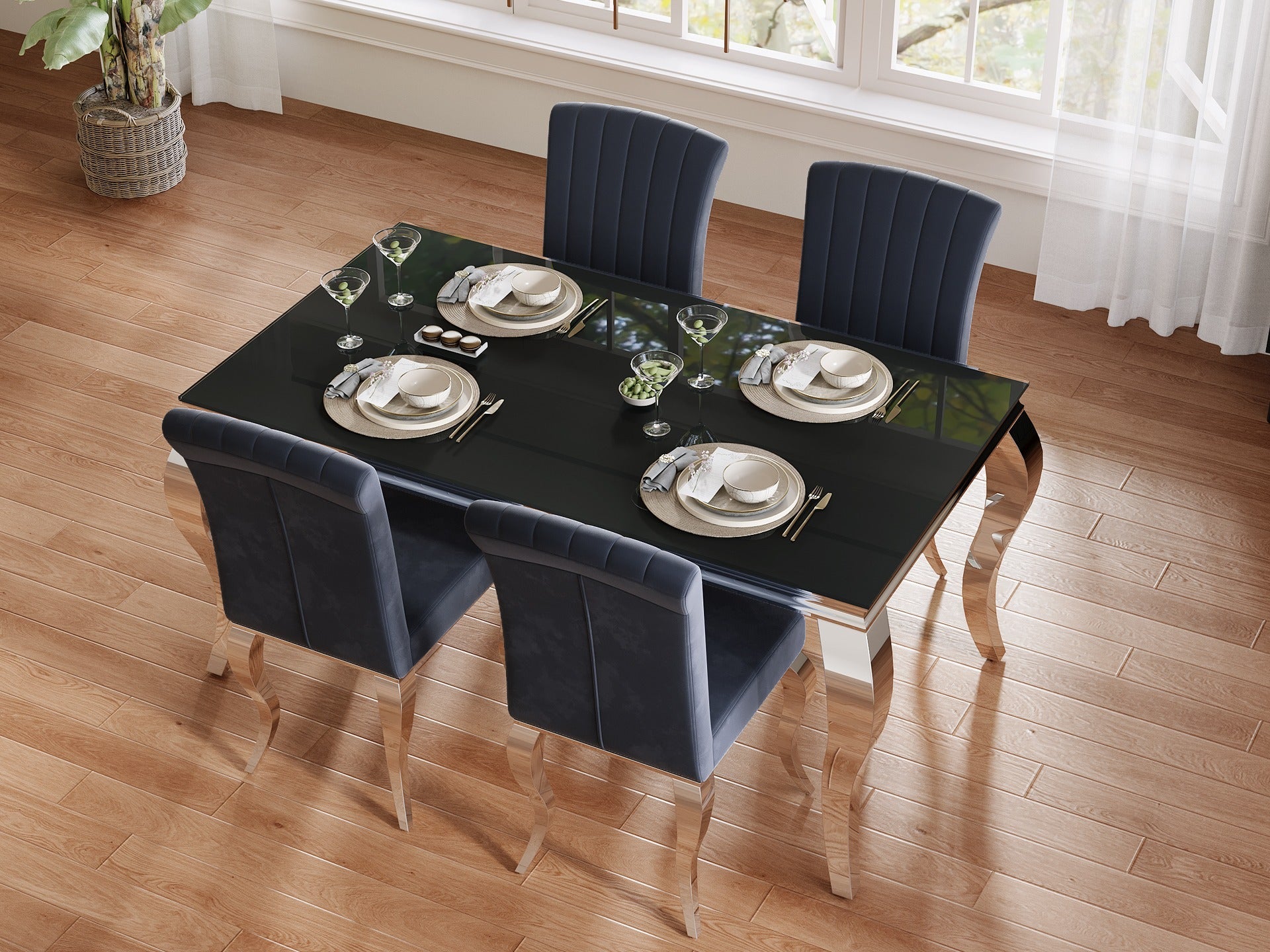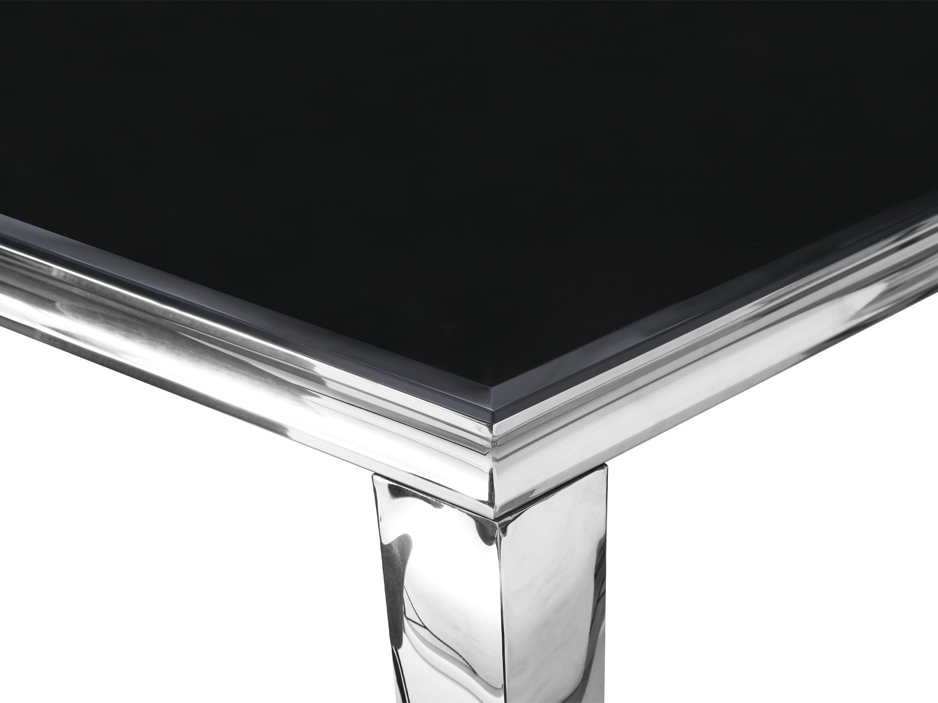 A sleek black tempered glass top and curved stainless-steel legs combine to form a striking dining table with bold lines and timeless charm. The 10mm thick tempered glass ensures strength and shine, bringing European glamour to modern dining spaces.