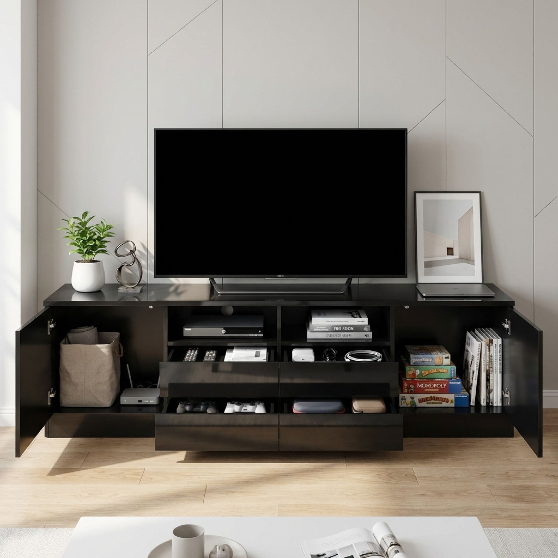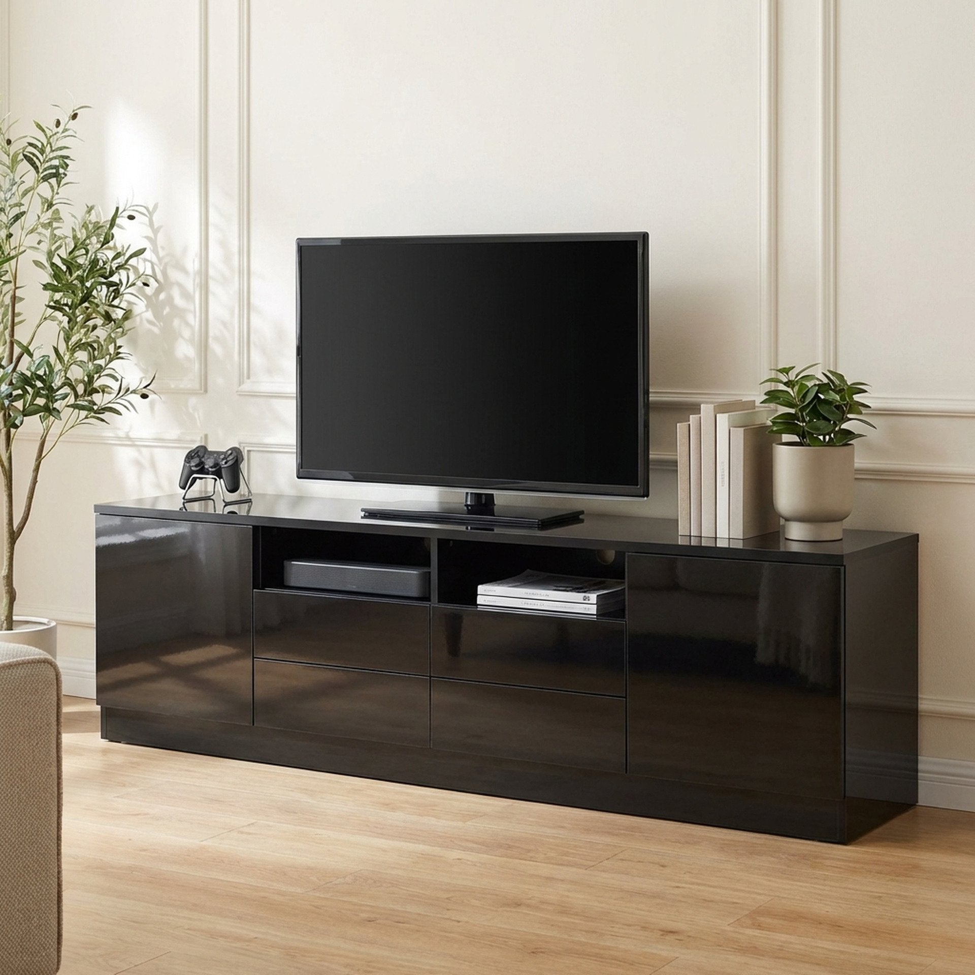 This Entertainment Unit features flat top for all kind of TV or media storage and other decorations such as vases and photos, also comes with 2 independent cabinets and 4 drawers allowing extra storage space for gaming consoles, headsets, DVDs and all sorts of accessories and the open shelves provide storage for all your home essentials; while hinged cabinets with handle-free design enhancing your elegant taste; made of high quality particle board with a smooth melamine finish for easy maintenance and cleaning which is durable and sturdy, while the front high gloss finish gives an elegant look that will suit any décor. It is not only a TV cabinet, but also a decoration for your home living room and will deliver a modern and elegant style to your home.
