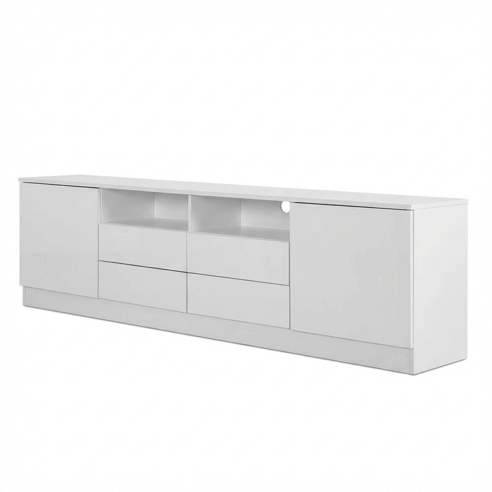 This Entertainment Unit features flat top for all kind of TV or media storage and other decorations such as vases and photos, also comes with 2 independent cabinets and 4 drawers allowing extra storage space for gaming consoles, headsets, DVDs and all sorts of accessories and the open shelves provide storage for all your home essentials; while hinged cabinets with handle-free design enhancing your elegant taste; made of high quality particle board with a smooth melamine finish for easy maintenance and cleaning which is durable and sturdy, while the front high gloss finish gives an elegant look that will suit any décor. It is not only a TV cabinet, but also a decoration for your home living room and will deliver a modern and elegant style to your home.