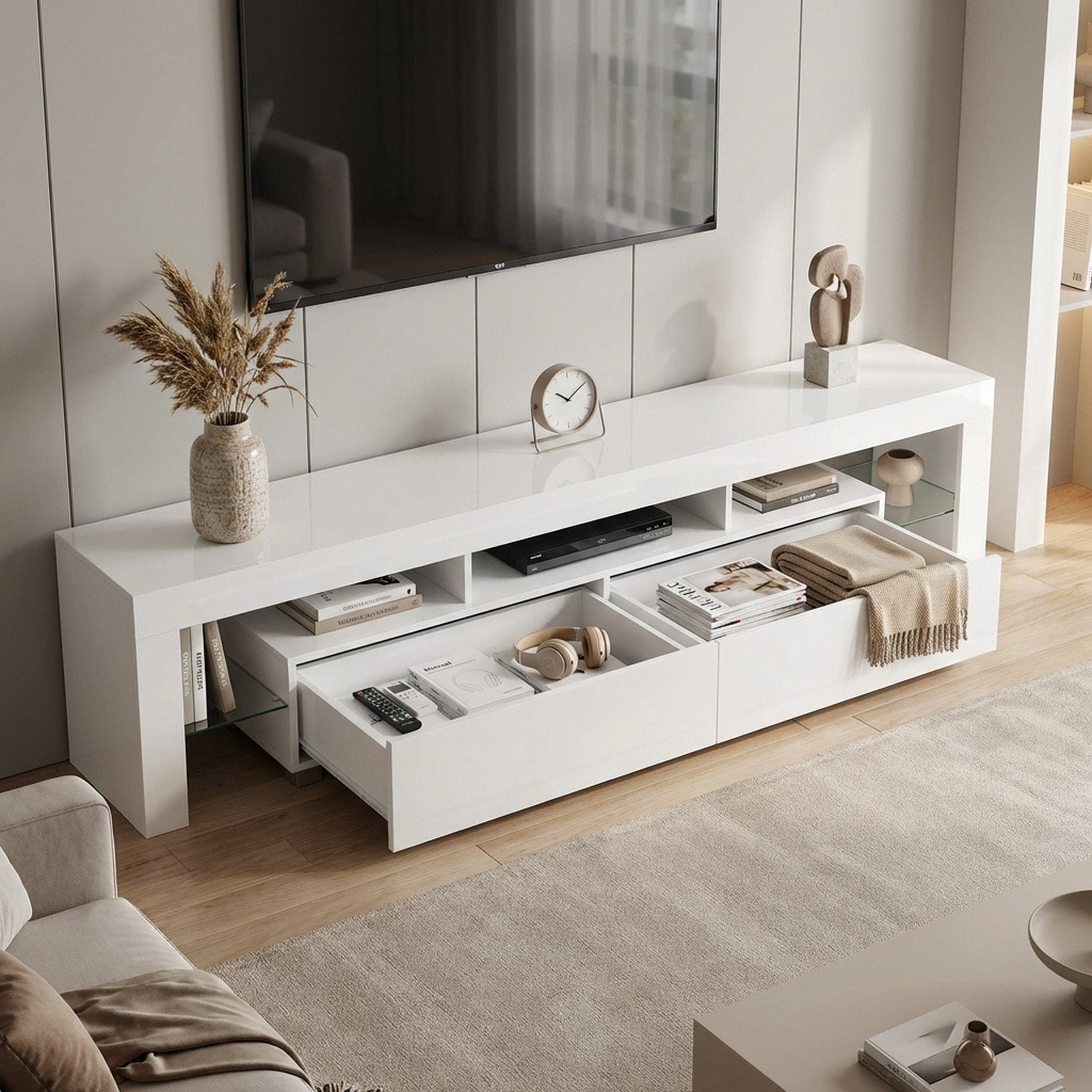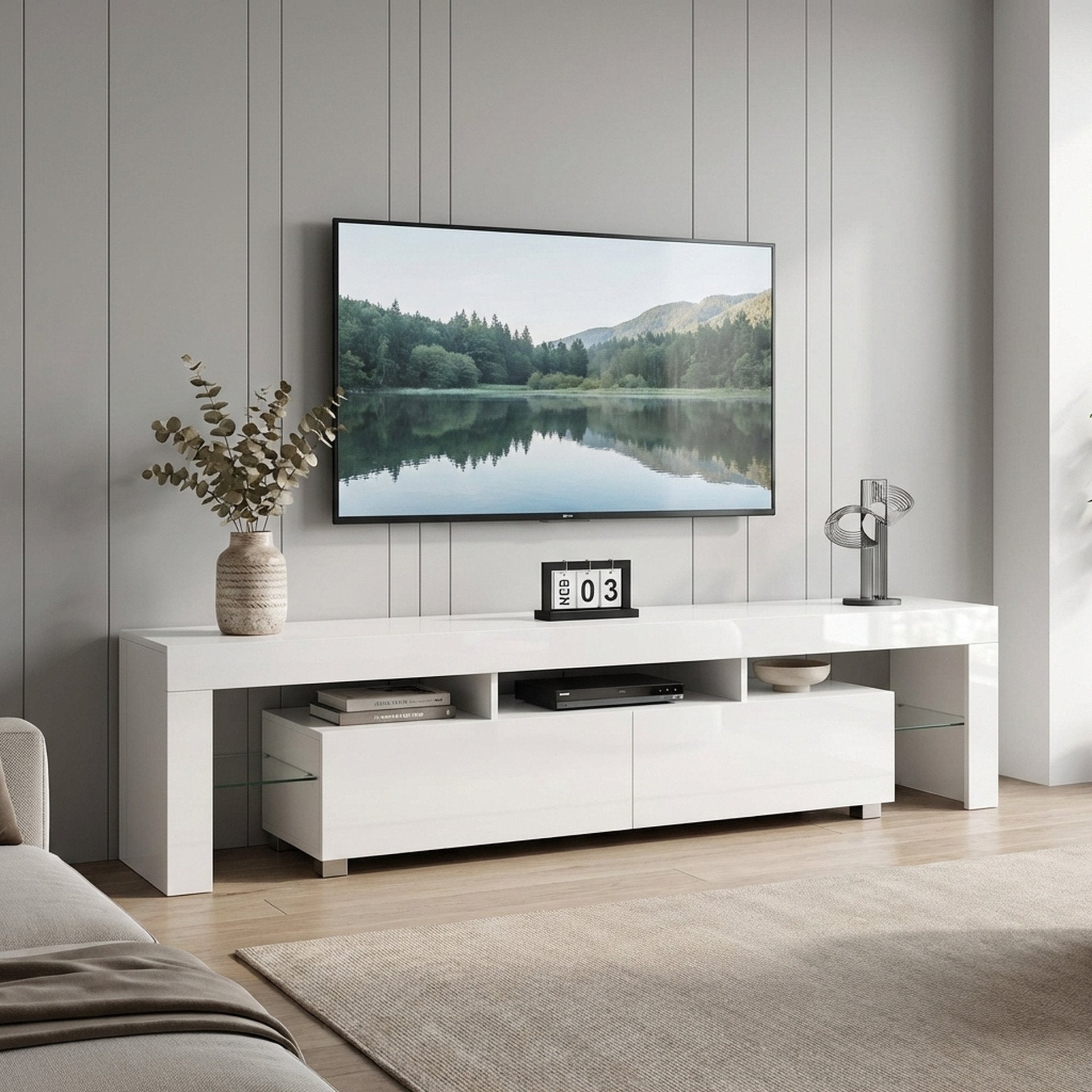 Made of high quality particle board with a smooth melamine finish, the sturdy construction of this ARVADA Entertainment Unit is durable and the UV high gloss finish and tempered glass gives the entertainment unit a modern look to anchor to your space; features the flat top for all kind of TV or media storage and other decorations such as vases and photos, also comes with 2 independent drawers give ample room to stow your favourite DVDs and other media accessories, while the open shelves are designed to hold media consoles and all your home essentials; equipped with LED lights which will make your room more fashionable, modern and background wall brighter. Order this entertainment unit now to entertain yourself, your family and friends. The new update of the entertainment unit with a thicker board that look sturdy is thicker and stronger for use.
