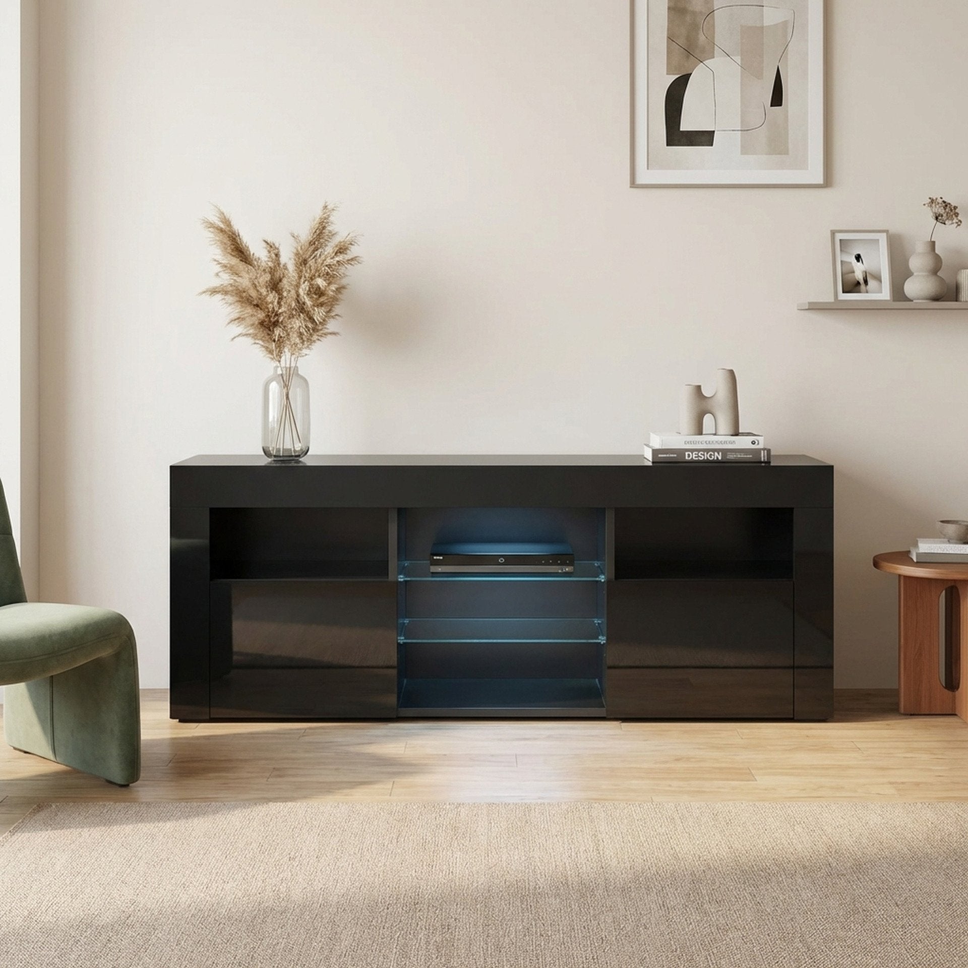 This Entertainment Unit features flat top for all kind of TV or media storage, also comes with 2 independent cabinets and 5 open shelves allowing extra storage space for gaming consoles, headsets, DVDs and all sorts of accessories and other decorations such as vases and photos; while the handle-free design of drawers that maintain a sleek appearance for home decor; equipped with LED lights which will make your room more fashionable, modern and background wall brighter; made of high quality particle board with a smooth melamine finish for easy maintenance and cleaning which is durable and sturdy; while the UV high gloss finish and tempered glass give the entertainment unit a modern look to anchor to your space.