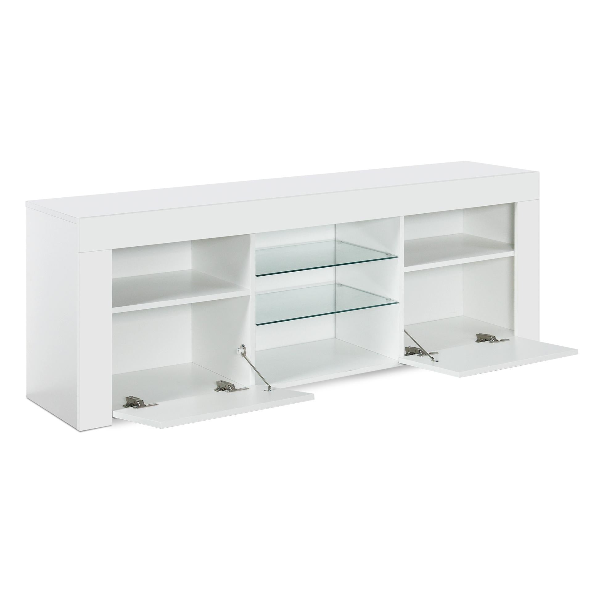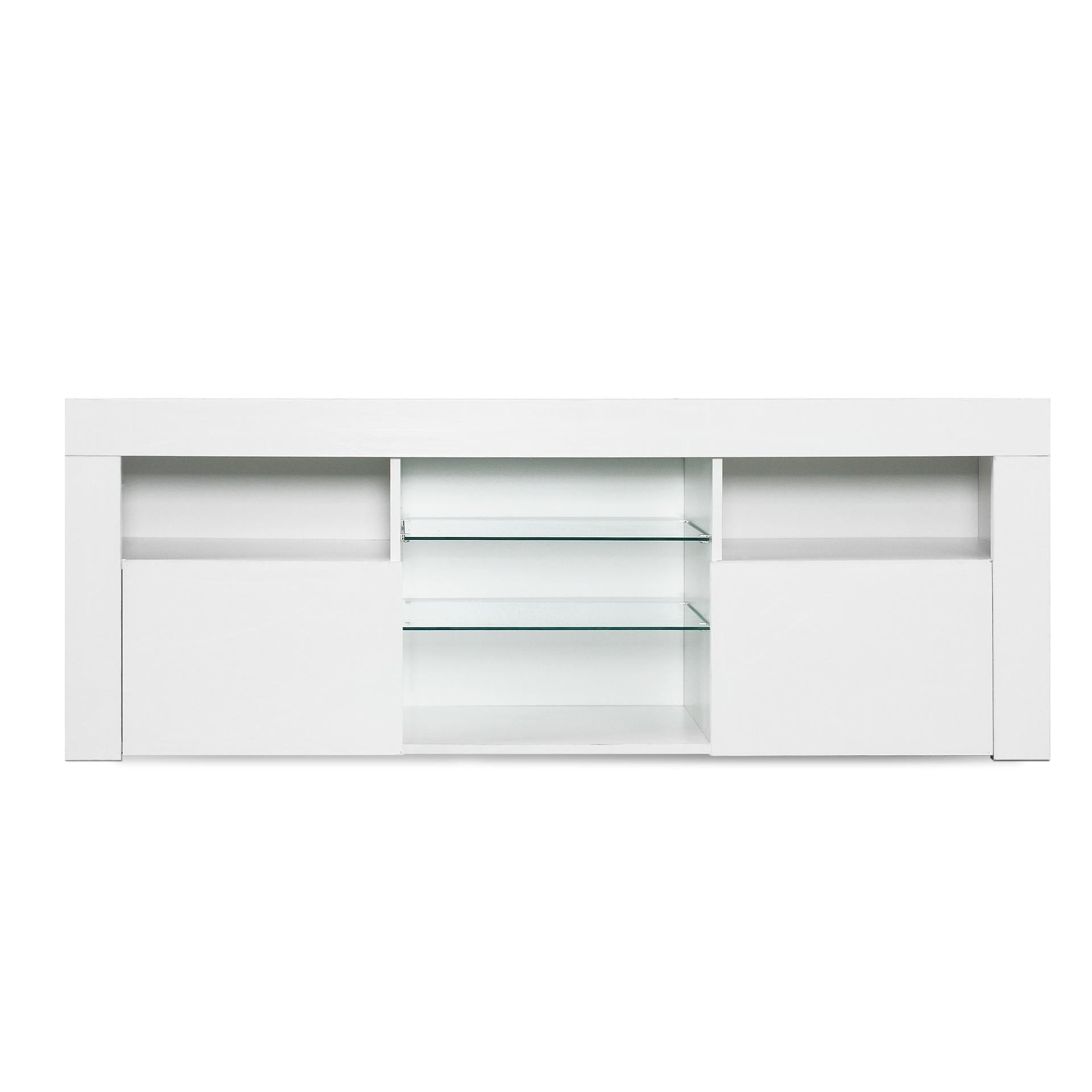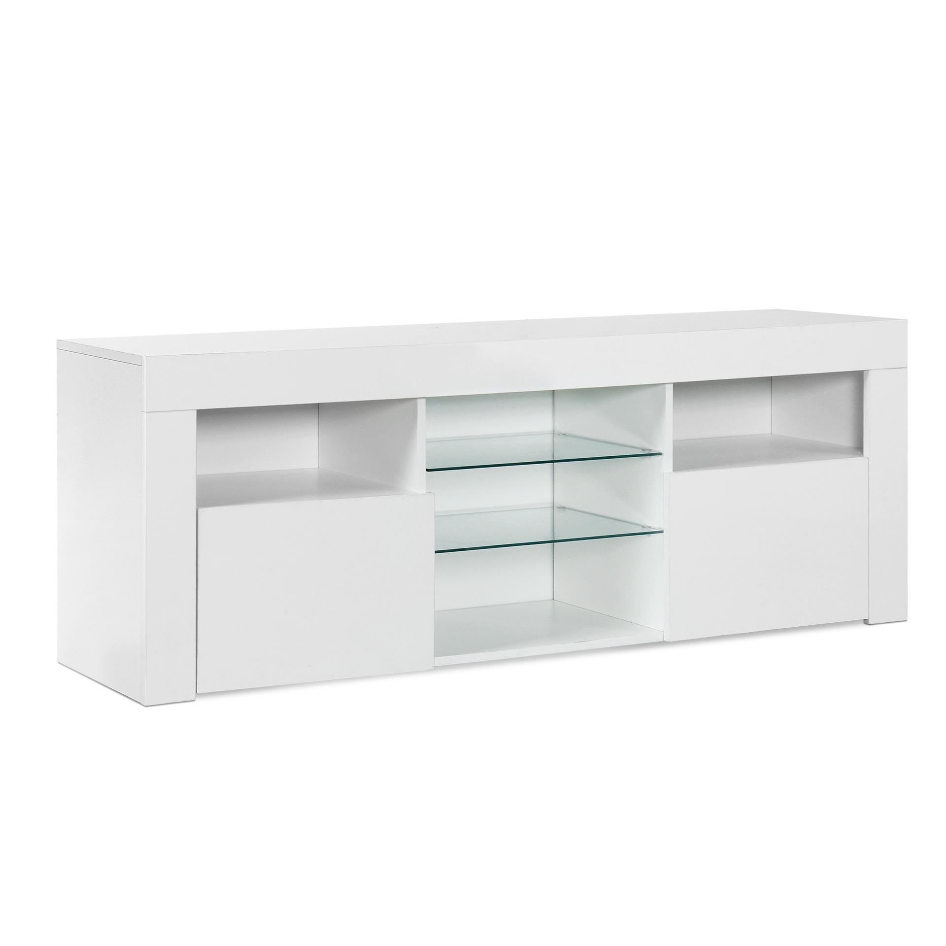 This Entertainment Unit features flat top for all kind of TV or media storage, also comes with 2 independent cabinets and 5 open shelves allowing extra storage space for gaming consoles, headsets, DVDs and all sorts of accessories and other decorations such as vases and photos; while the handle-free design of drawers that maintain a sleek appearance for home decor; equipped with LED lights which will make your room more fashionable, modern and background wall brighter; made of high quality particle board with a smooth melamine finish for easy maintenance and cleaning which is durable and sturdy; while the UV high gloss finish and tempered glass give the entertainment unit a modern look to anchor to your space.