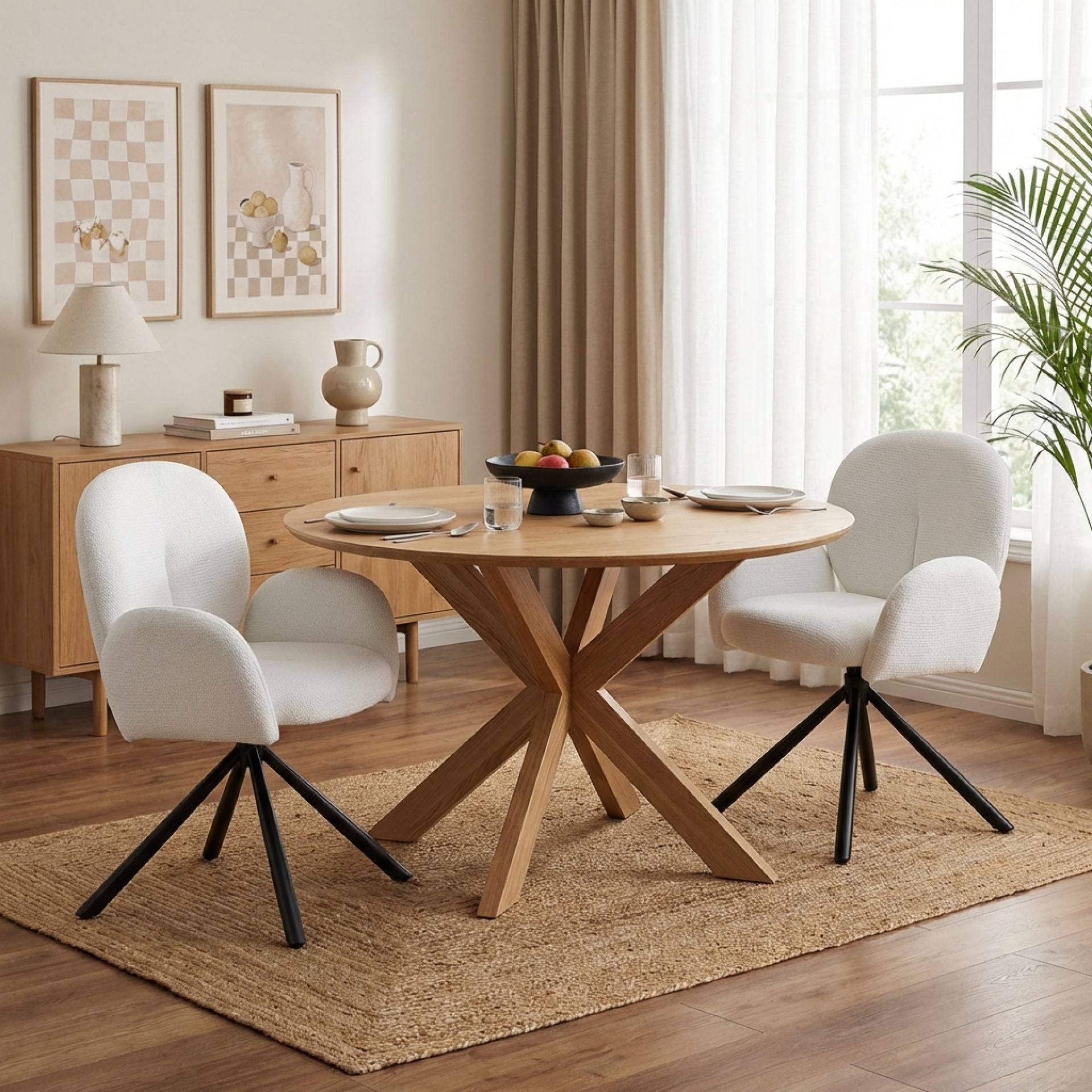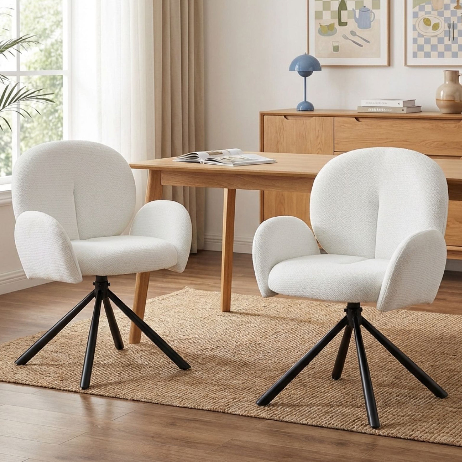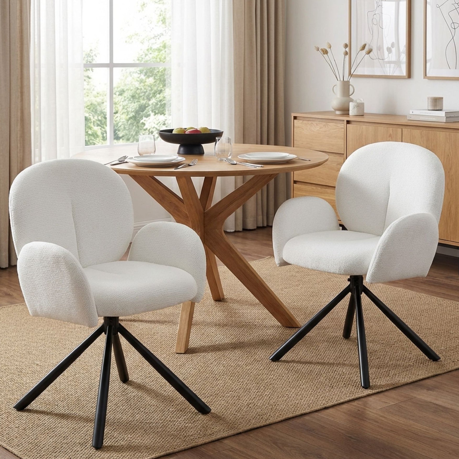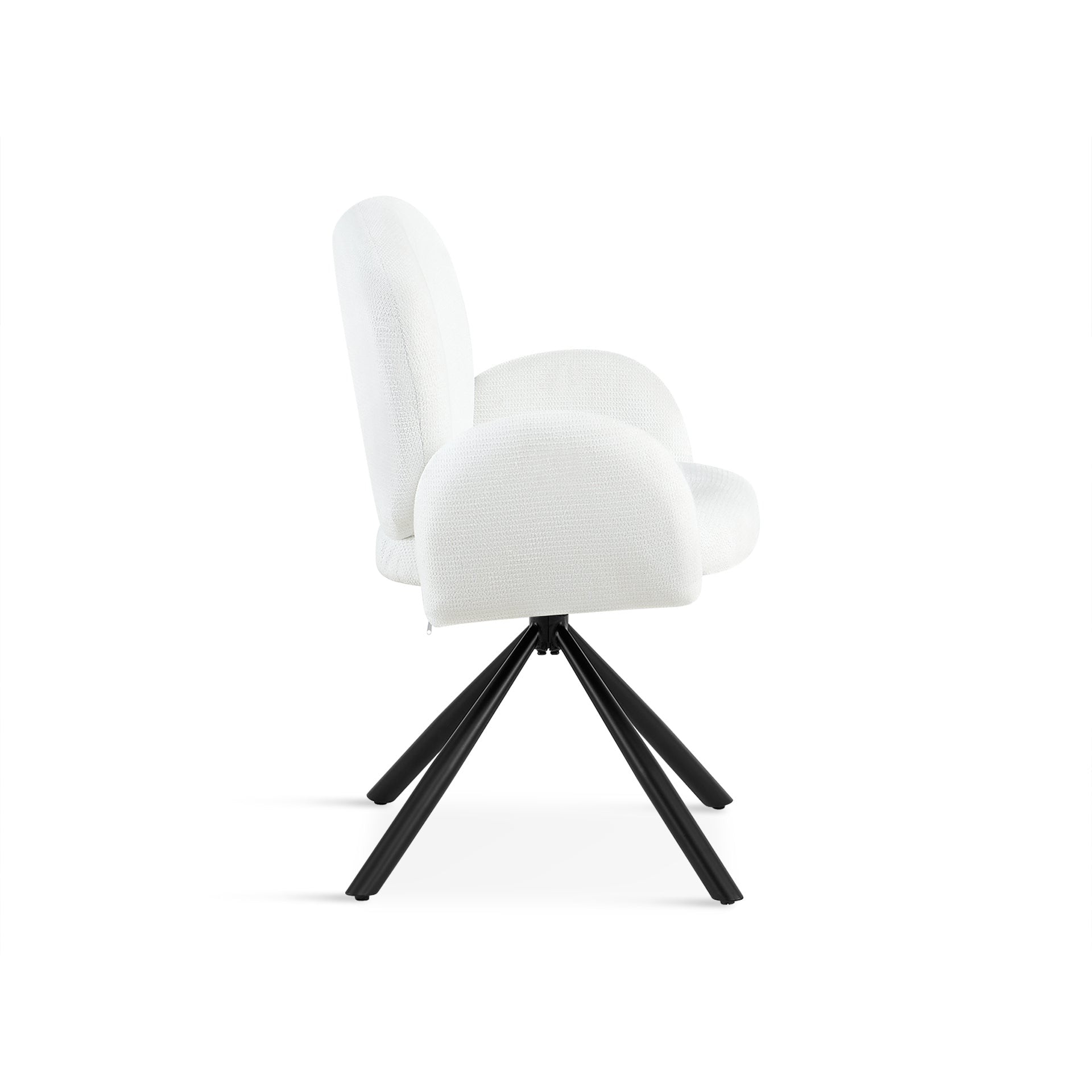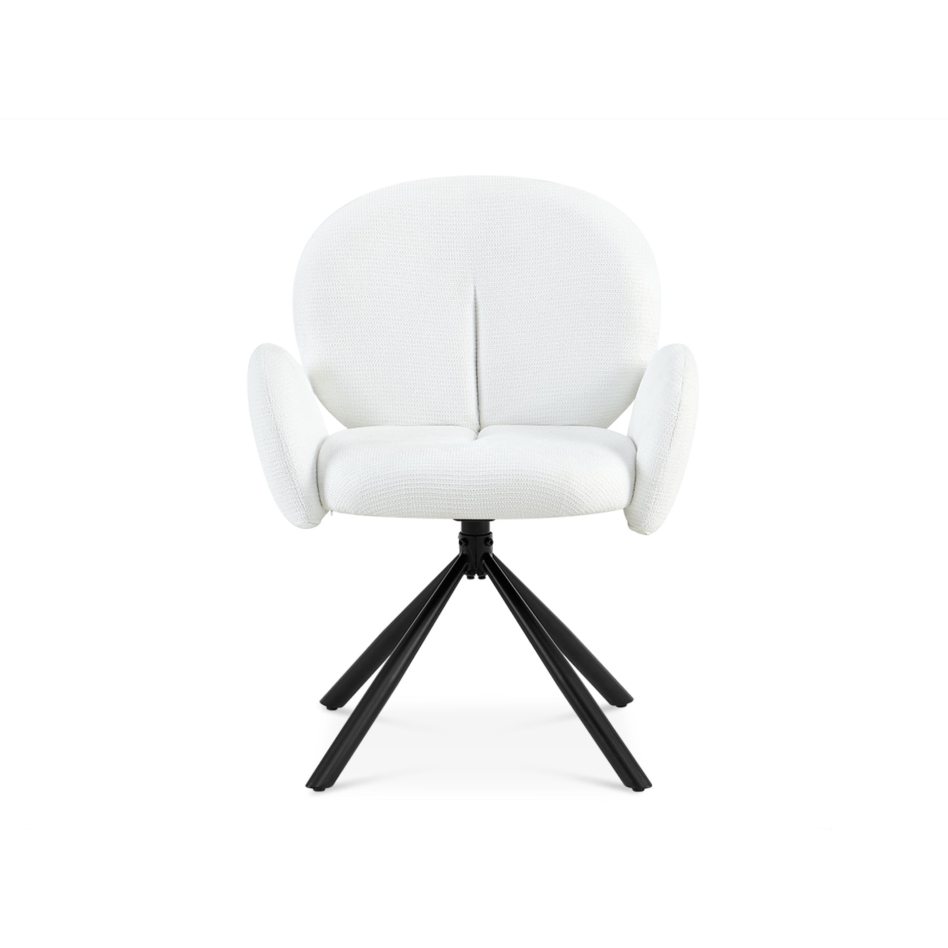The Avery Dining Chair blends functionality with elegance. Its X-shaped black powder-coated legs provide stability, while the 180° auto-return swivel enhances usability. Thick padding on the armrests, seat, and backrest ensures comfort, making it a modern choice for any dining or casual space.