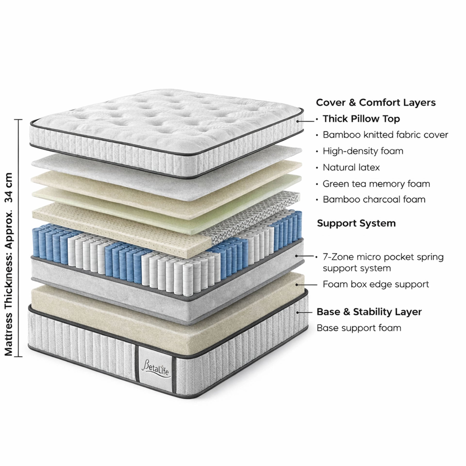 - Comfort Layers: High Density Foam, Latex Foam, Green Tea Memory Foam, Bamboo Charcoal Foam