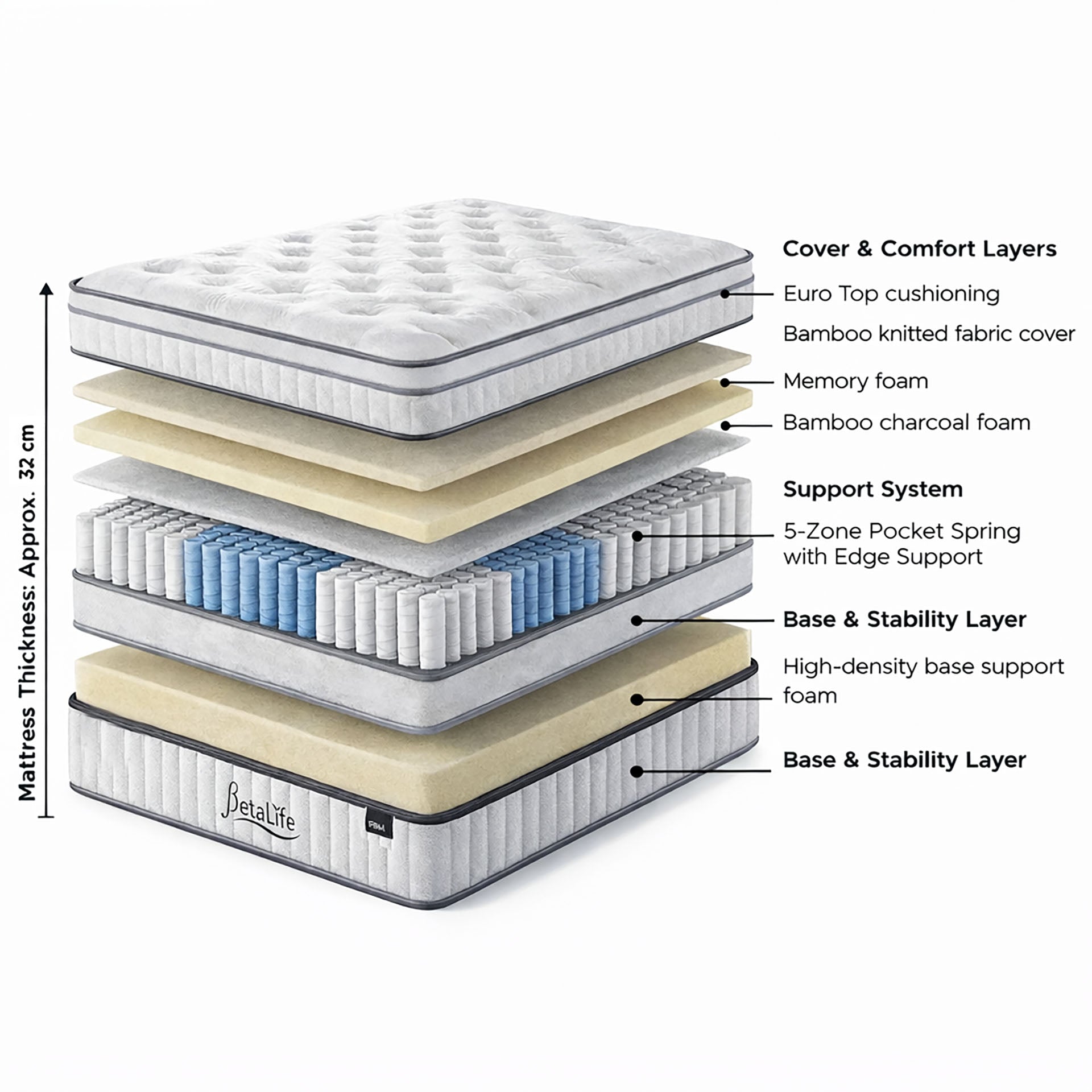 Engineered for superior support, the mattress features a 5-zoned pocket spring system with foam box for added stability. Layers of bamboo charcoal foam and green tea memory foam offer enhanced durability and adaptive support, promoting a restful night’s sleep.