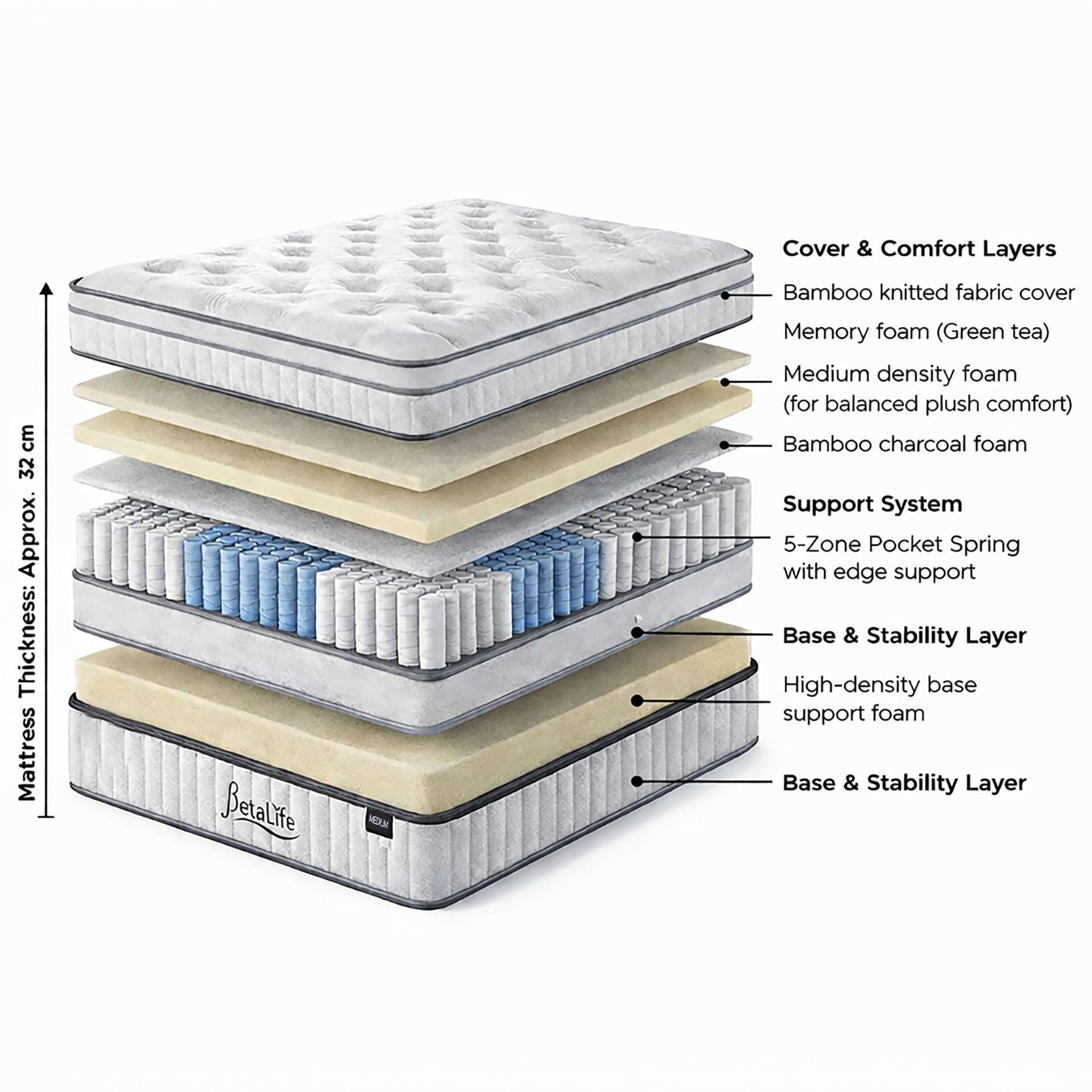 - Mattress Technology: Green Tea Memory Foam, Bamboo Charcoal Foam, Pocket Coil