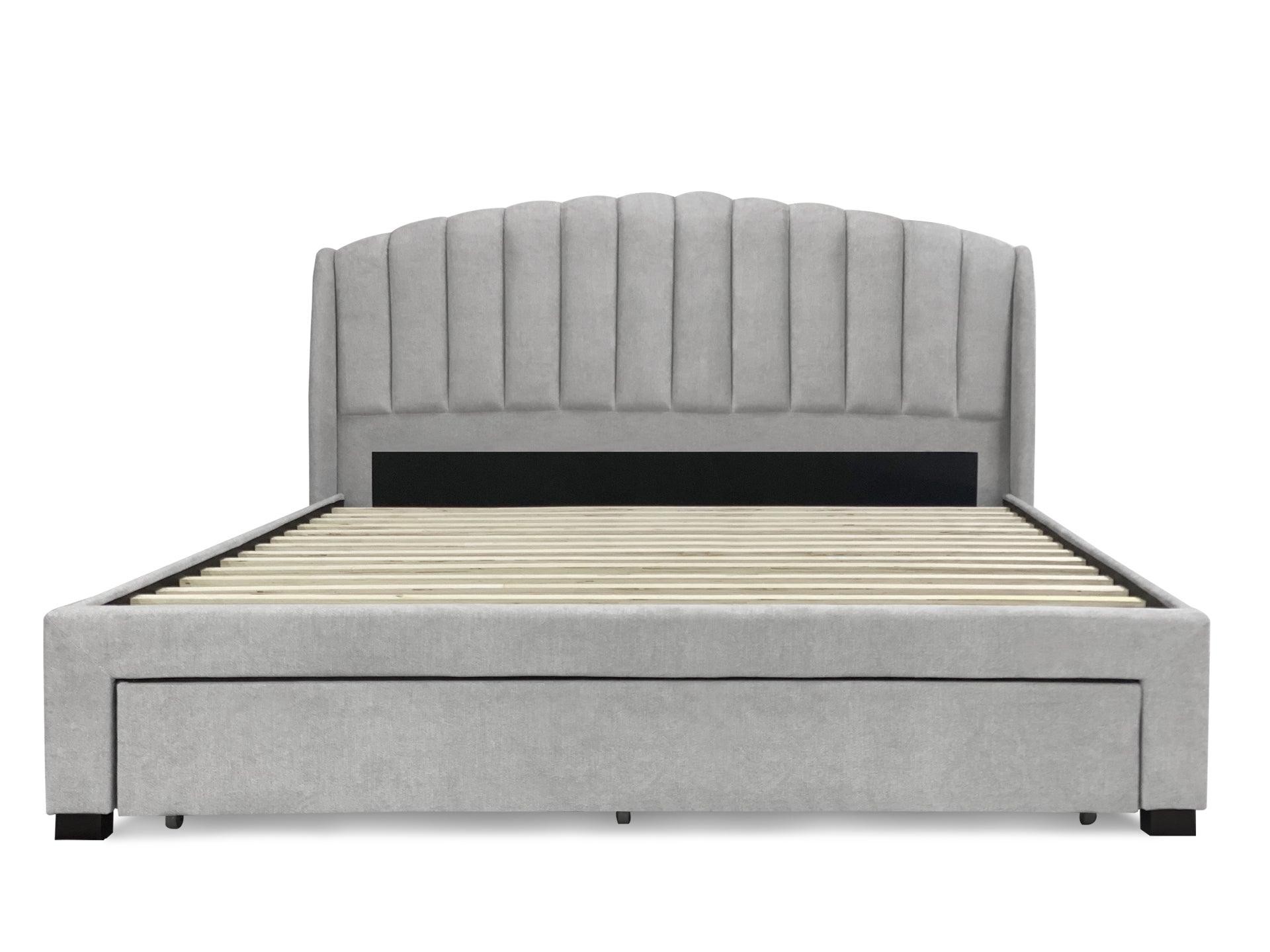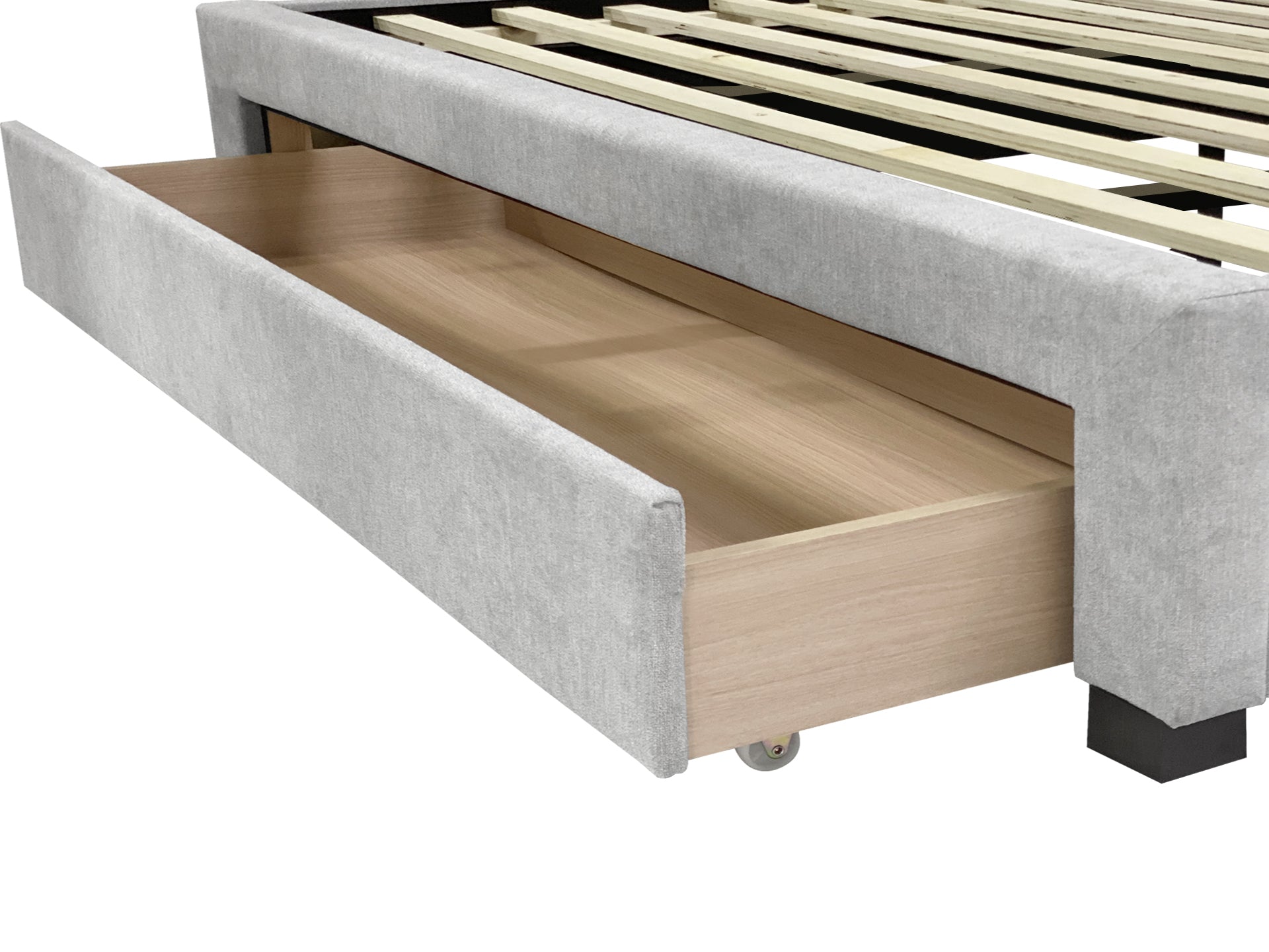 - One large sliding storage drawer on wheels at the end of the bed