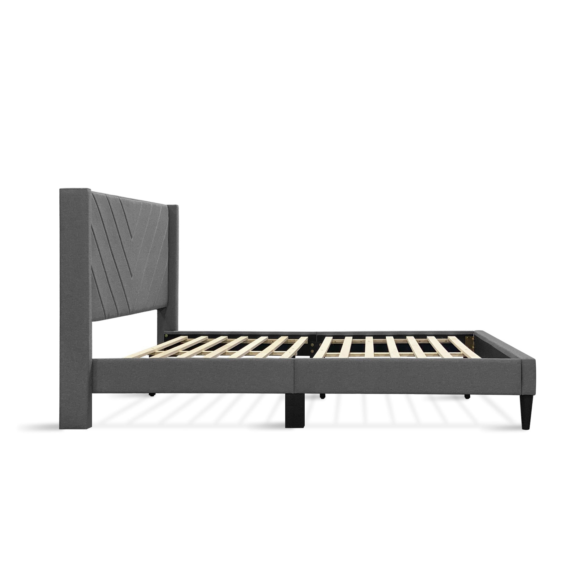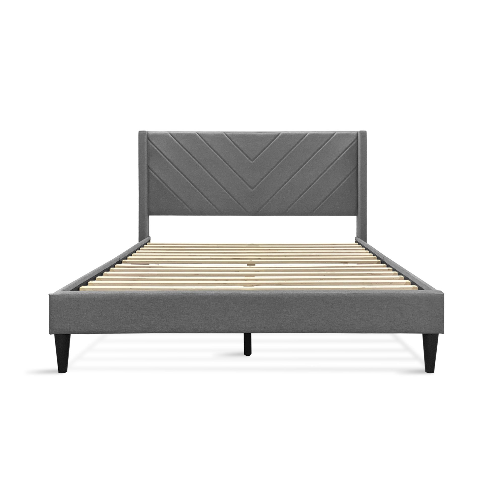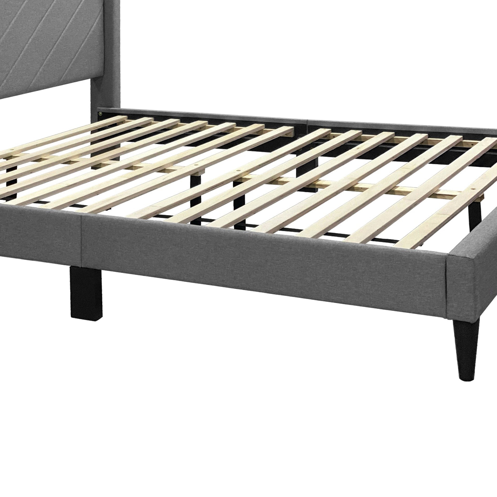 - Material: Fabric upholstery/Wooden flat slats/Plastic legs