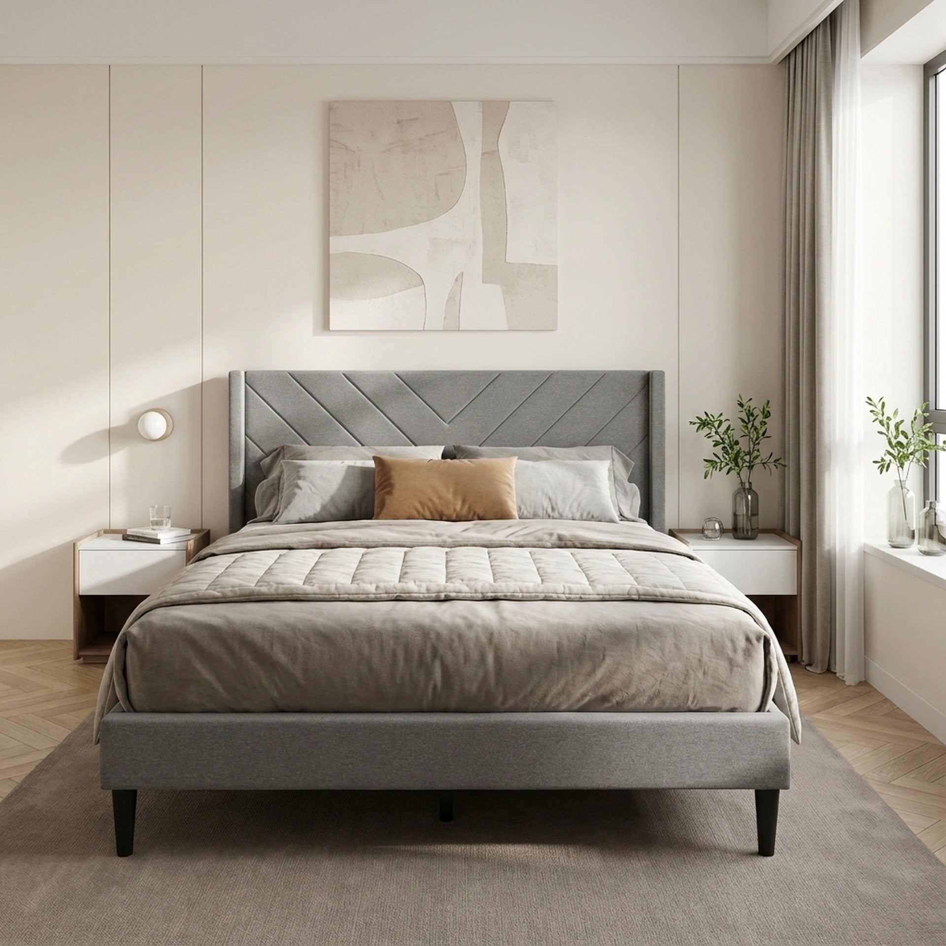 - Headboard features minimalist lines for a modern aesthetic