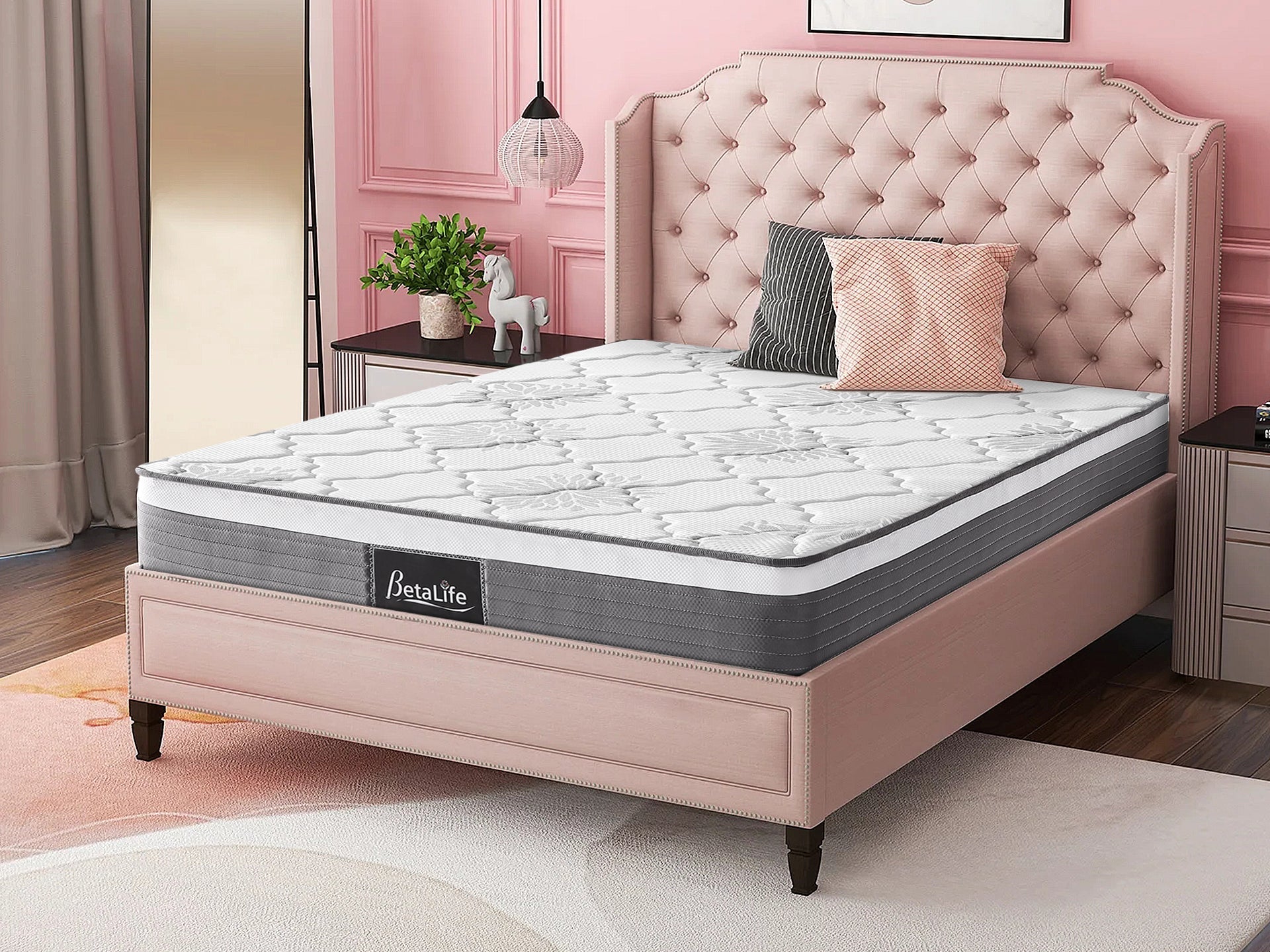 This mattress features a 5-zone pocket spring mechanism, providing targeted bounce in different areas of the mattress. Its luxurious breathable air mesh fabric is quilted with antibacterial fabric and foam on top for protection against dust mites and allergies. Furthermore, it includes reinforced edge support on the sides of mattress for added mattress stability. BetaLife's mattress offers an extra layer of comfort, delivering the beloved luxury feel our customers cherish.