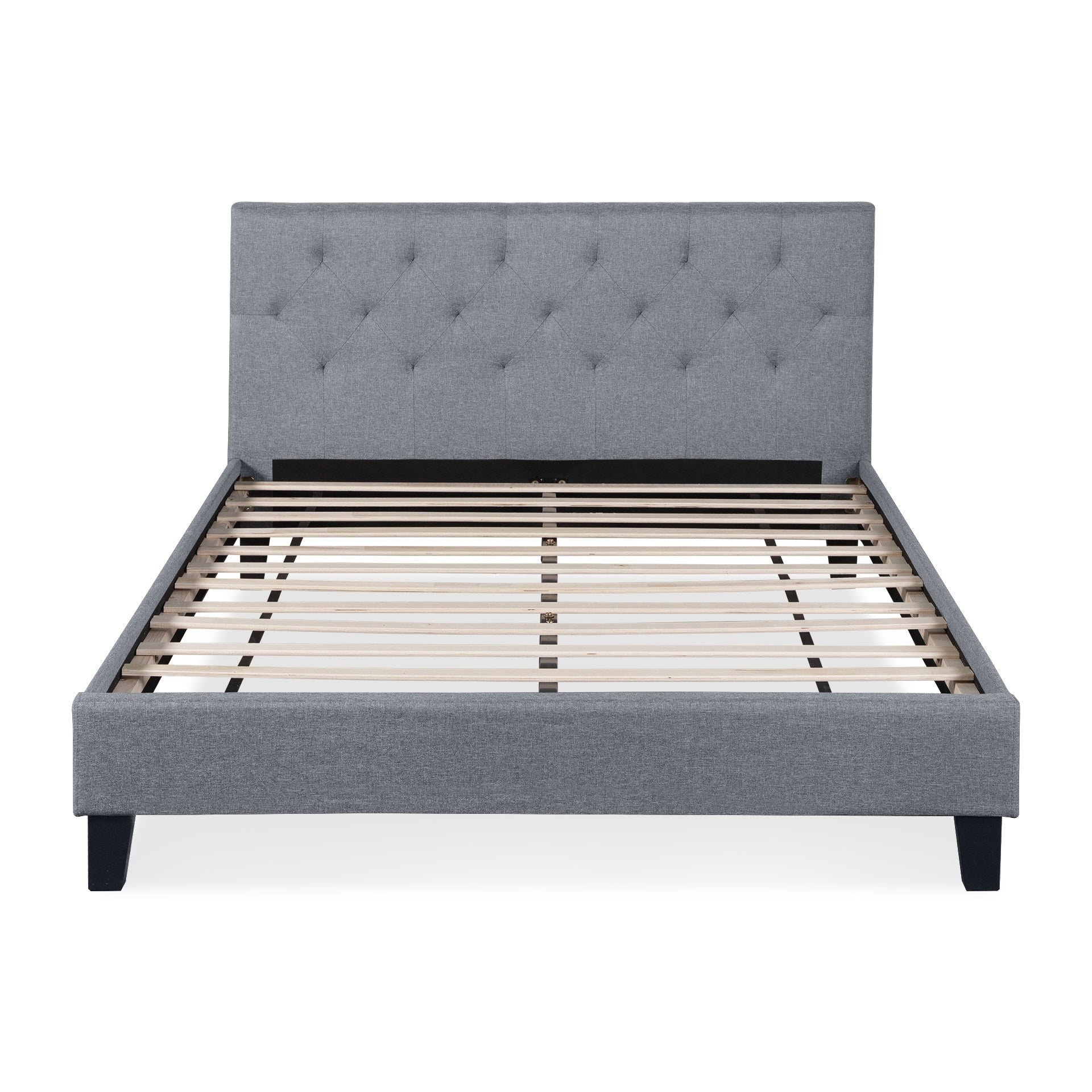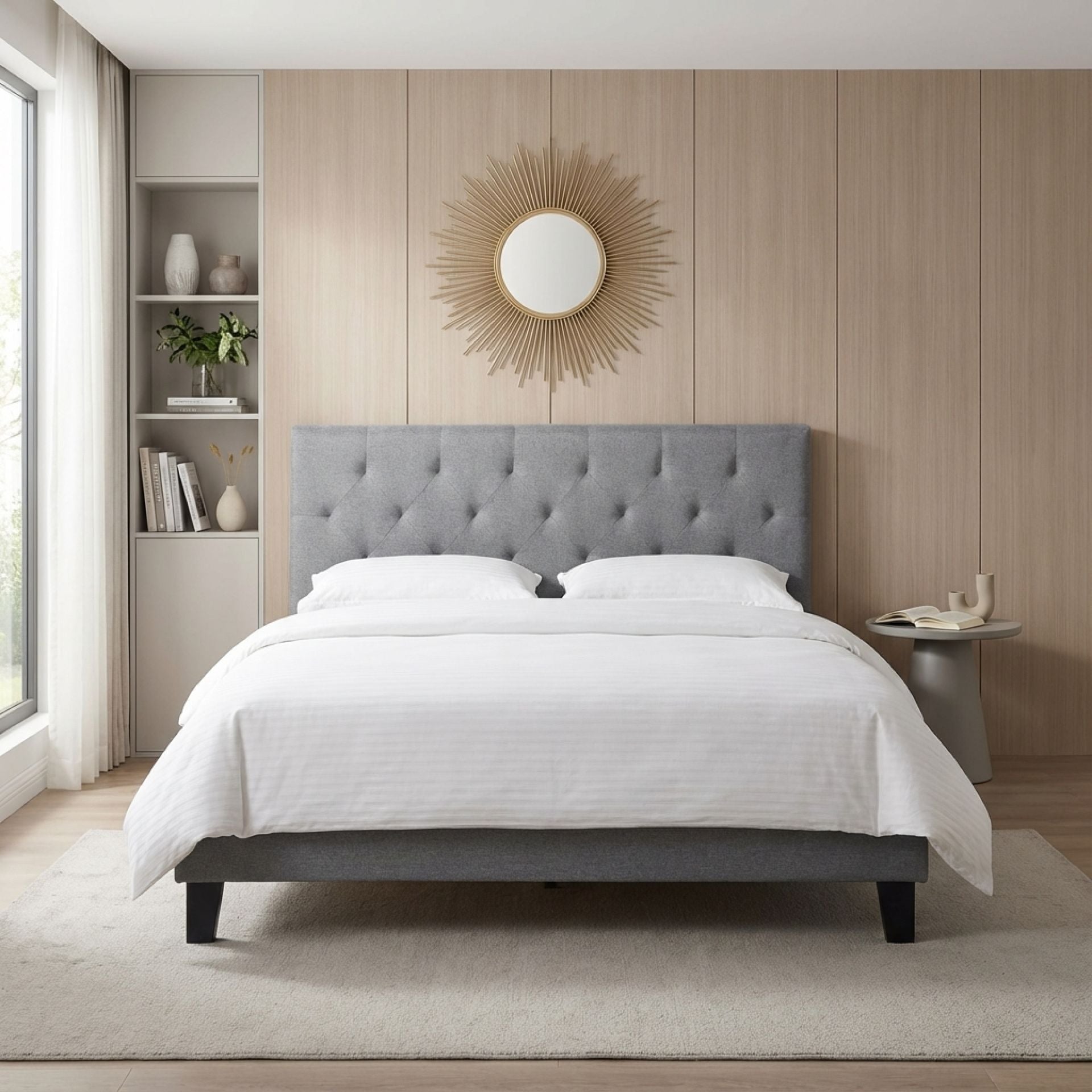 Built on a solid and manufactured wood slat base, this bed offers exceptional stability for a restful night's sleep. It not only enhances the lifespan of your mattress but also provides essential support to distribute weight evenly. The headboard features a refined tufted pattern and is generously padded with high-density foam, ensuring superior softness and comfort, while adding a touch of glamour to your suite. The neutral grey fabric adds warmth and welcoming vibes to your room.
