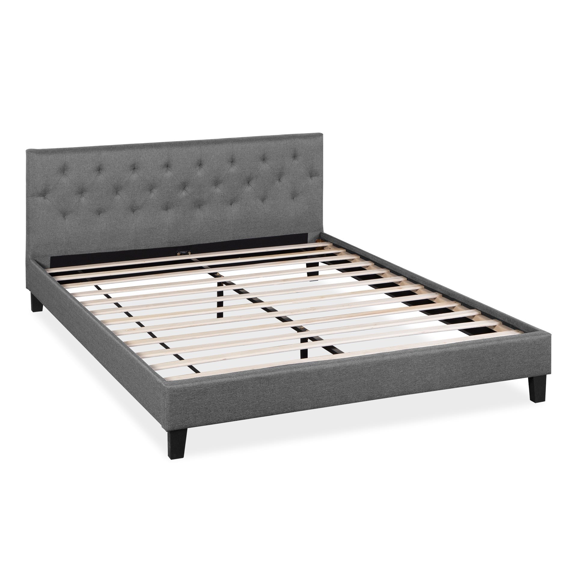 Founded on a solid and manufactured wood slat base, this bed provides a great foundation to make your night comfortable. It also help in extending the lifetime of your expensive mattress and act as a support to absorb all the weight and stress. The headboard with an elegant tufted pattern and padded with high density foam to offer enhanced softness and comfort and add a glamour look to your suite. Its neutral dark grey fabric will bring warmth to your space and will make it more welcoming than ever while the trendy legs complete the timeless look of this comfortable masterpiece.