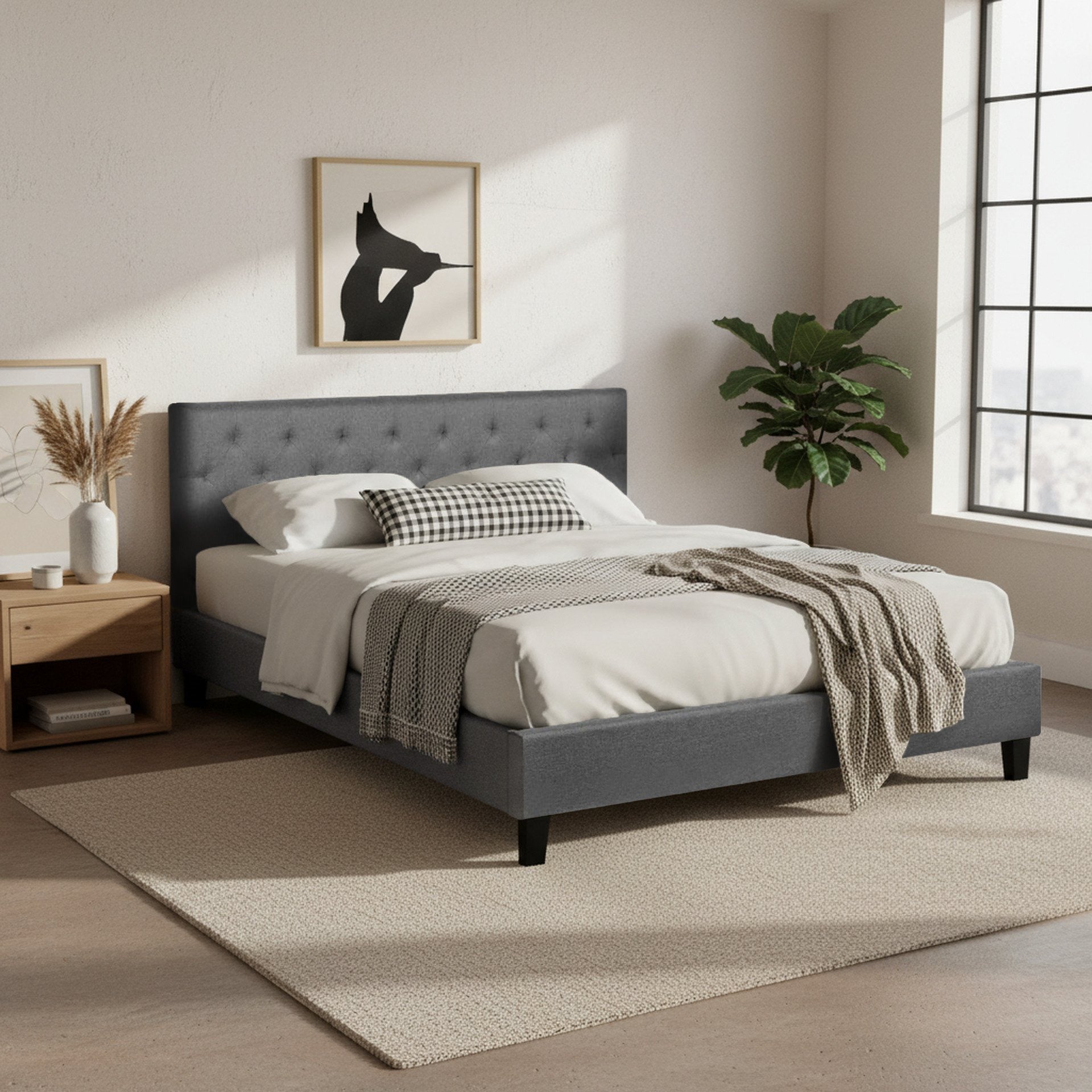 - Button tufted headboard padded with high density foam