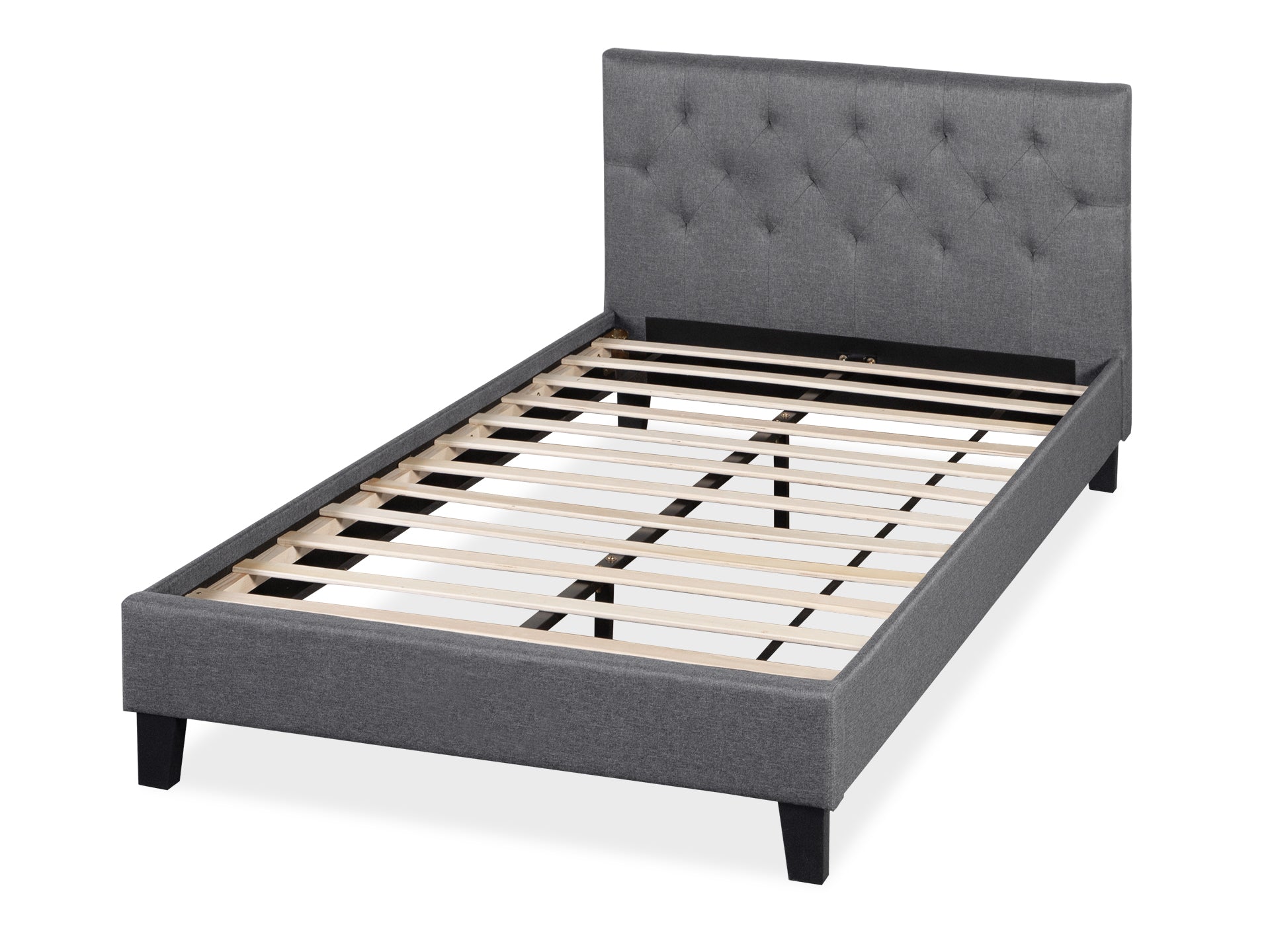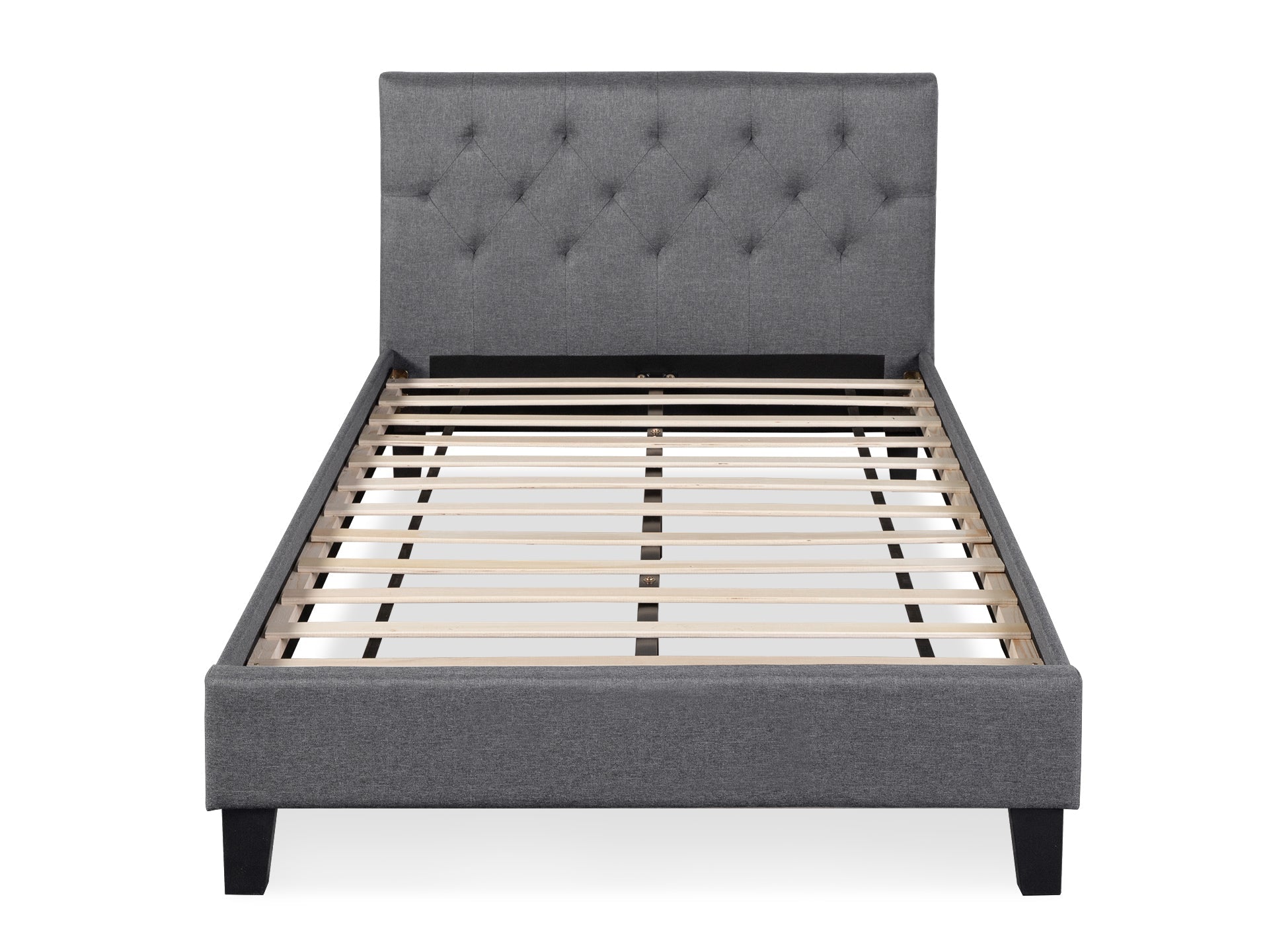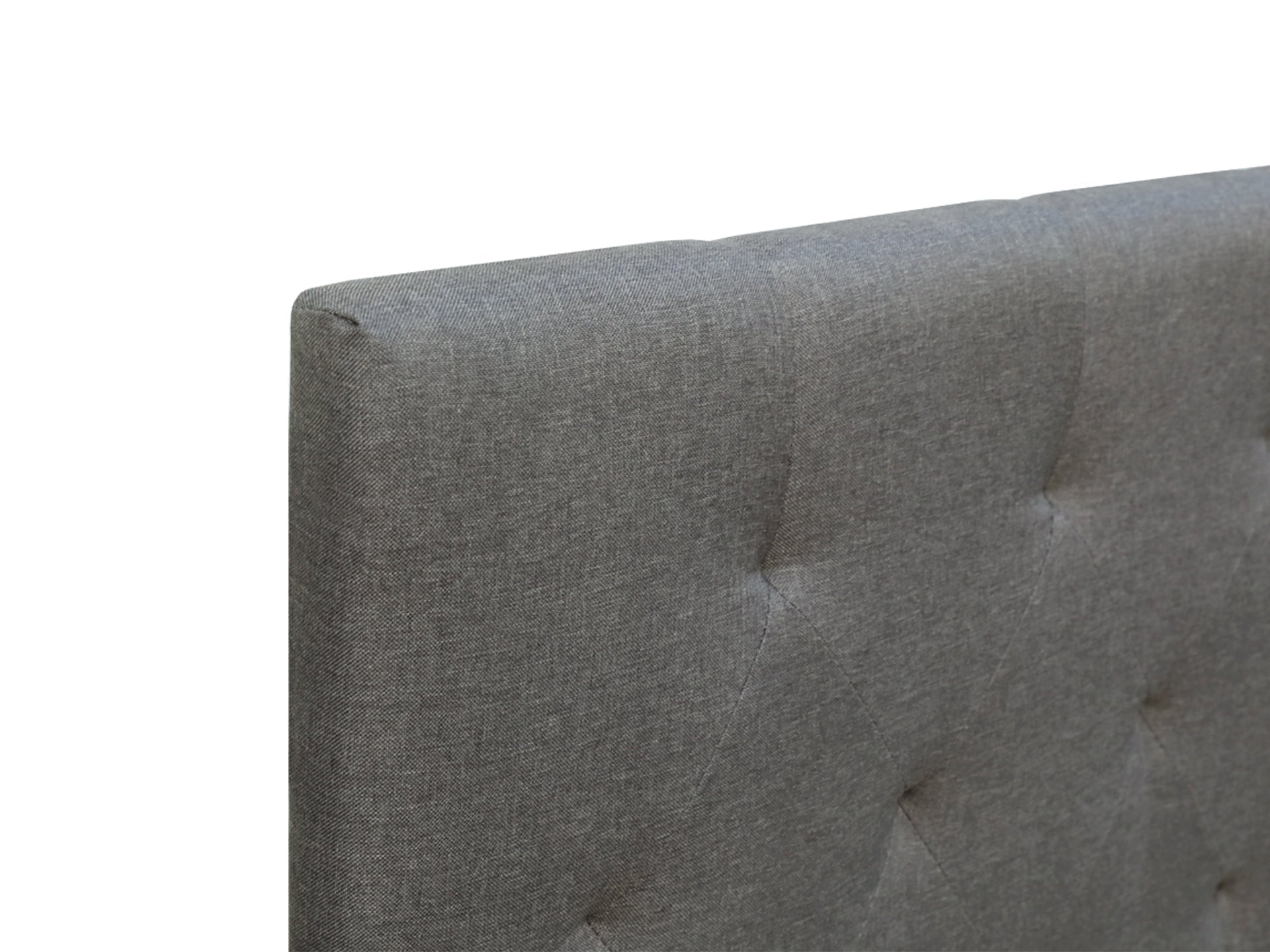 Built on a solid and manufactured wood slat base, this bed offers exceptional stability for a restful night's sleep. It not only enhances the lifespan of your mattress but also provides essential support to distribute weight evenly. The headboard features a refined tufted pattern and is generously padded with high-density foam, ensuring superior softness and comfort, while adding a touch of glamour to your suite. The neutral dark grey fabric adds warmth and welcoming vibes to your room.