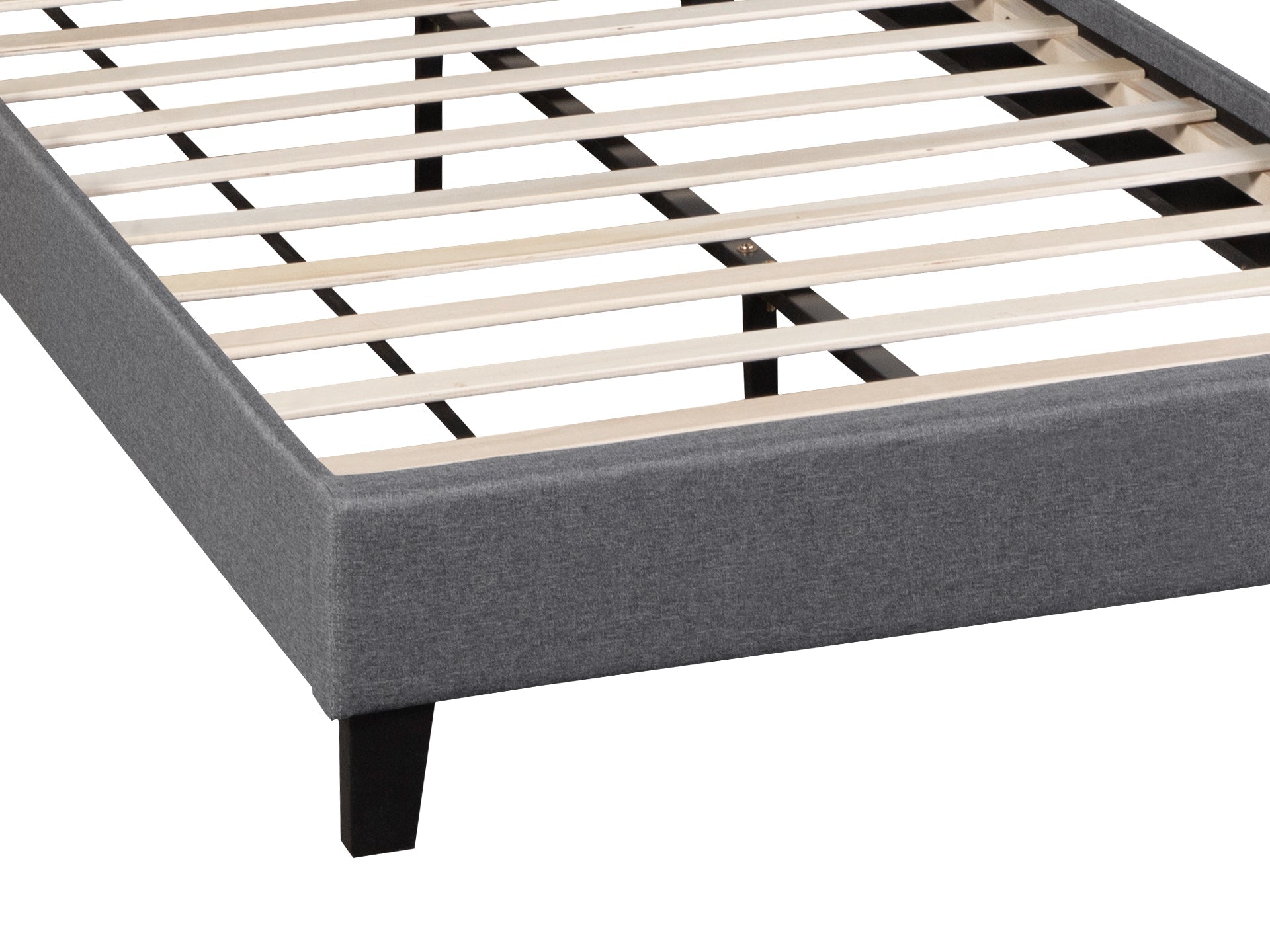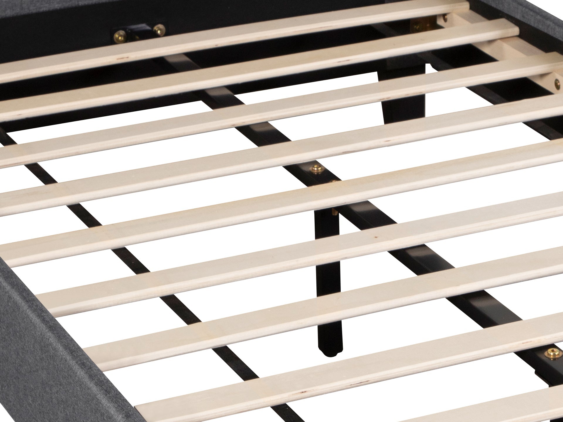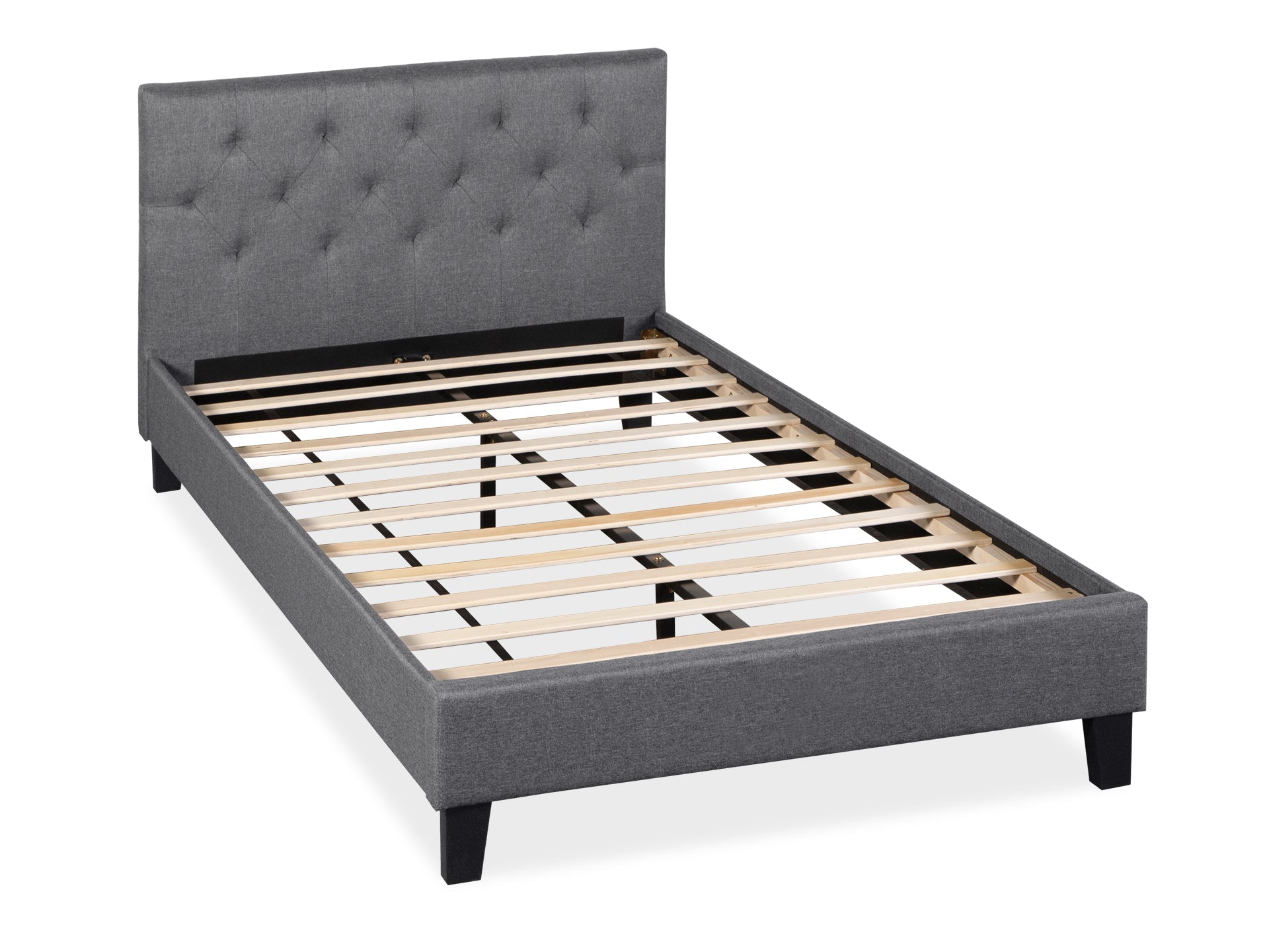 Built on a solid and manufactured wood slat base, this bed offers exceptional stability for a restful night's sleep. It not only enhances the lifespan of your mattress but also provides essential support to distribute weight evenly. The headboard features a refined tufted pattern and is generously padded with high-density foam, ensuring superior softness and comfort, while adding a touch of glamour to your suite. The neutral dark grey fabric adds warmth and welcoming vibes to your room.