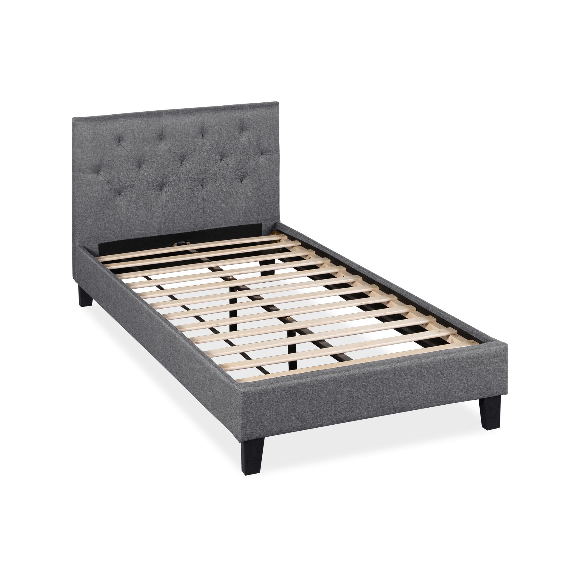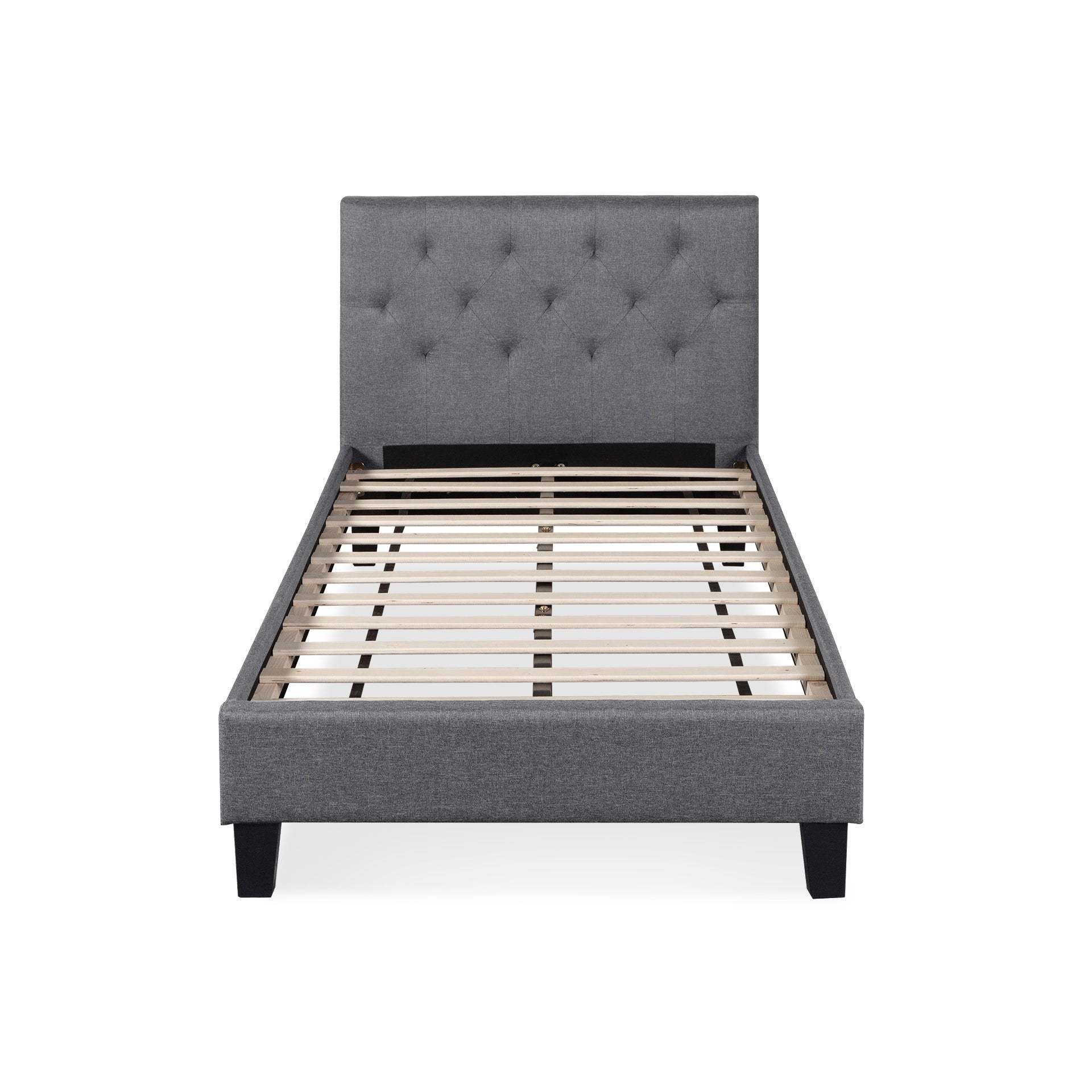 Built on a solid and manufactured wood slat base, this bed offers exceptional stability for a restful night's sleep. It not only enhances the lifespan of your mattress but also provides essential support to distribute weight evenly. The headboard features a refined tufted pattern and is generously padded with high-density foam, ensuring superior softness and comfort, while adding a touch of glamour to your suite. The neutral dark grey fabric adds warmth and welcoming vibes to your room.