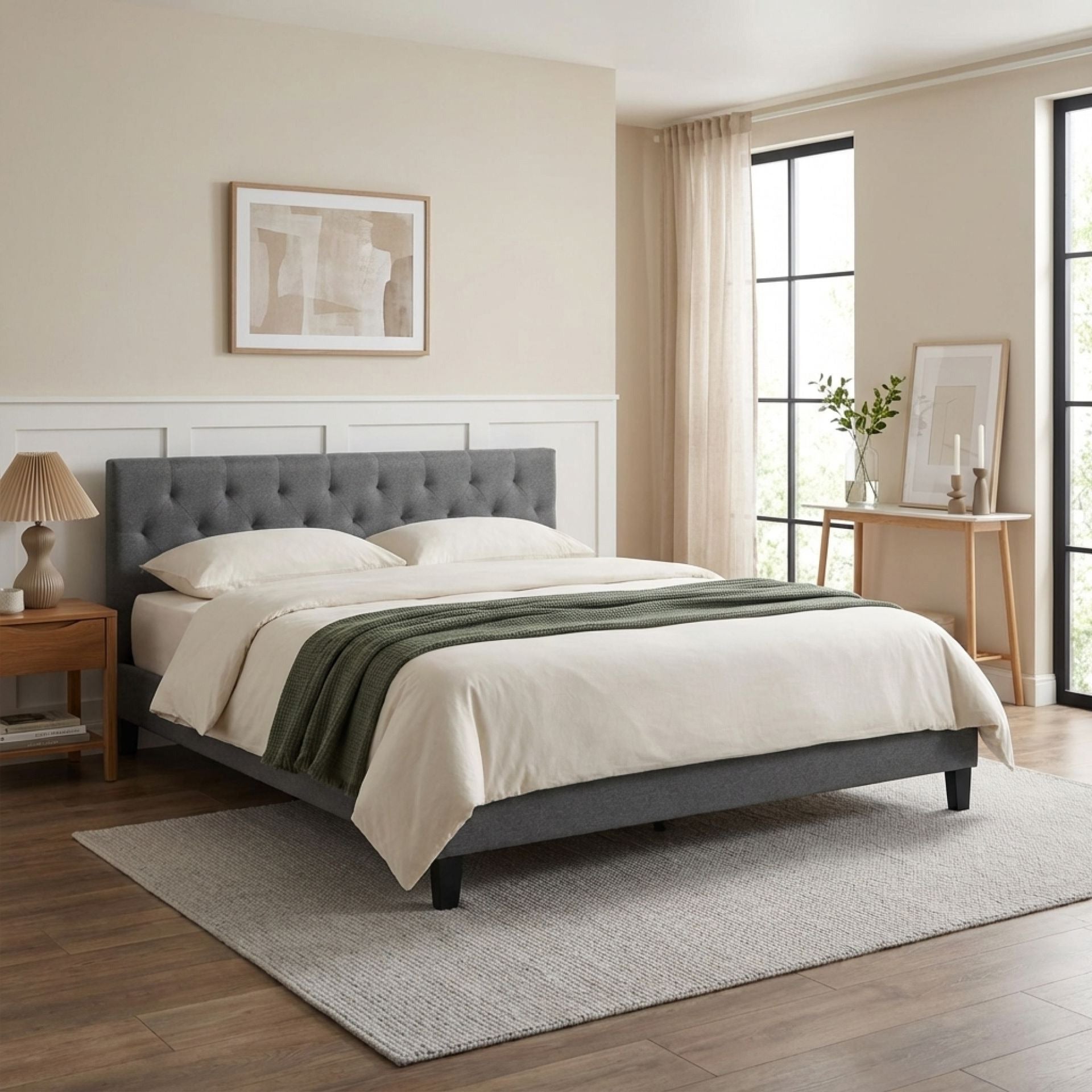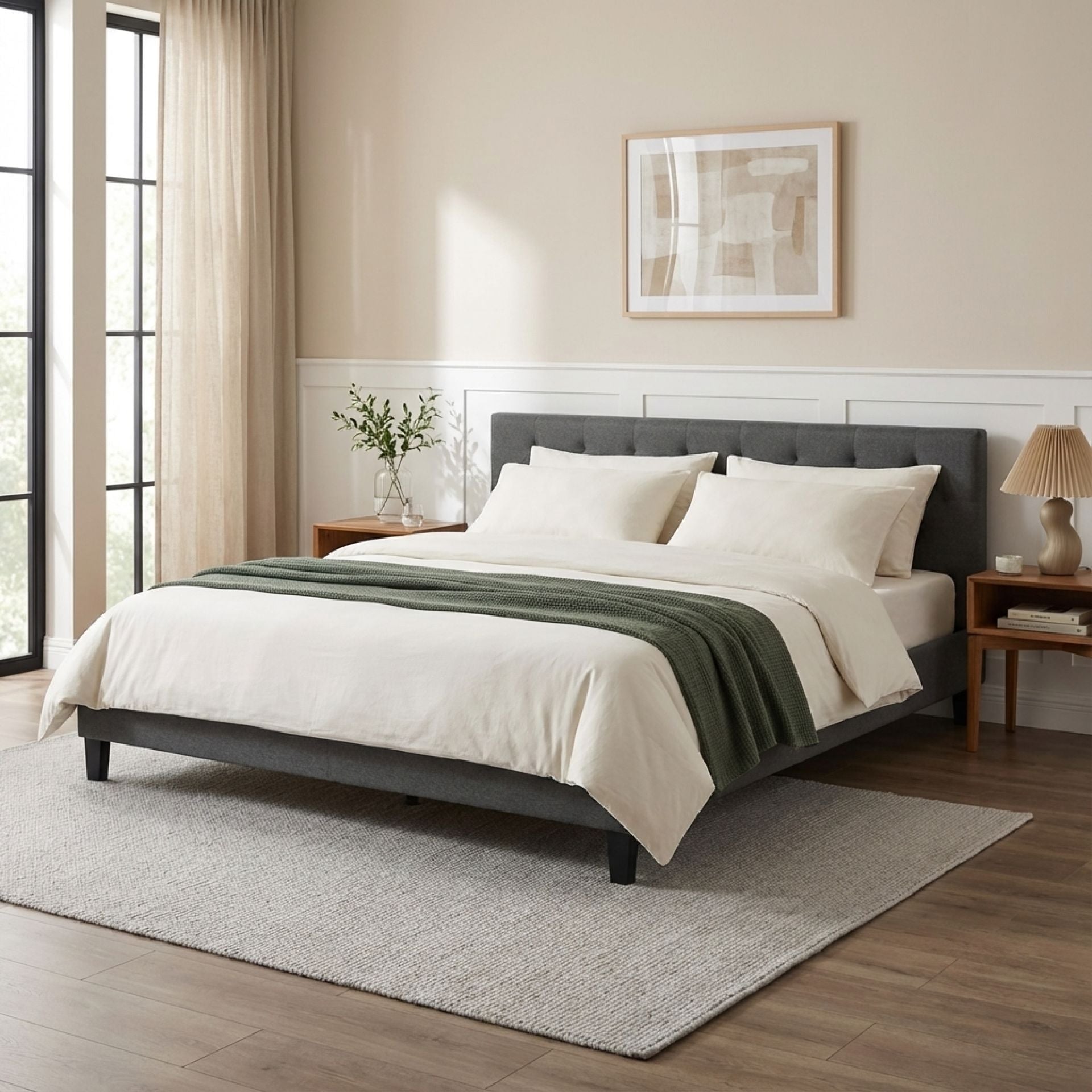 - Button tufted headboard padded with high density foam