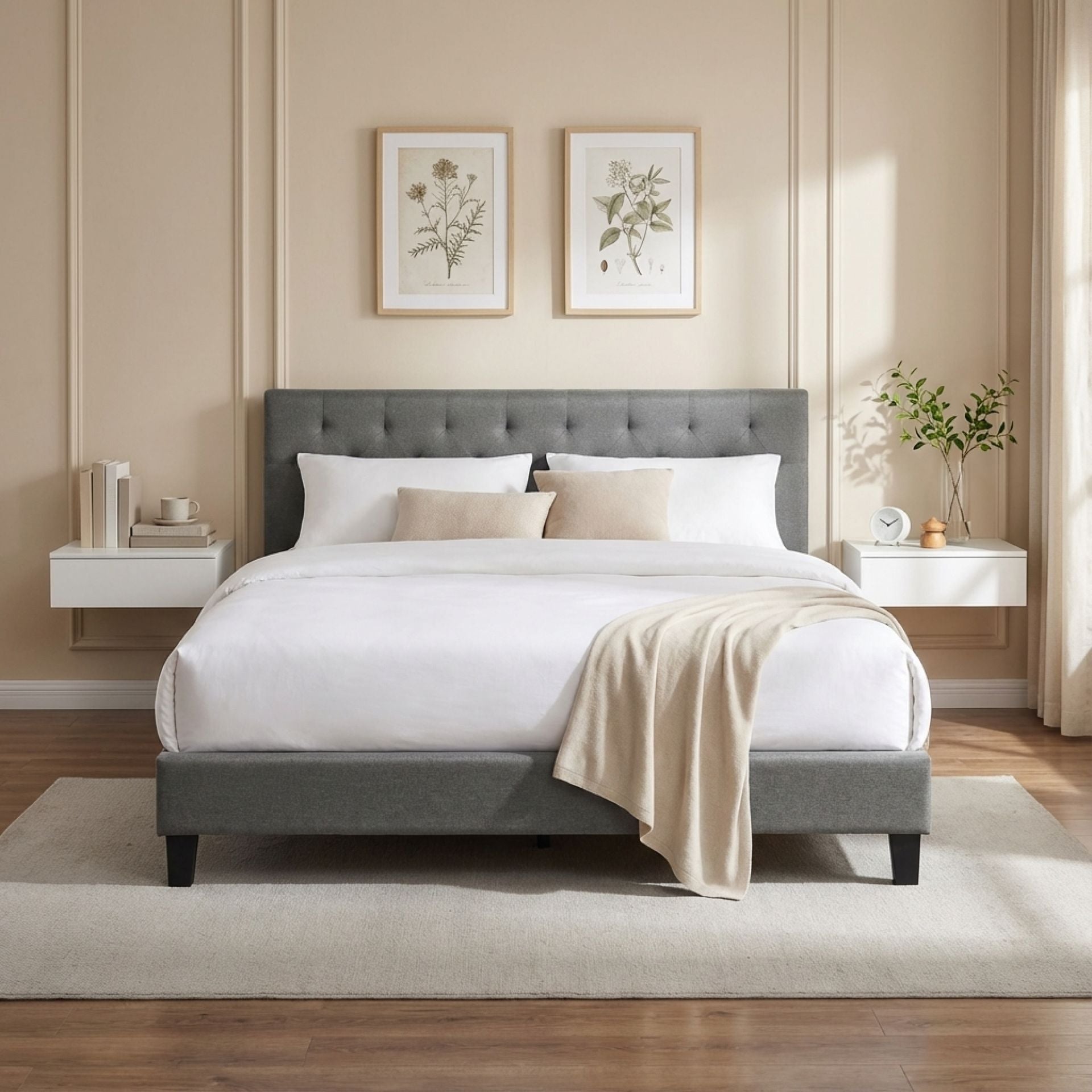 Founded on a solid and manufactured wood slat base, this bed frame ensures a great foundation for a comfortable night’s sleep. It extends the lifetime of your expensive mattress by absorbing weight and stress. The elegant tufted headboard, padded with high-density foam, adds enhanced softness and comfort, giving your bedroom a touch of glamour. The neutral grey fabric brings warmth and a welcoming feel, while the trendy legs complete the timeless look of this comfortable masterpiece.