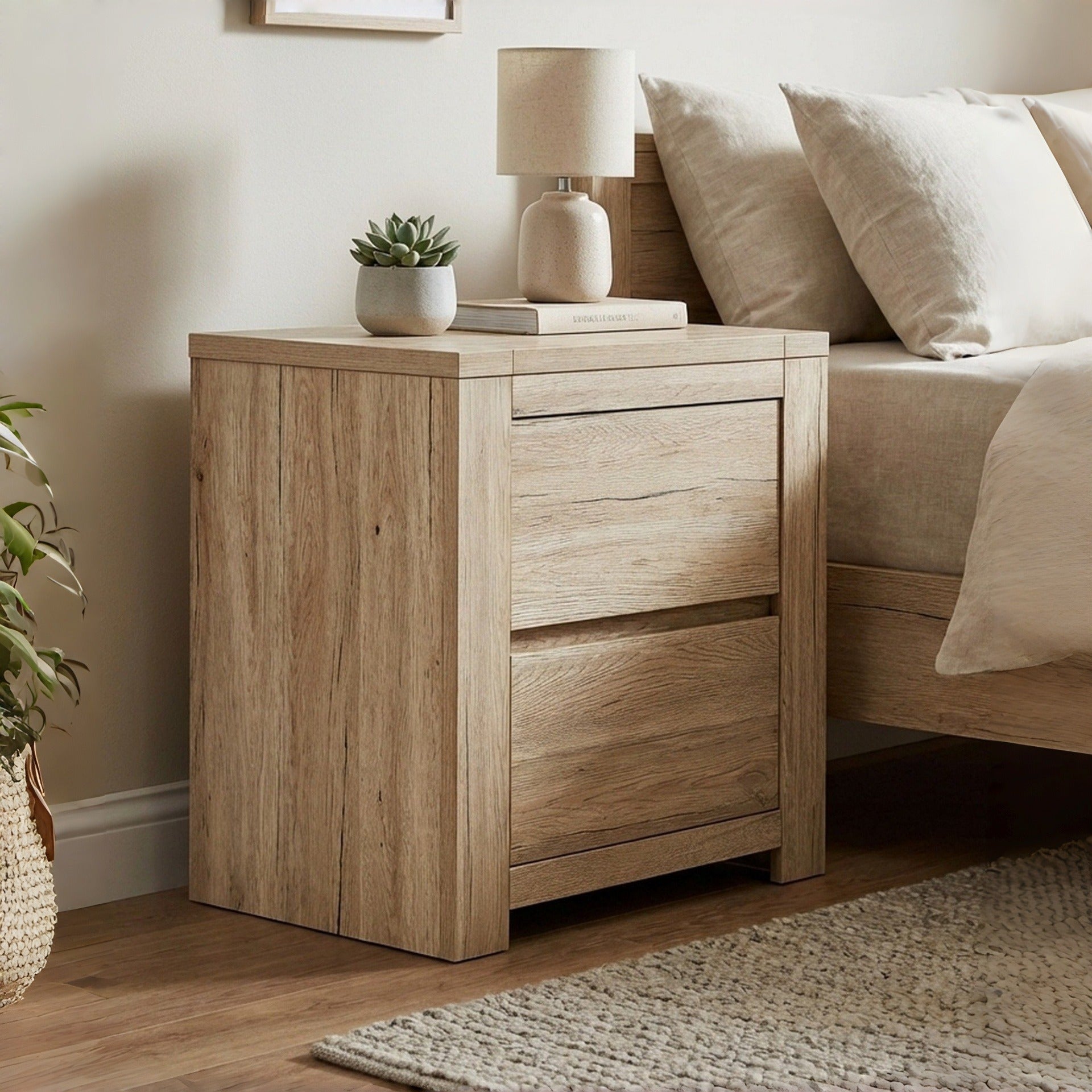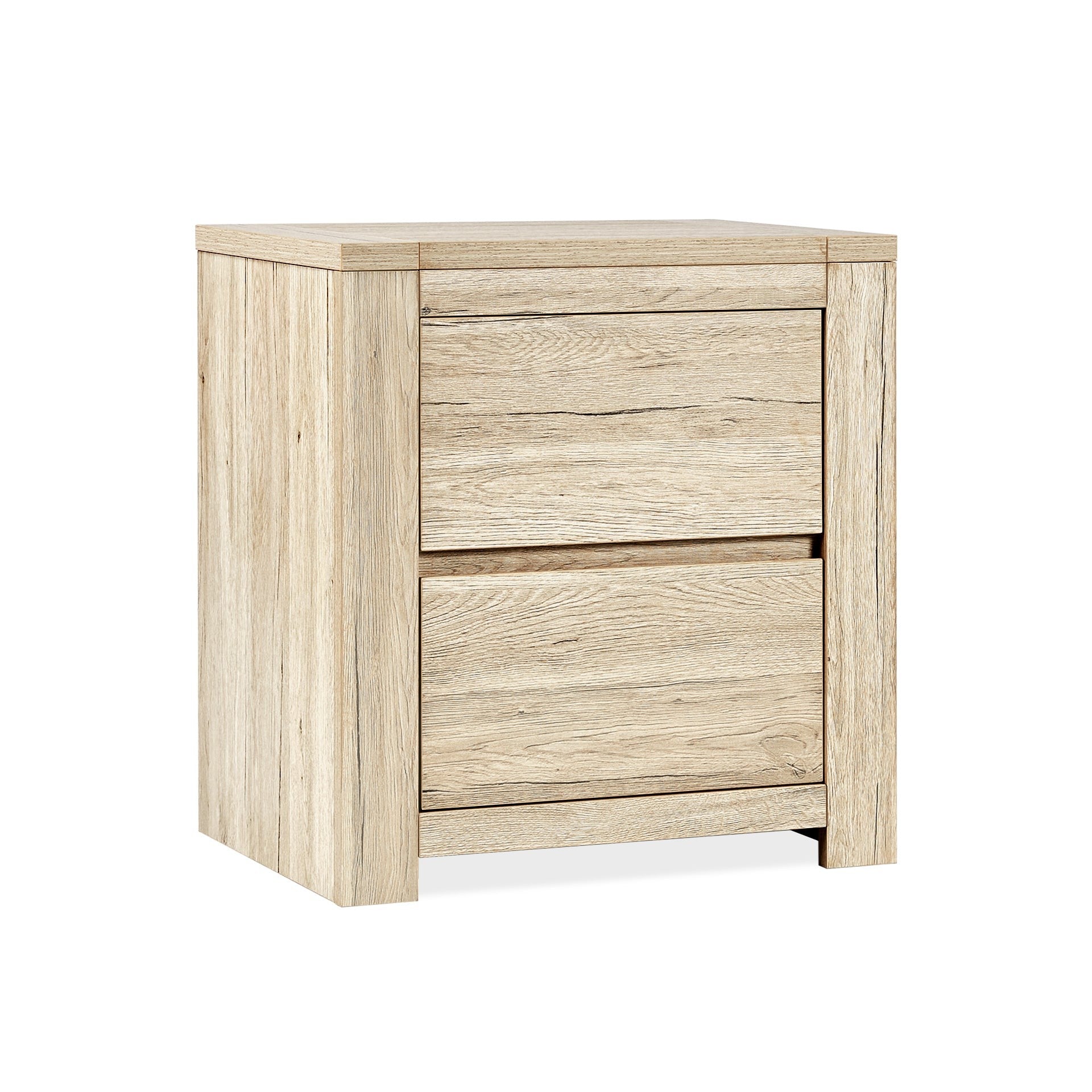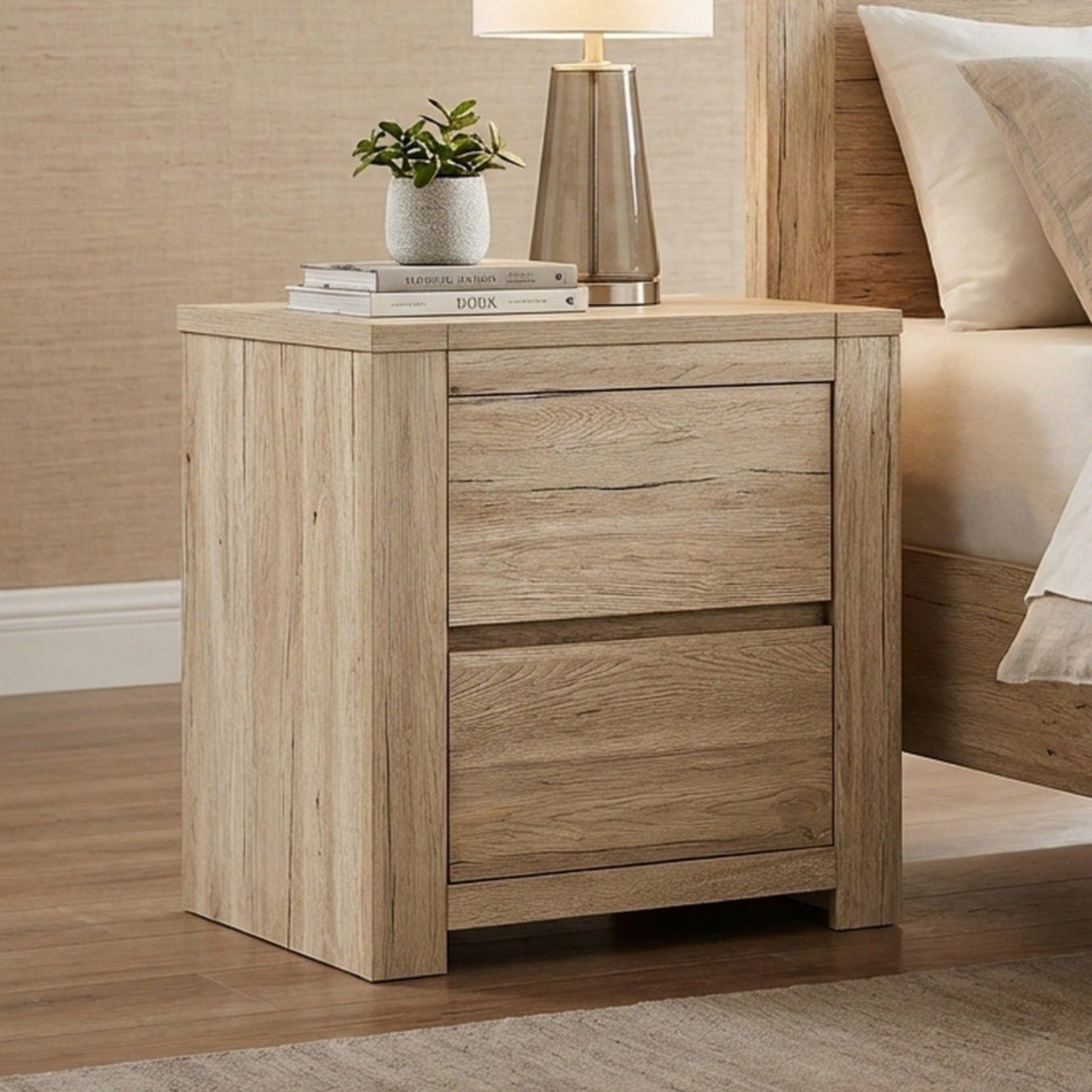 Incorporating a handless design for a sleek profile, the BORNEO bedside table is crafted in a washed oak finish that highlights the natural beauty and variance of wood grains, offering a cozy, rustic touch to your bedroom. The design includes two spacious drawers for organizing essentials, ensuring your space remains tidy while adding a modern minimalist vibe. This nightstand's sturdy framework ensures a safe and durable haven for all your bedside needs.