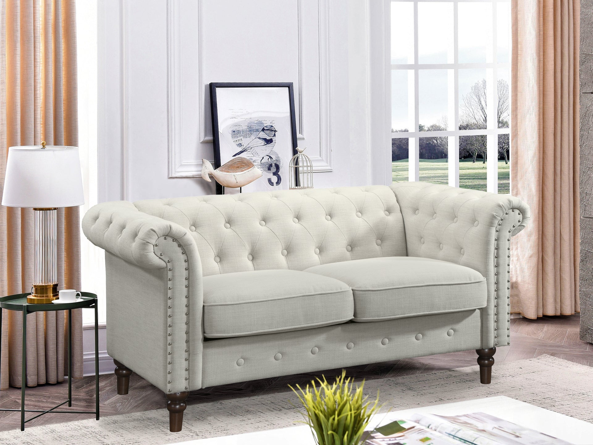 Boasting a retro elegant style, the Chesley 2 Seater Sofa infuses any room with luxury and sophistication. It is upholstered in high-quality, luxurious fabric, offering an inviting space to sink into. The high-density foam cushions provide extra comfort, resembling a gentle embrace after a long day. The eye-pleasing, thick padded, button-tufted backrest adds to its aesthetic appeal. Beyond its style, the sofa's strong frame construction promises not just a fleeting trend, but a durable presence in your living space. Resting on sturdy wooden legs, the Sofa stands as a symbol of strength and resilience. The chrome-coloured rivet decoration enhances its look, making the Chesley Sofa a true showstopper.