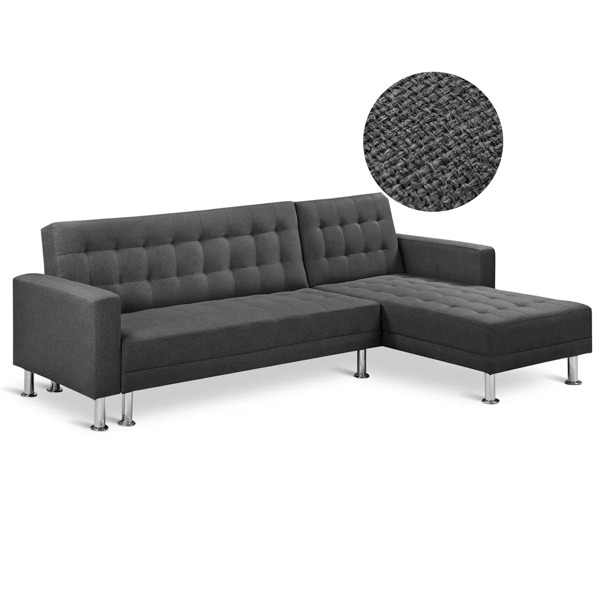 This COLORADO Sofa Bed Futon with Chaise is a beautiful, modern sofa with clean lines that offer a space saving solution is an excellent option for your living rooms, bedrooms or guest room. It not only can give you ample seating in your living room but also accommodate any unexpected guests a cozy bed. Upholstered with elegant polyester fabric and chrome finished legs, the Sofa Bed is both sturdy and elegant to look at; while the extra thick and high density foam ensure great durability and stability