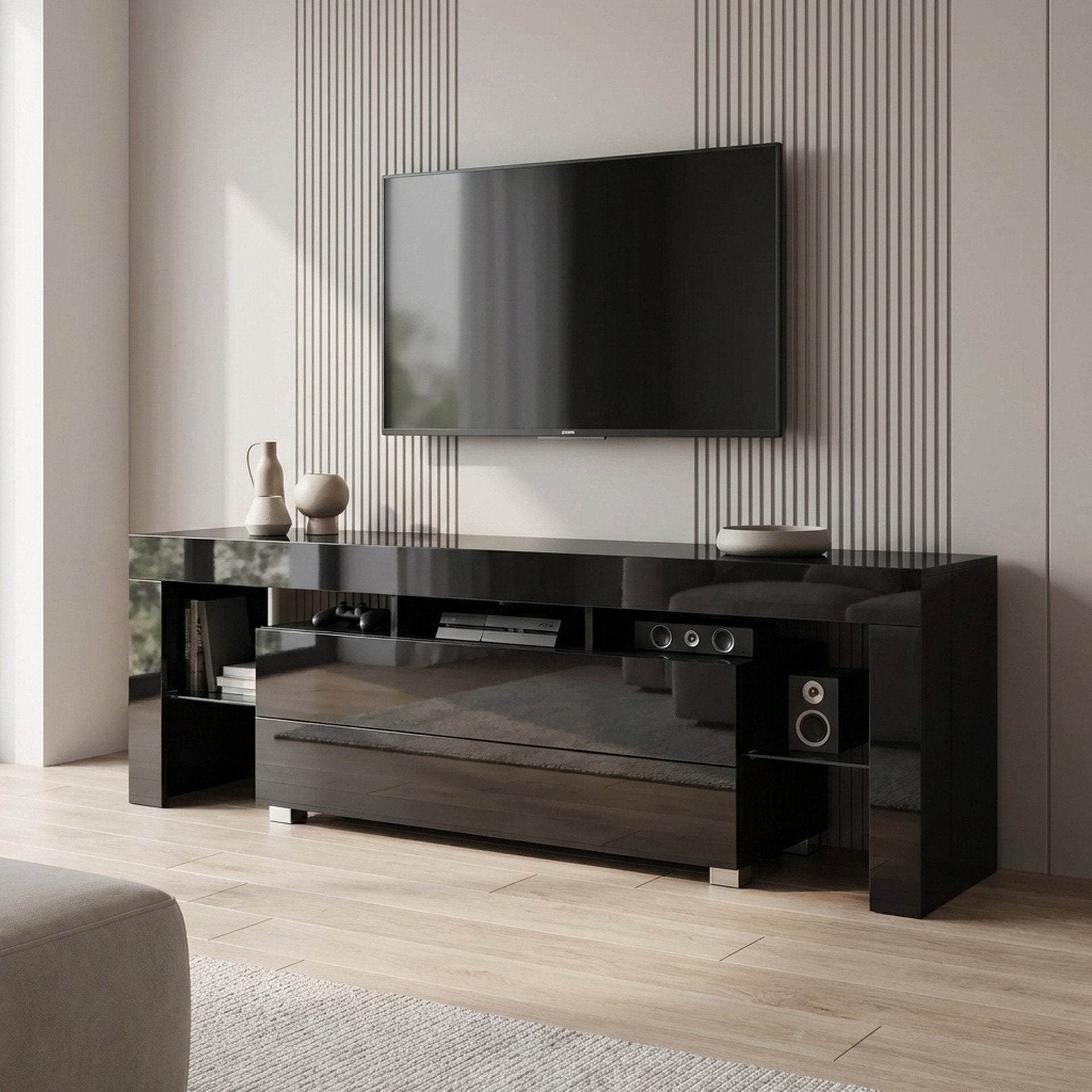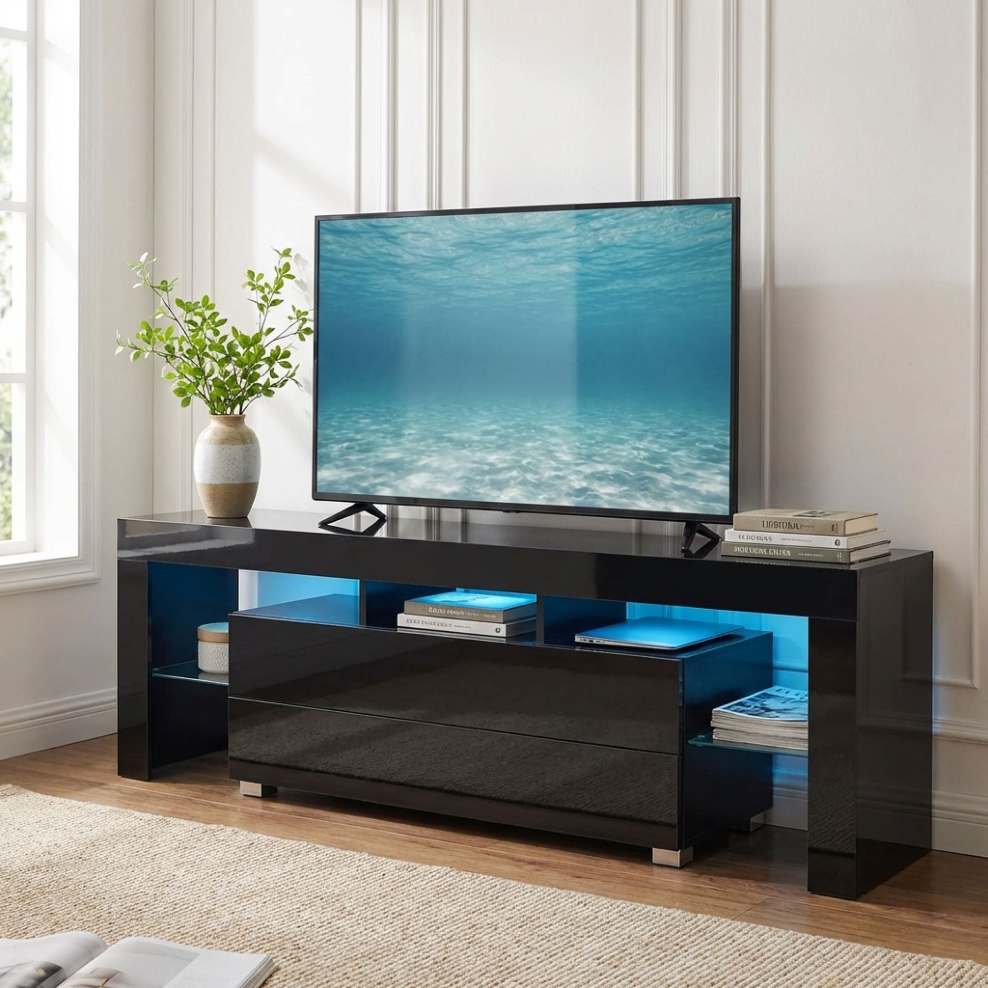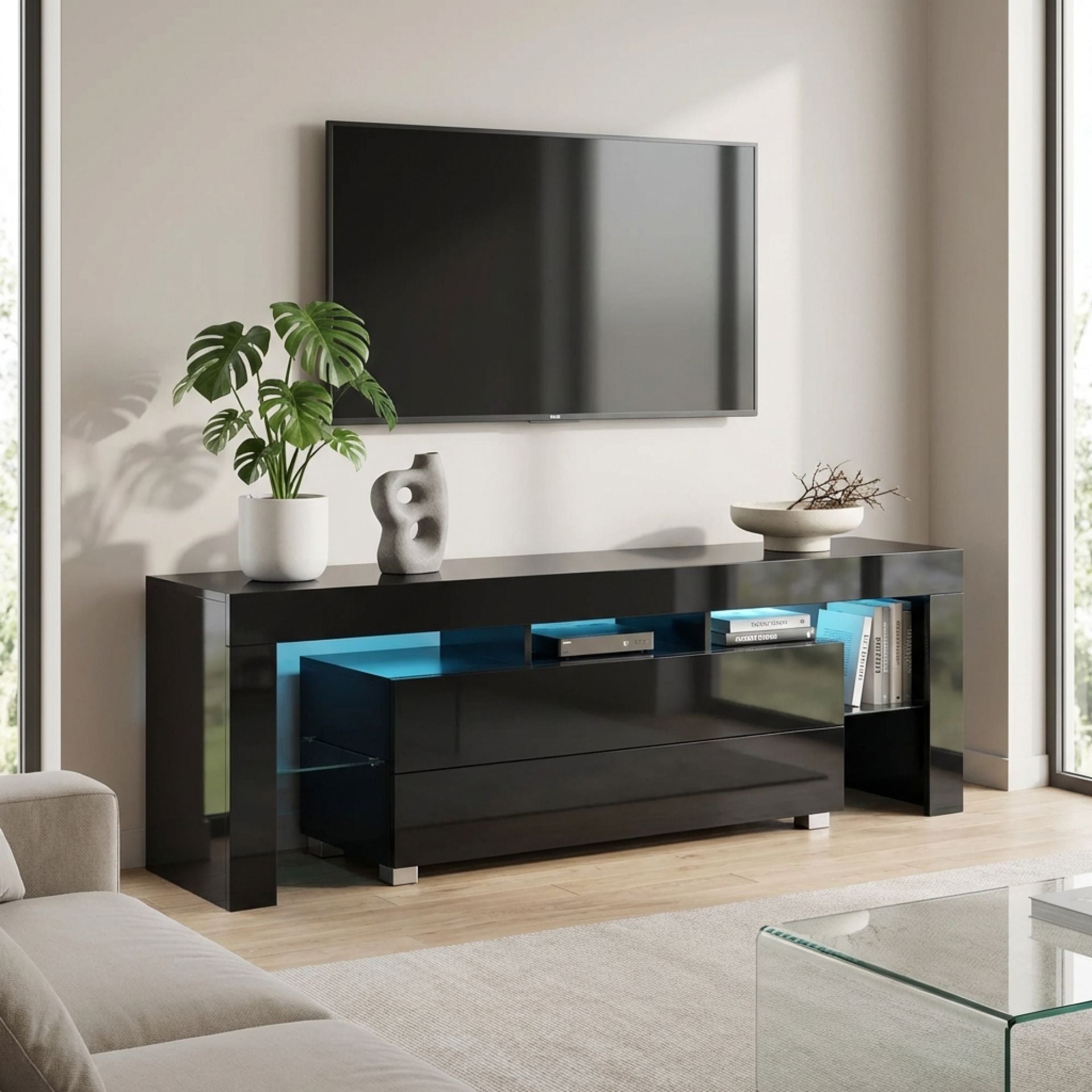 This Entertainment Unit features flat top for all kind of TV or media storage and other decorations such as vases and photos, also comes with 2 independent drawers give ample room to stow your favourite DVDs and other media accessories, while the open shelves are designed to hold media consoles and all your home essentials; equipped with LED lights which will make your room more fashionable, modern and background wall brighter; made of high quality particle board with a smooth melamine finish for easy maintenance and cleaning which is durable and sturdy, while the UV high gloss finish and tempered glass give the entertainment unit a modern look to anchor to your space. The new update of the entertainment unit with a thicker board that look sturdy is thicker and stronger for use.