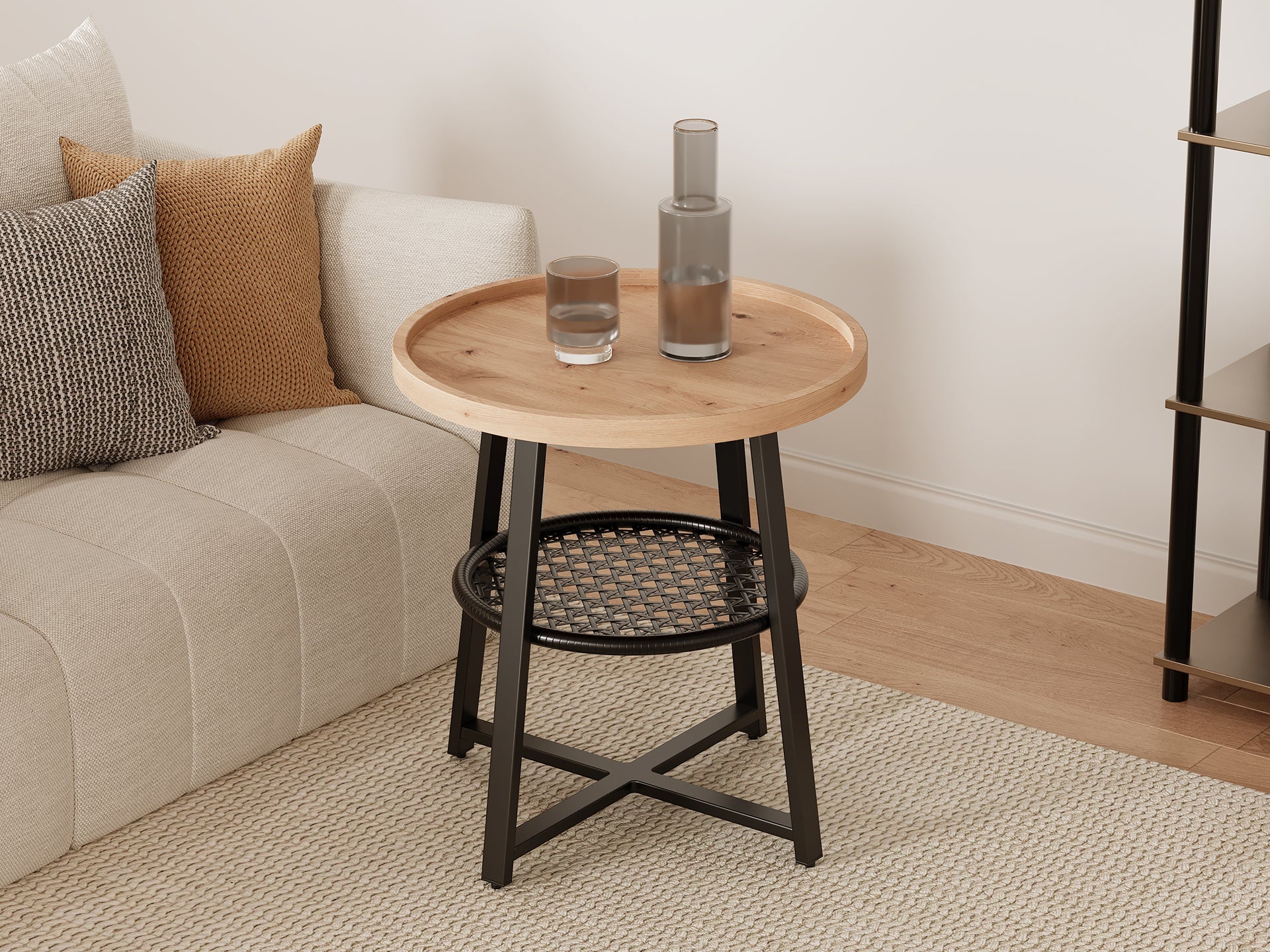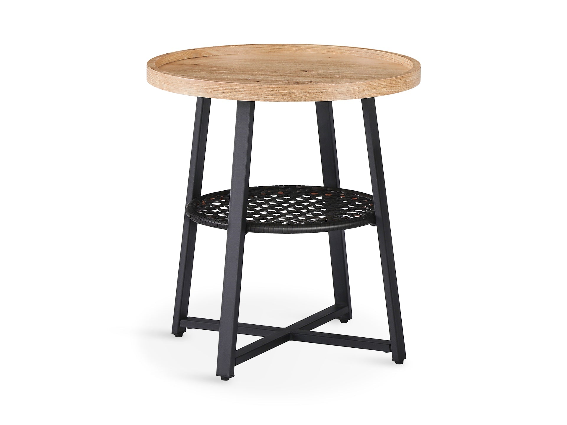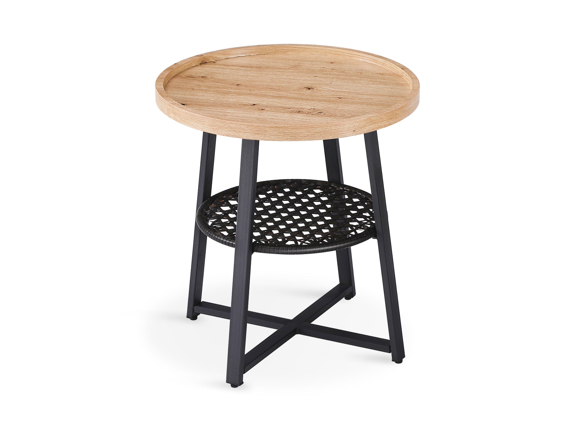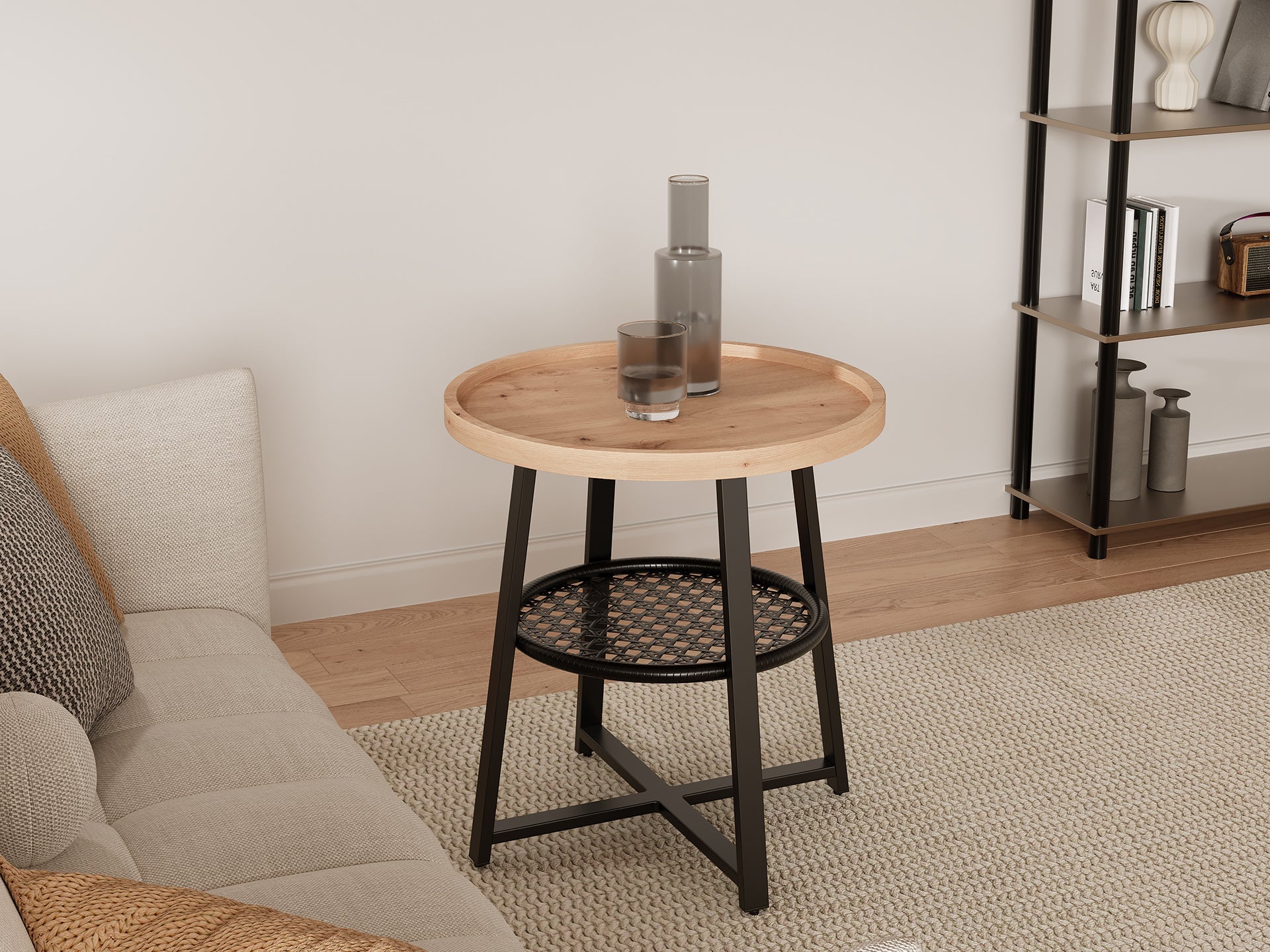 The table appears warm and natural with its smooth wood-look paper lamination top, balanced by the powder-coated industrial look of the matte black metal frame. At the base of the shelf is woven rattan, which adds that extra texture.