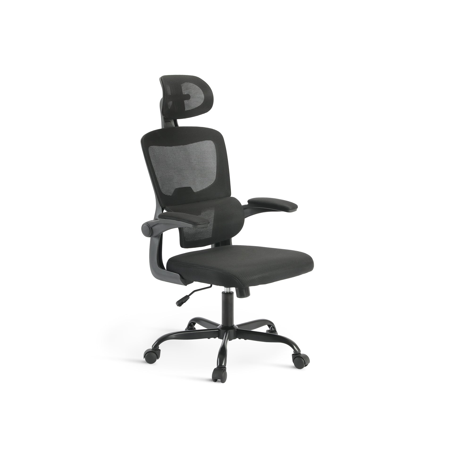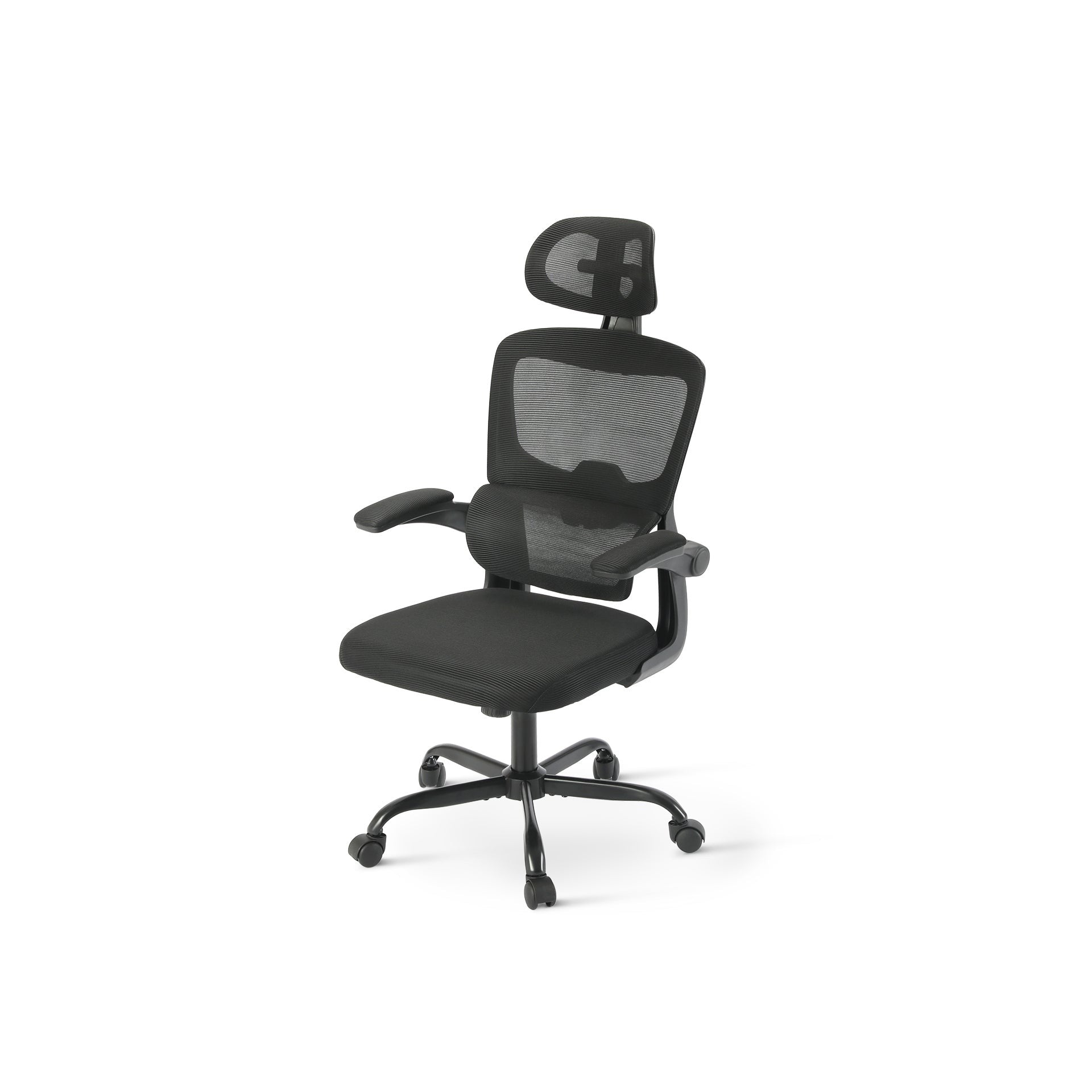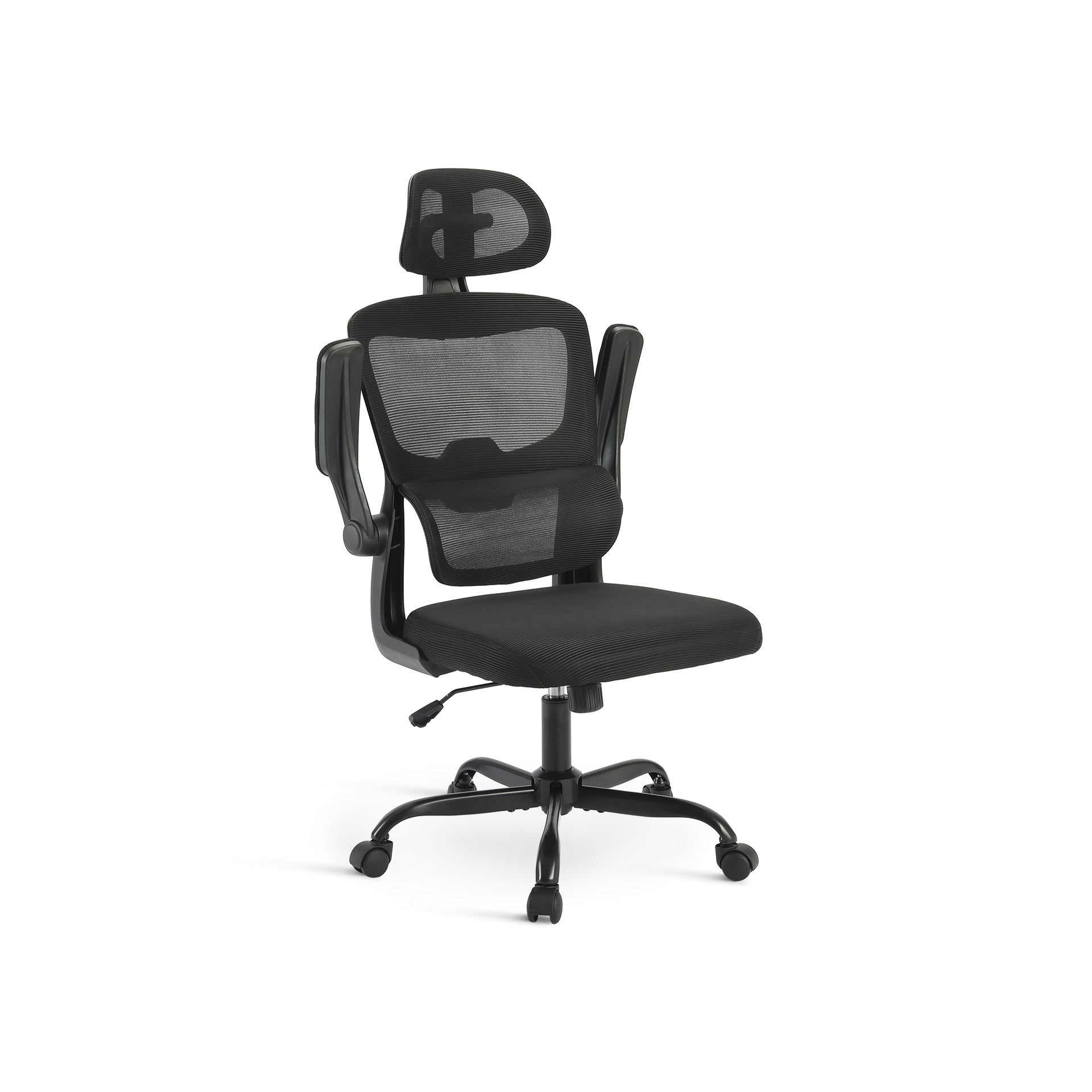 The office chair is crafted from highly breathable mesh cloth, ensuring optimal airflow and keeping you cool and comfortable throughout the day. Customize your seating position with the adjustable headrest and height feature, allowing you to find the perfect fit for your body. The flip-up armrests provide added flexibility, allowing you to get closer to your desk or relax your arms when needed. Experience exceptional lumbar support with the suspended design, promoting proper posture and reducing back strain. The padded sponge cushioning offers a plush seating experience, ensuring all-day comfort. Adjusting the chair's height is a breeze with the adjustable lever beneath the seat, allowing you to find the ideal position for your workstation. With its 360° rotatable seat and smooth-rolling casters, you can effortlessly maneuver around your desk, accessing all areas with ease.