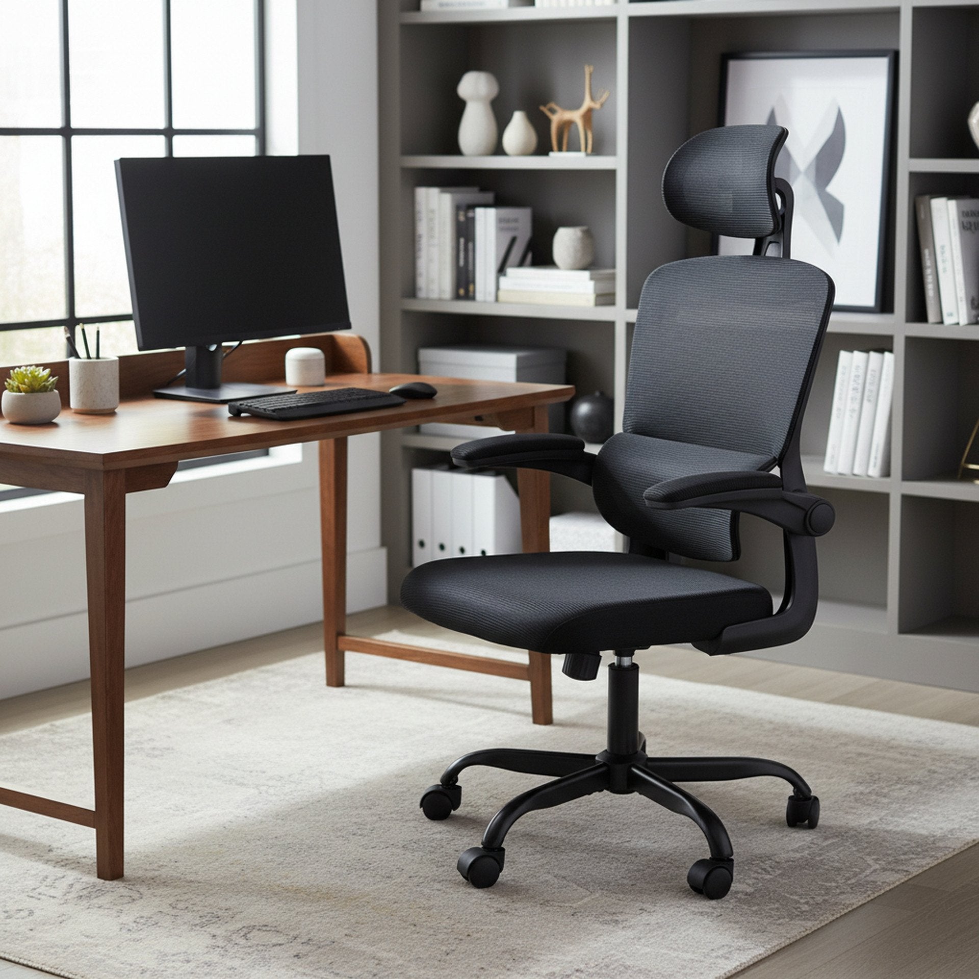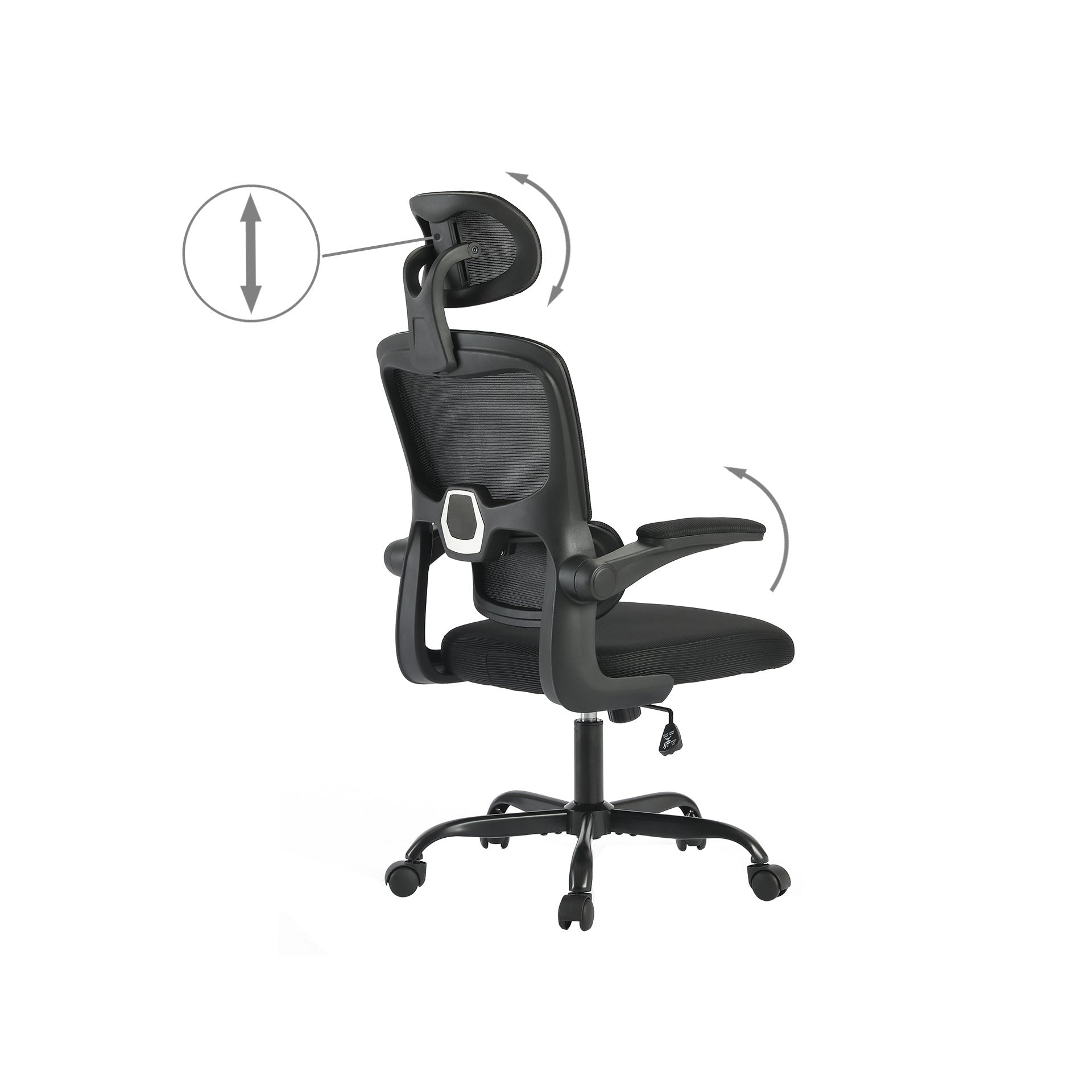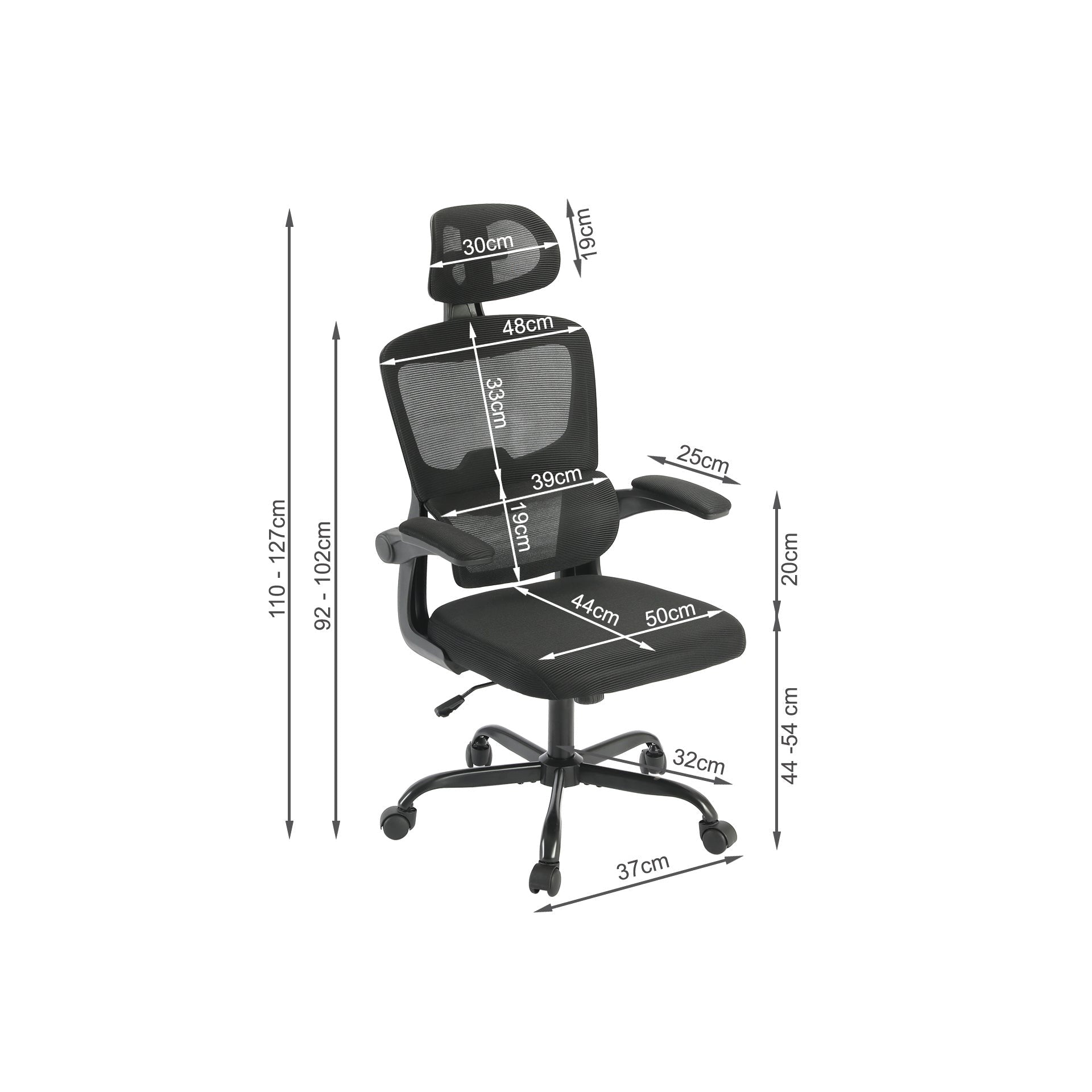 The office chair is crafted from highly breathable mesh cloth, ensuring optimal airflow and keeping you cool and comfortable throughout the day. Customize your seating position with the adjustable headrest and height feature, allowing you to find the perfect fit for your body. The flip-up armrests provide added flexibility, allowing you to get closer to your desk or relax your arms when needed. Experience exceptional lumbar support with the suspended design, promoting proper posture and reducing back strain. The padded sponge cushioning offers a plush seating experience, ensuring all-day comfort. Adjusting the chair's height is a breeze with the adjustable lever beneath the seat, allowing you to find the ideal position for your workstation. With its 360° rotatable seat and smooth-rolling casters, you can effortlessly maneuver around your desk, accessing all areas with ease.