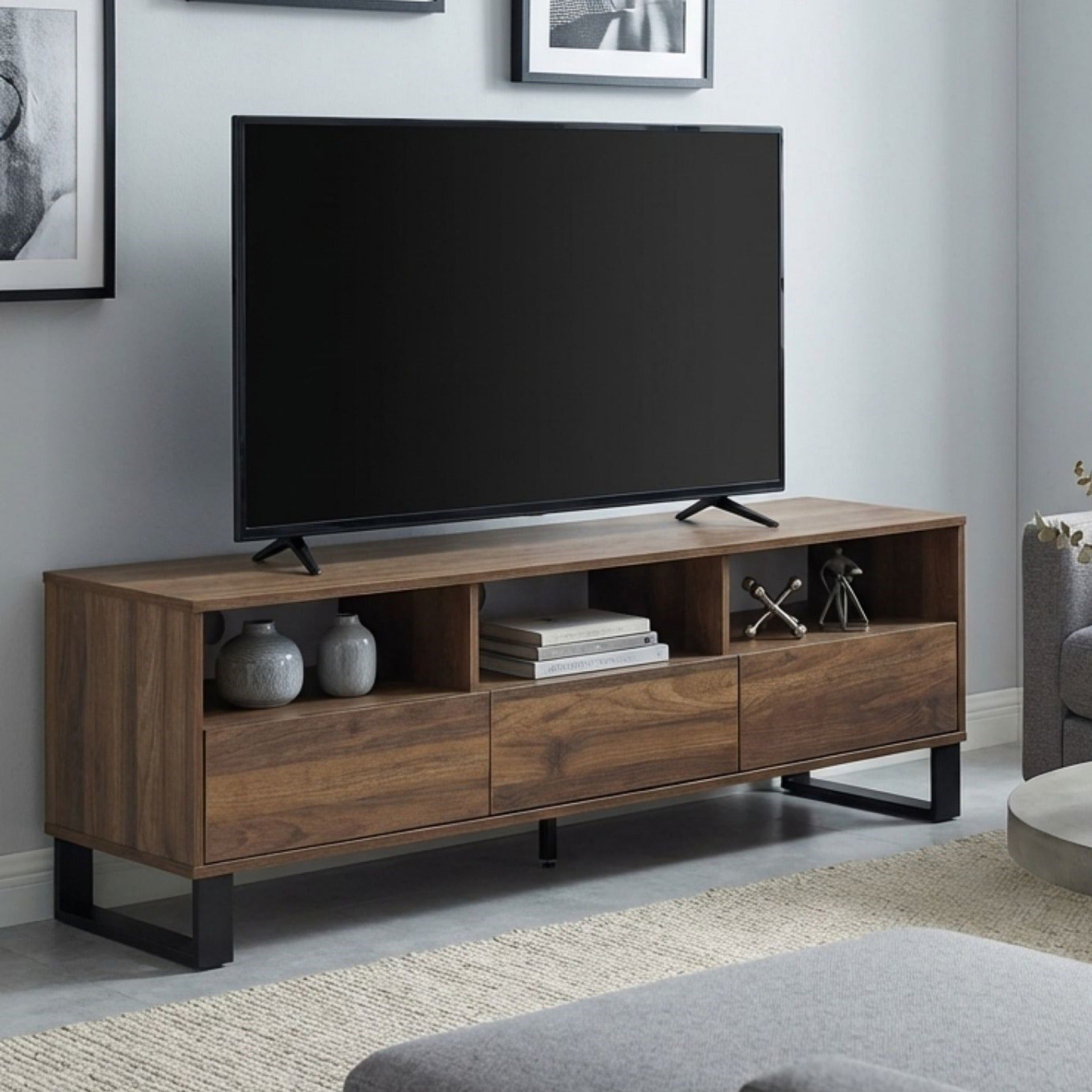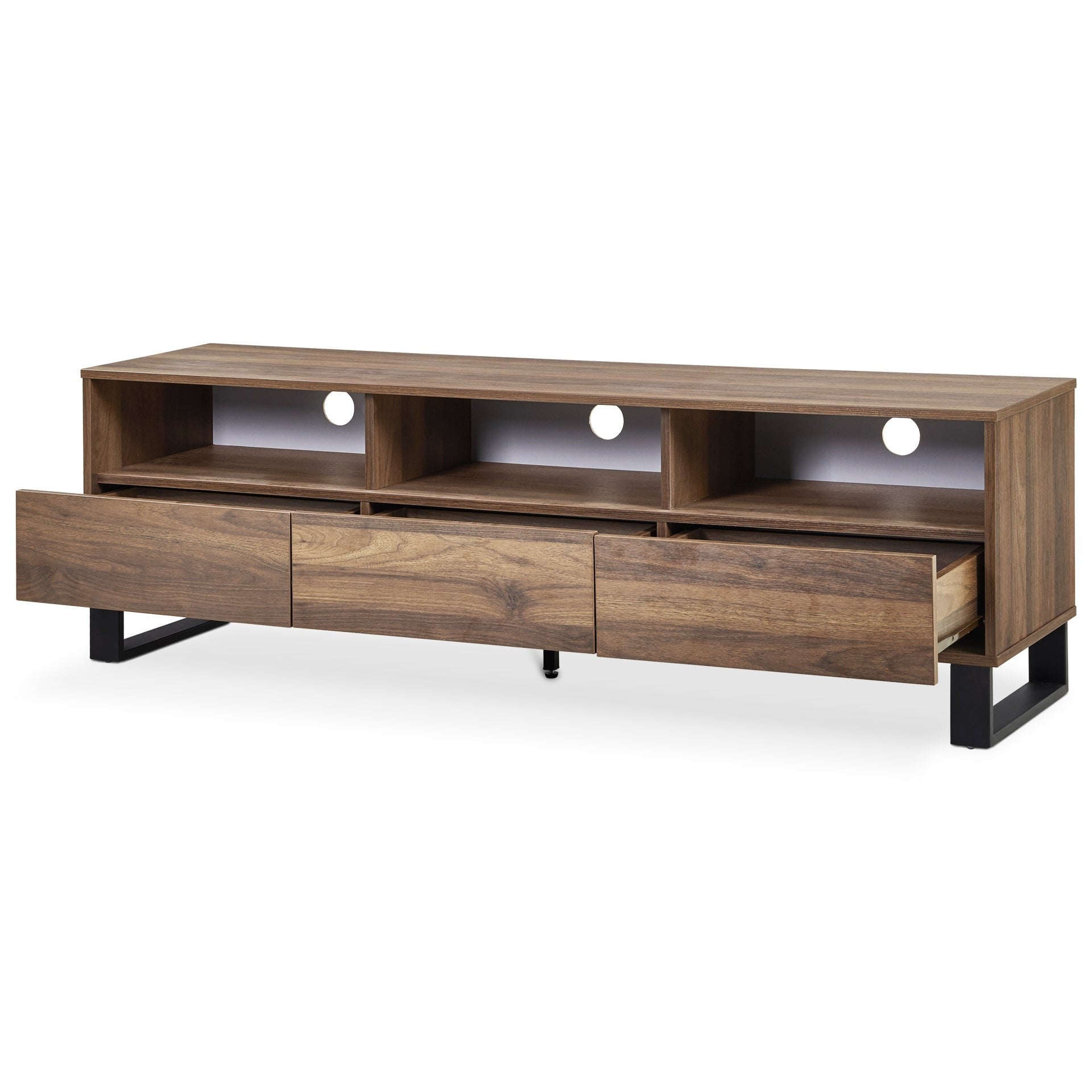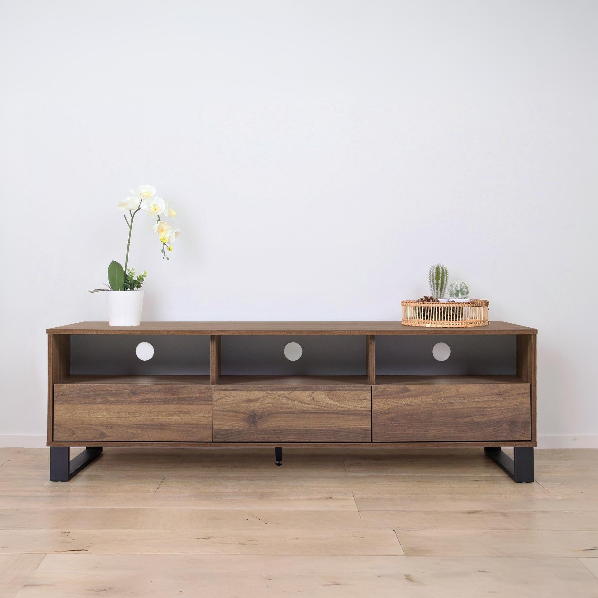 This FROHNA Entertainment Unit is one of our FROHNA range products with a simple and modern style look makes a great décor for home. Crafted from quality wood with black metal accents, this entertainment unit is sturdy and durable; feature flat top for all kind of TV or media storage and other decorations such as vases and photos; come with 3 drawer allowing extra storage space for headsets, DVDs and the open shelves provide storage for all your home essentials and the open shelves provide storage for all your home essentials.