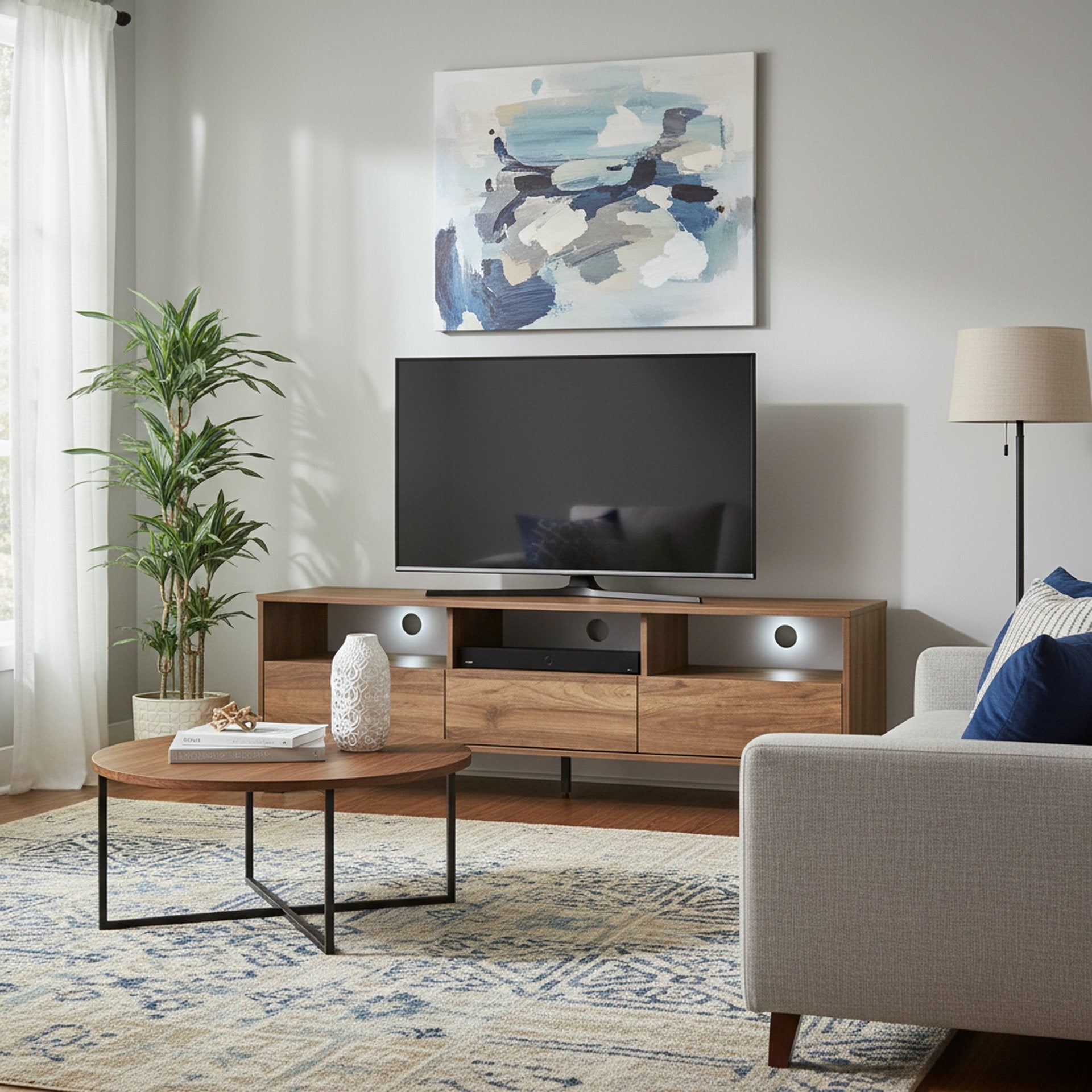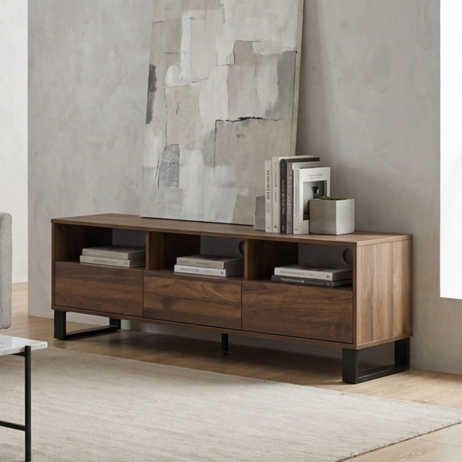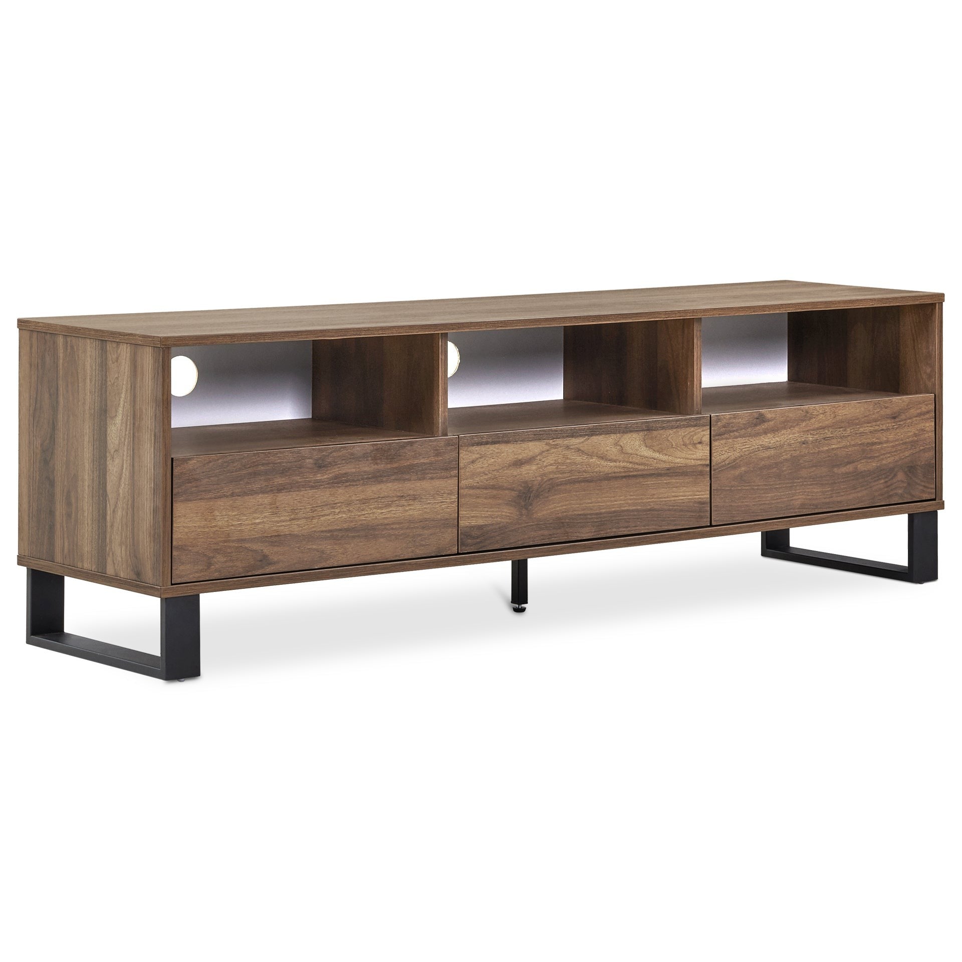 This FROHNA Entertainment Unit is one of our FROHNA range products with a simple and modern style look makes a great décor for home. Crafted from quality wood with black metal accents, this entertainment unit is sturdy and durable; feature flat top for all kind of TV or media storage and other decorations such as vases and photos; come with 3 drawer allowing extra storage space for headsets, DVDs and the open shelves provide storage for all your home essentials and the open shelves provide storage for all your home essentials.