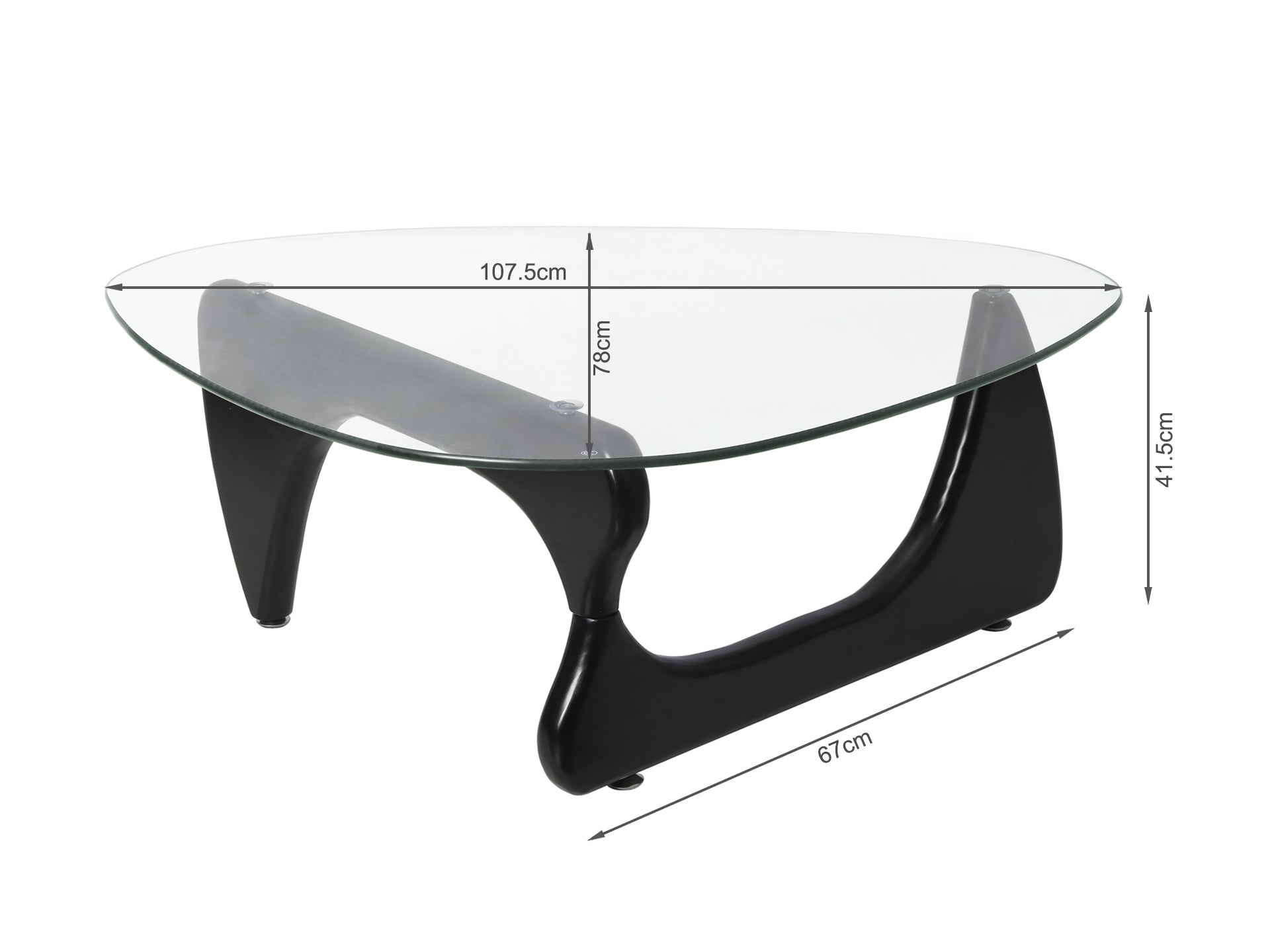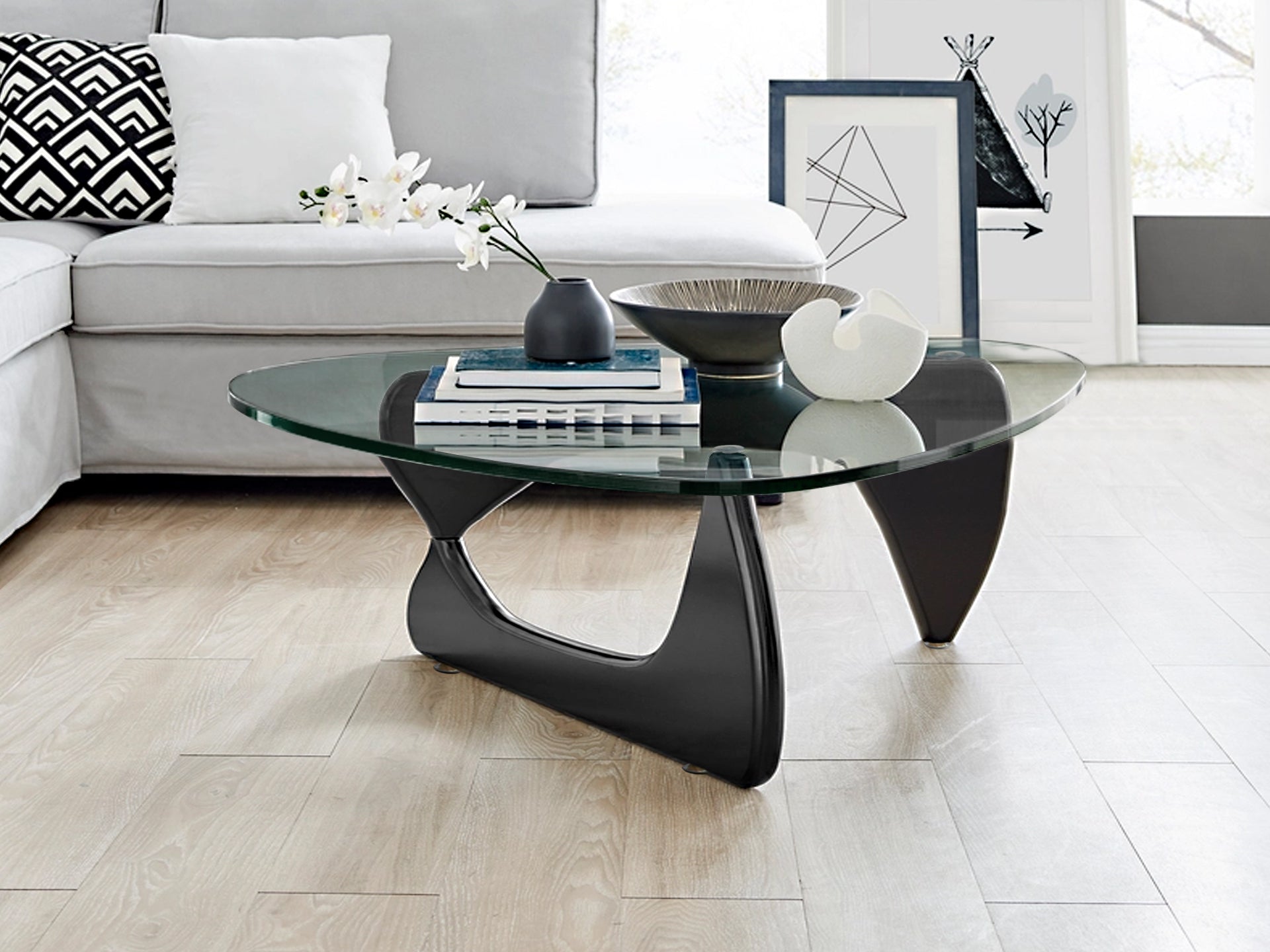 Our GALAN Noguchi coffee table has been redesigned in solid wood and finished in a warm wood tone. This coffee table is made from just three pieces, a tempered 12 mm thick glass tabletop and two curved solid wood legs that interlock to form a tripod for self-stabilising support. Available in 2 different colours and 3 different sizes. It not only appears as a stunning sculpture, but it's also a sturdy and durable piece of furniture. Our replica piece combines the elegance and simplicity which the original coffee table is known for. It definitely makes a strike in your living room. Perfect for any modern home and workplace!