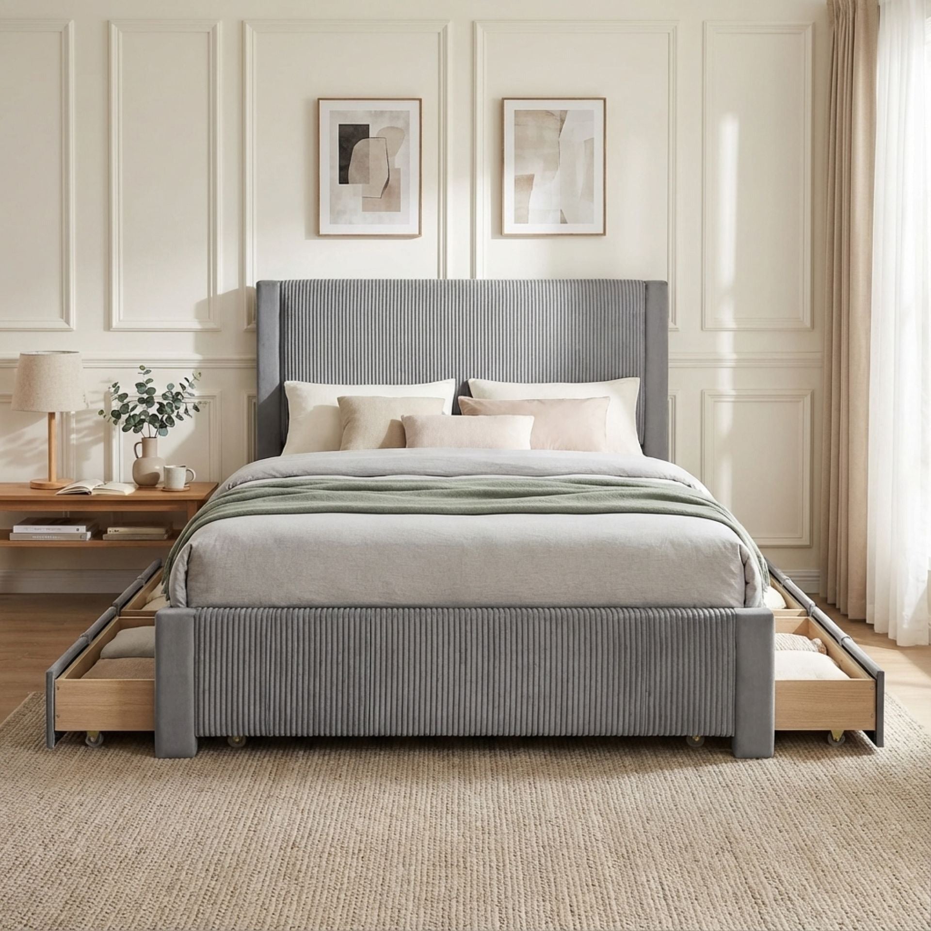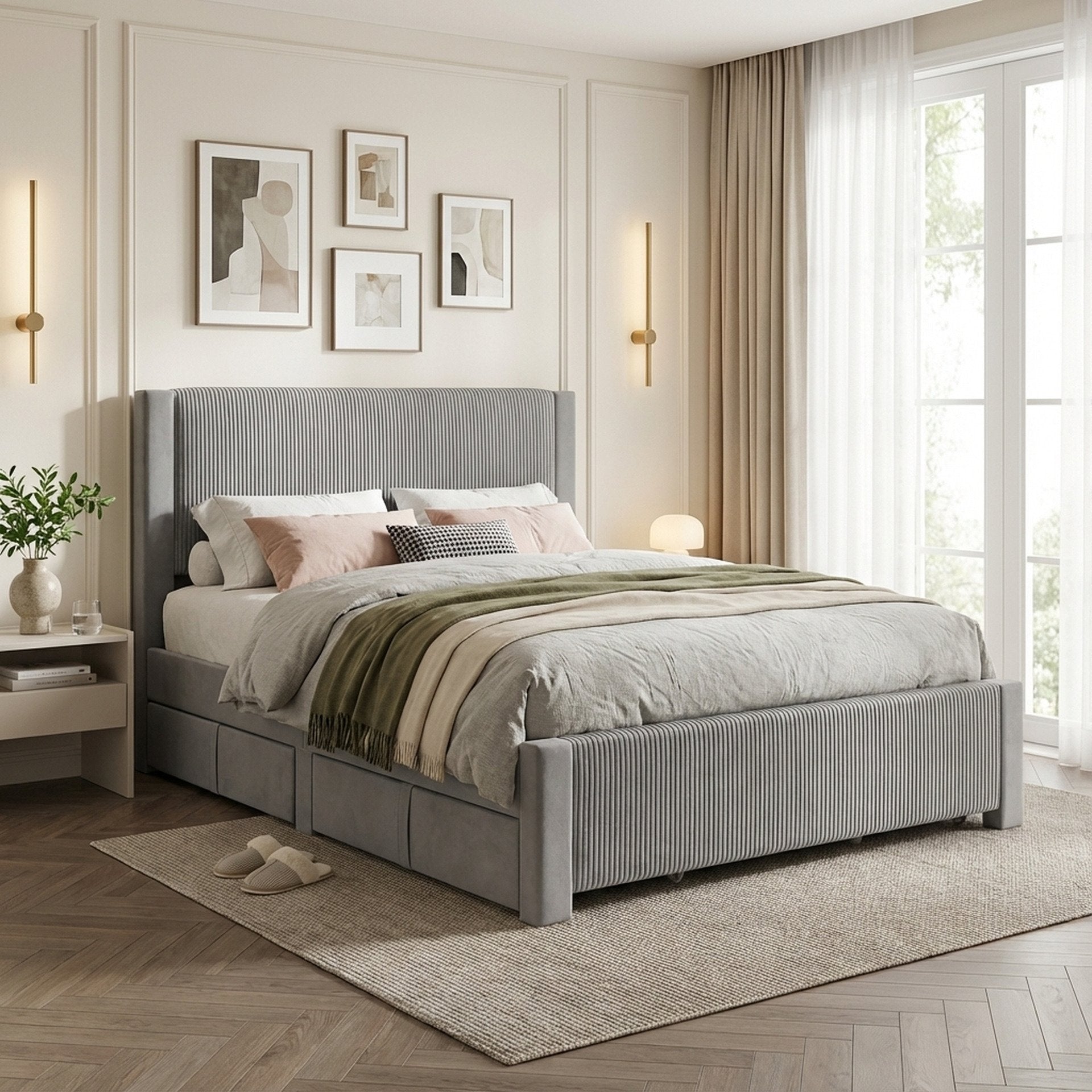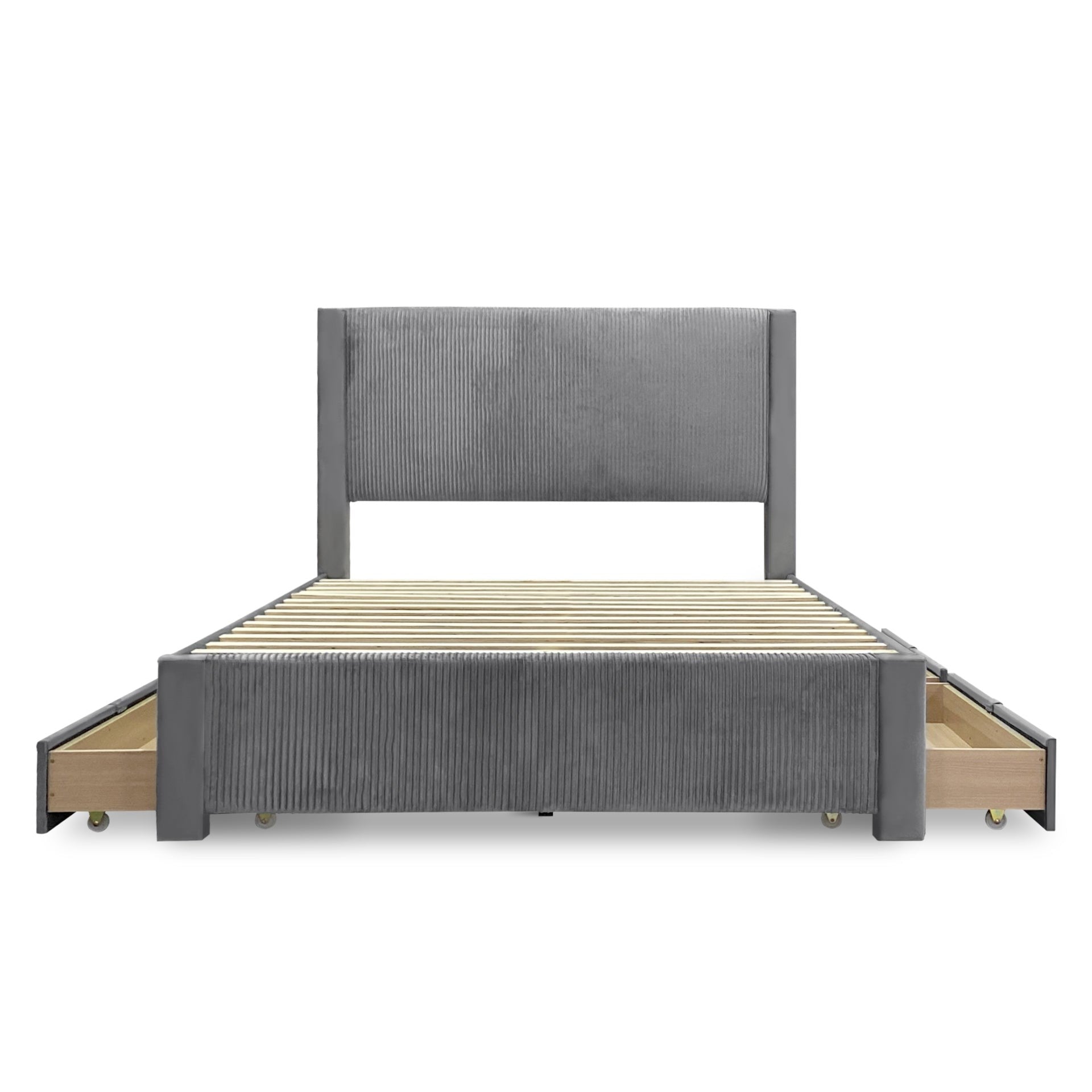 Featuring four spacious pull-out drawers, this bed frame provides ample storage to keep your room neat and clutter-free. The velvet material ensures a high level of comfort, perfect for a good night's sleep. Additionally, the fine striped design adds a subtle yet stylish texture to the bed frame, making it a focal point in your bedroom decor. Built with sturdy wooden slats and reinforced by robust metal support legs, this bed frame ensures durability and stability. The wooden slats are flush with the bed frame, providing extra mattress space with a no-hassle design.