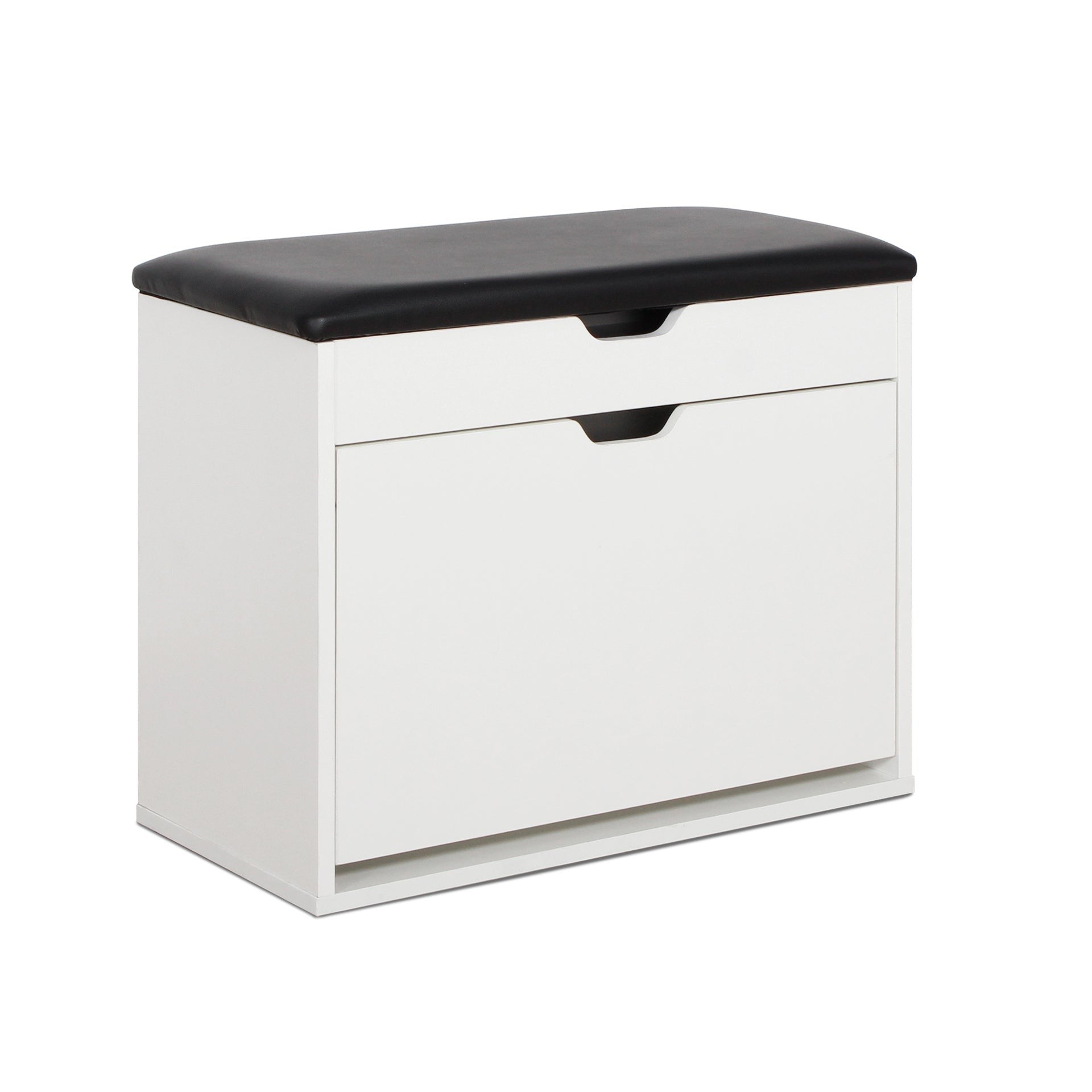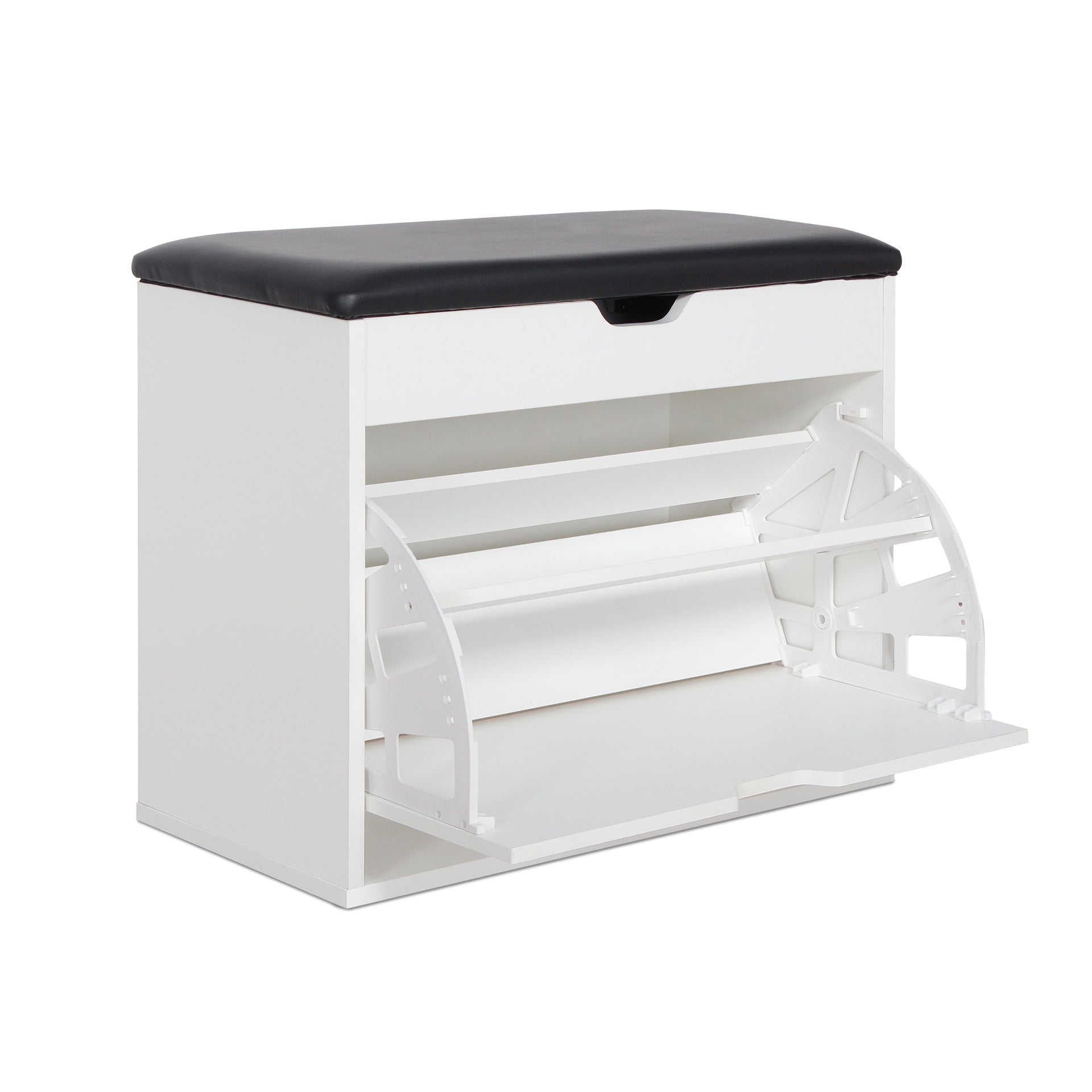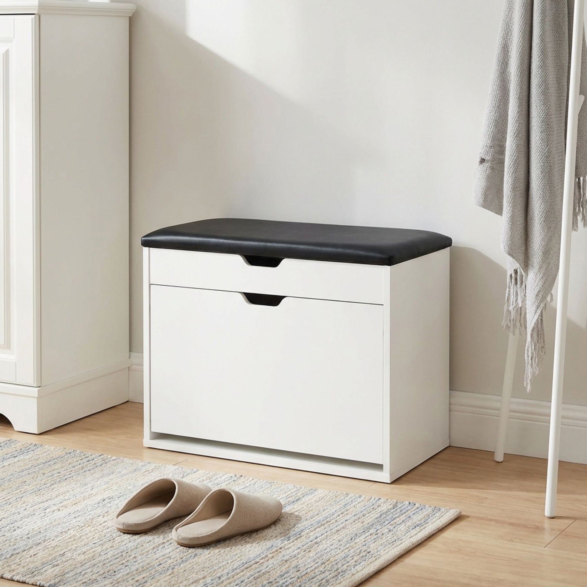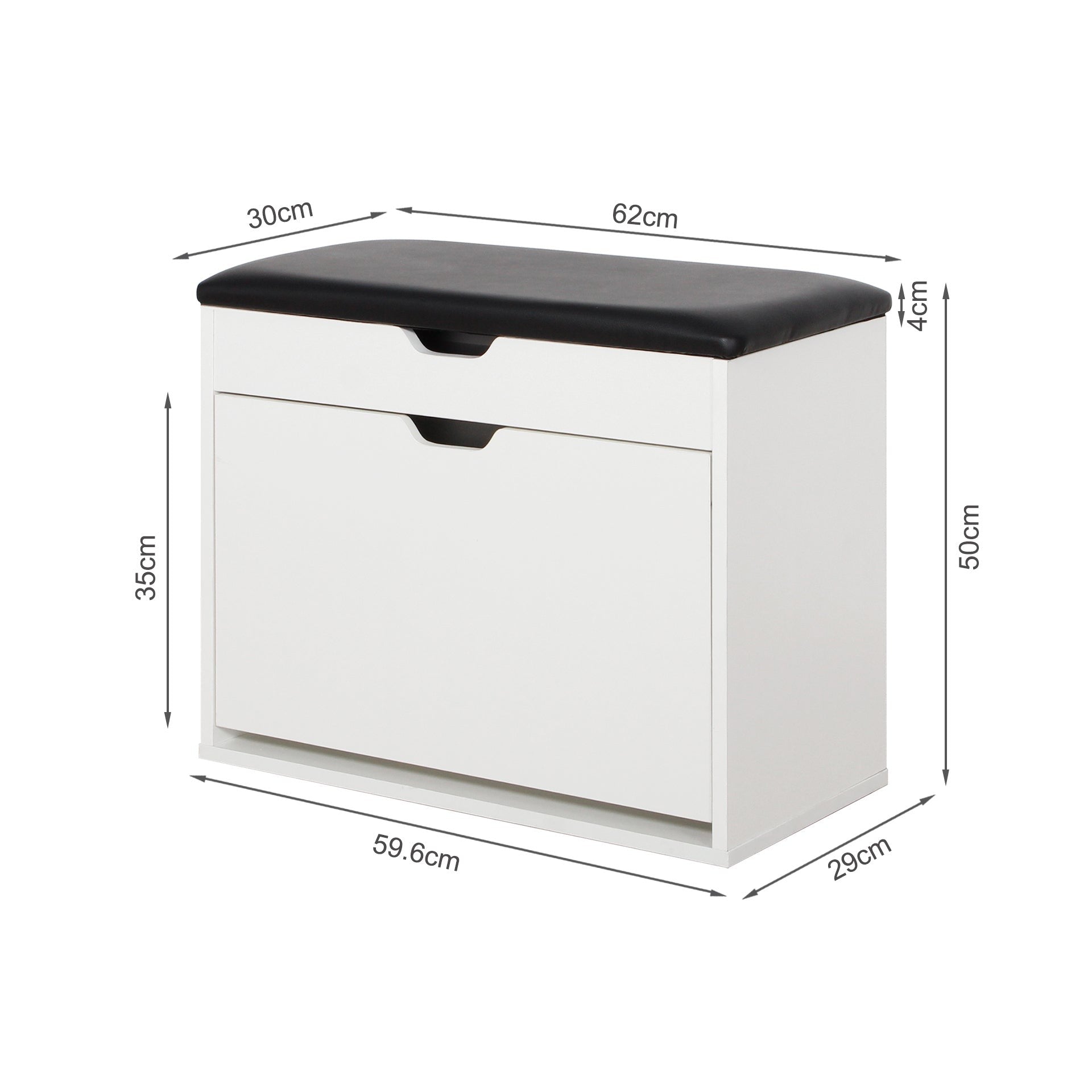 Designed with a hidden fold-out front door with 3 rows in the compartment, this HAWEA Shoe Rack can keep your shoes clean and nice without dust and provides storage for up to 9 pairs of shoes; made of high-quality particle board which is sturdy and durable; features a foam padded seat with PU leather for you to sit and wear or remove your shoes with ease, while the storage compartment under the seat with cut-out handles is great for placing your essentials.