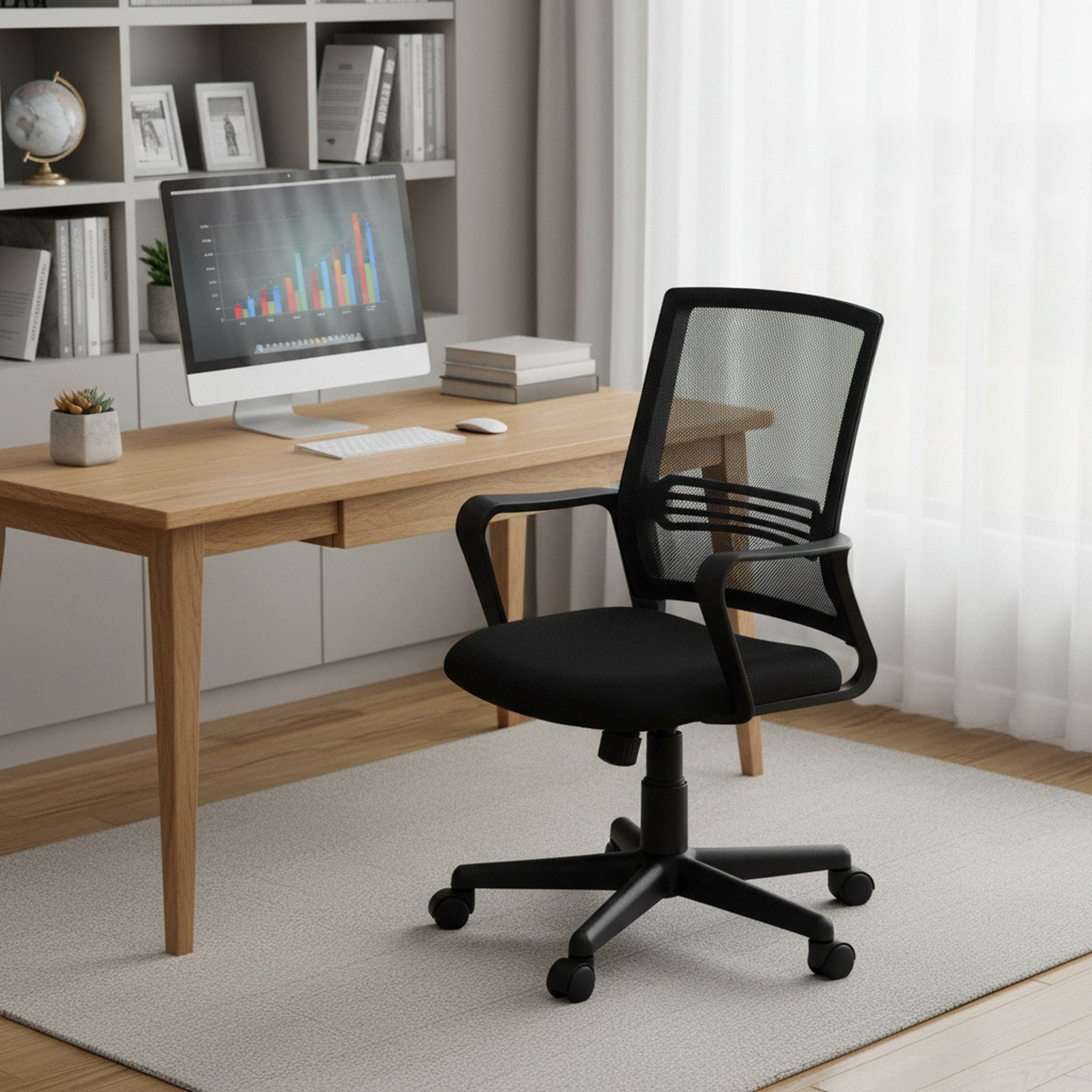 Introducing our new Black JOEI Office Chair - a blend of comfort, function, and style designed for both traditional office and home office use. This office features a high-breathability, black mesh fabric with a thickly padded seat, ensuring exceptional comfort during long work hours.