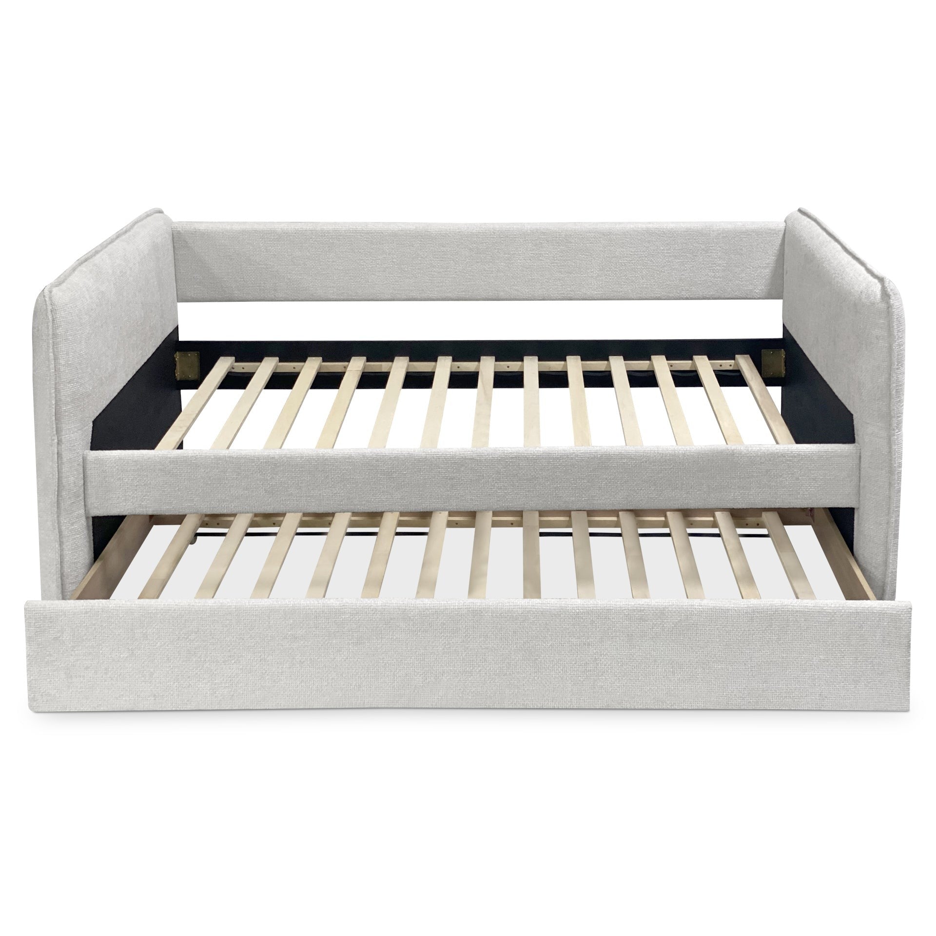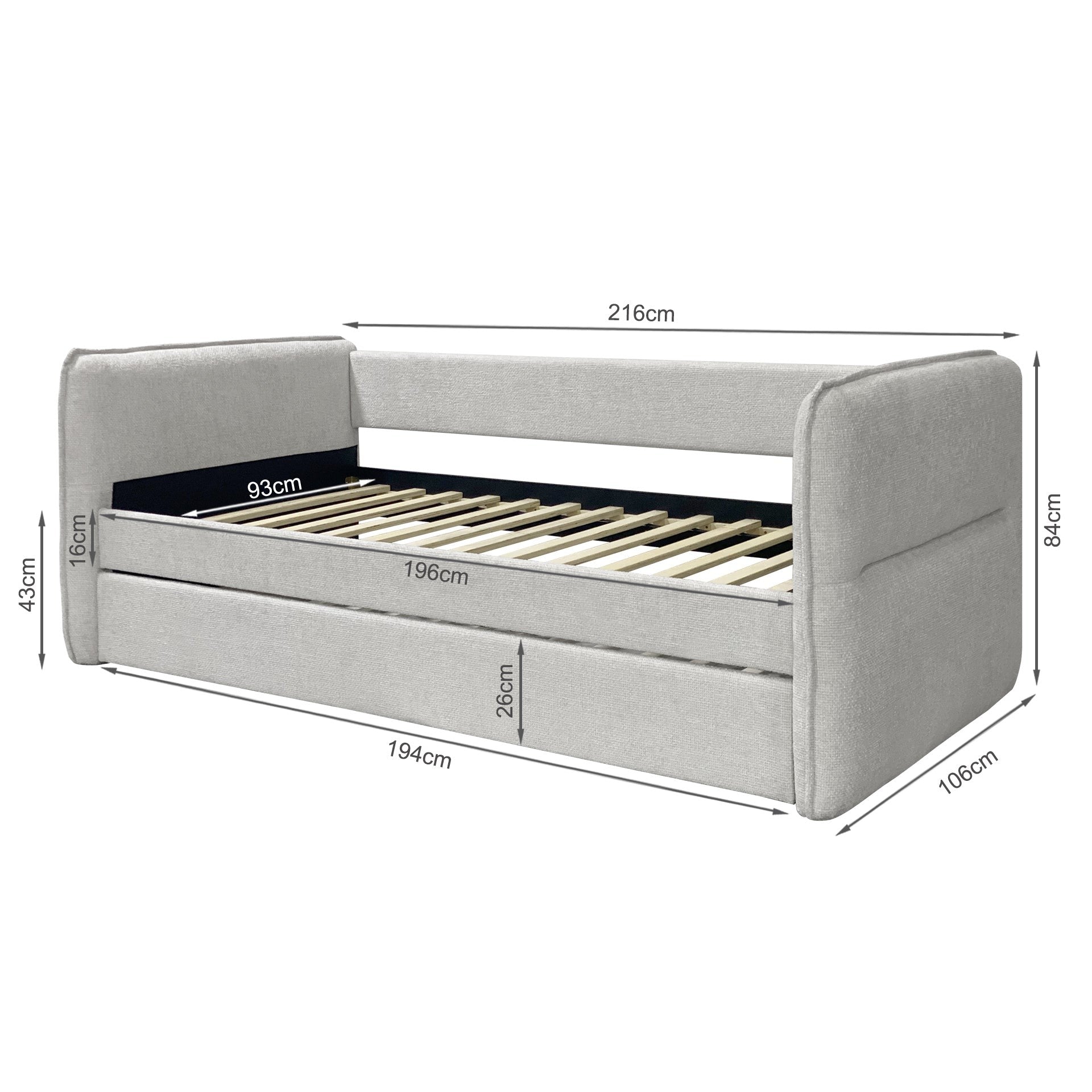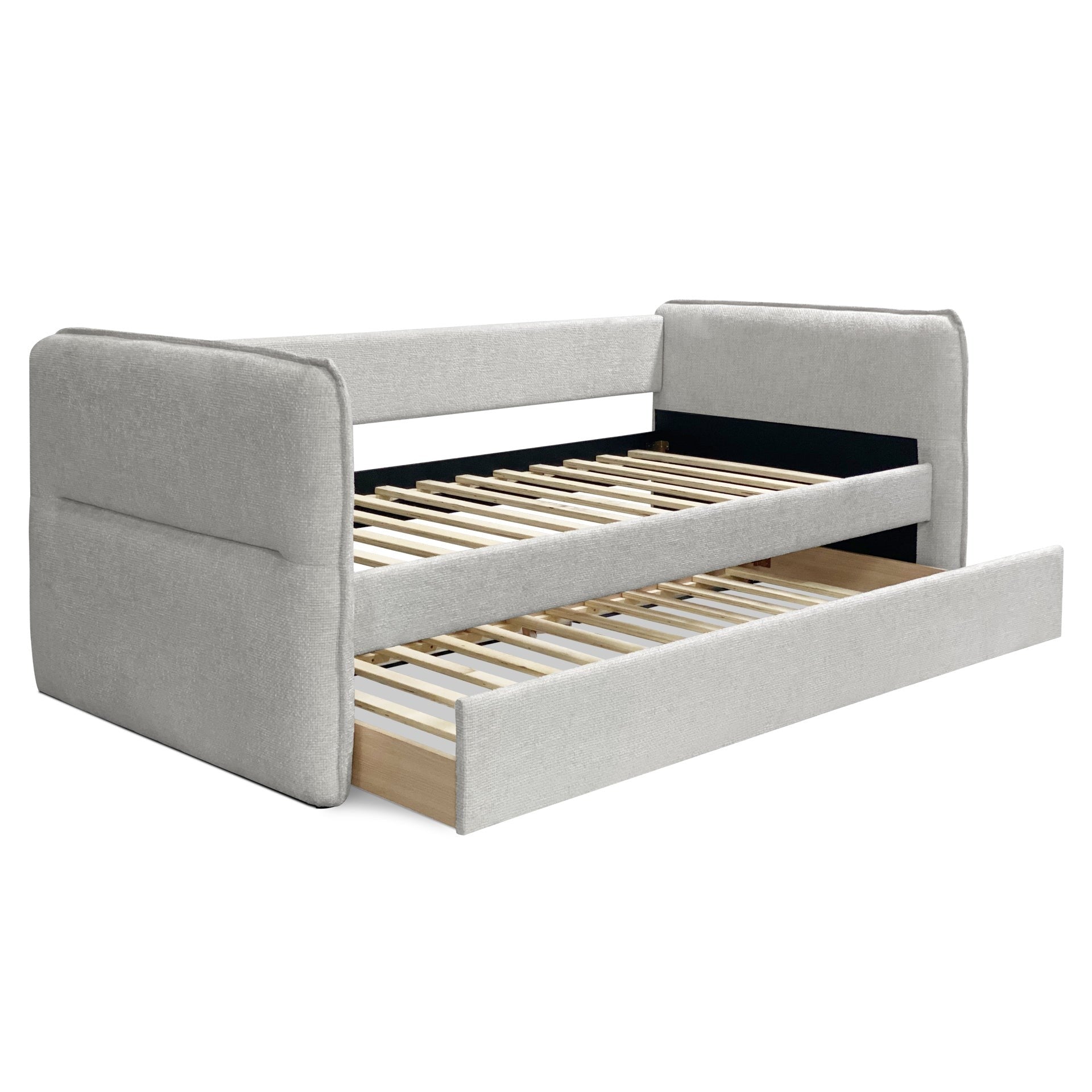Crafted with modern aesthetics in mind, the Joyce Trundle Bed Frame stands as a testament to both style and functionality. Wrapped in enduring polyester fabric, it promises not only durability but also a hint of sophistication. The thicker foam-filled side rails offer enhanced protection, bringing peace of mind for both you and your loved ones. With a pull-out trundle bed cleverly concealed beneath, this frame embodies smart design, efficiently conserving space and accommodating unexpected guests. Its effortless slide-in and out mechanism, facilitated by wheels, ensures both convenience and adaptability. Supported by sturdy wooden flat slats, the frame guarantees resilience and stability. The contemporary daybed style introduces a touch of trendiness to any space, effortlessly becoming the center of attention.