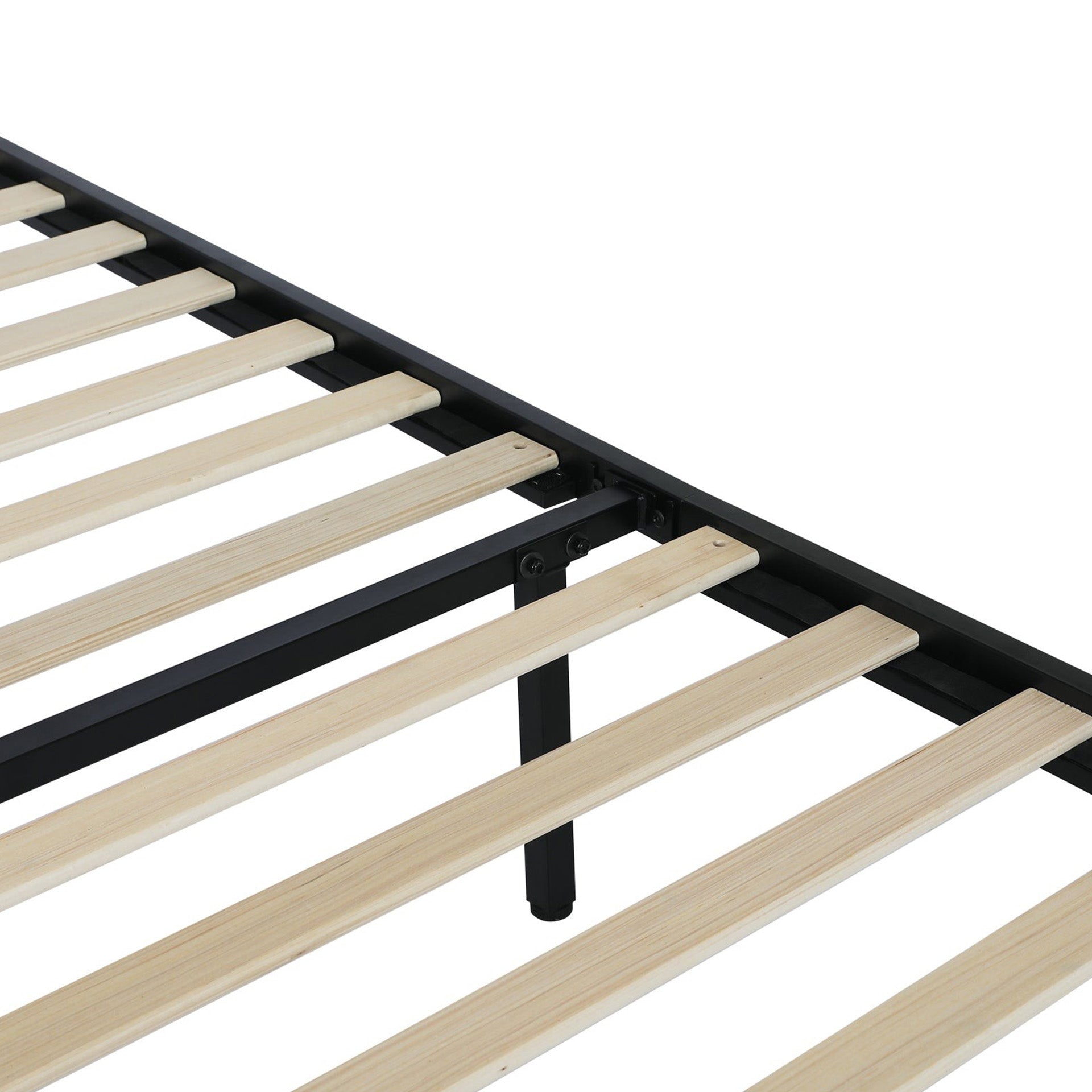 Constructed with robust iron tubes, this frame promises durability and resilience for years to come. Its solid slats provide the perfect foundation for your mattress, while added metal beams and struts reinforce its structure for utmost safety and relaxation. The thoughtful inclusion of a headboard and footboard not only enhances its appeal but also ensures that your mattress remains securely in place, facilitating uninterrupted sleep.