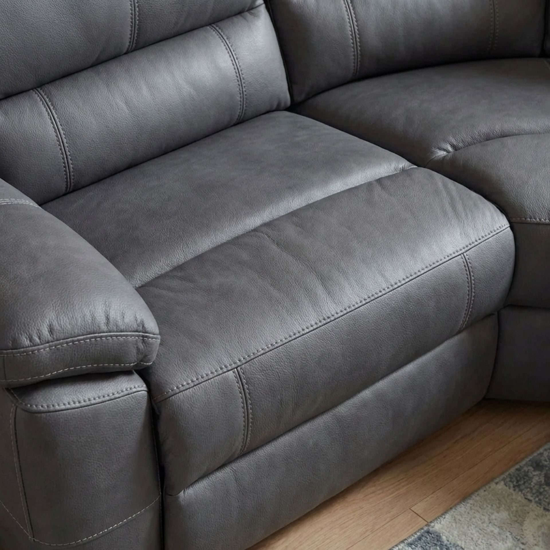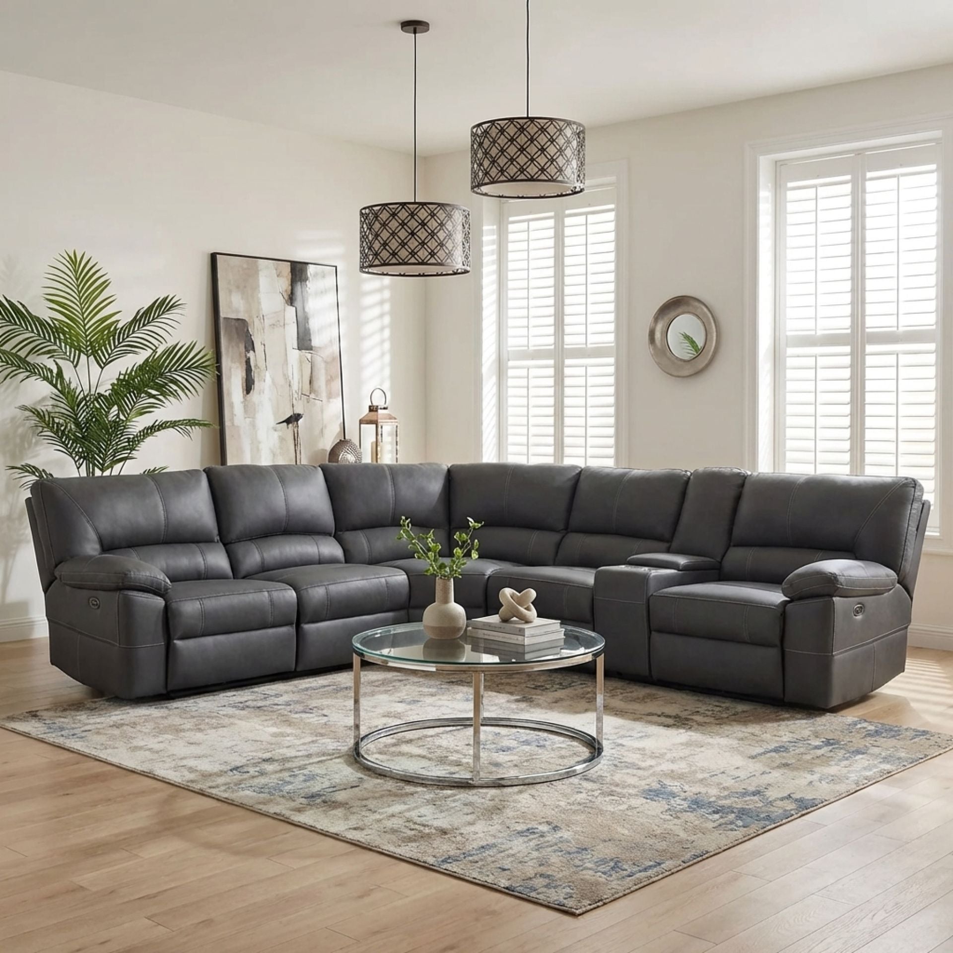 Experience our recliner sofa, with left and right power motion recliners, a console, armless chair with drop down table, normal armless chair and a chic wedge.