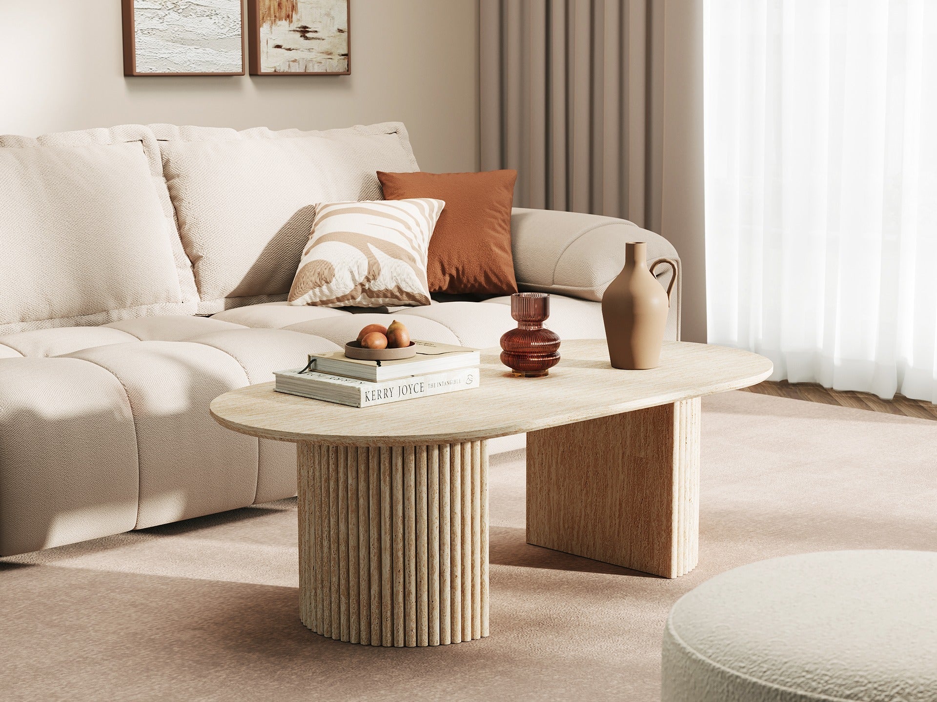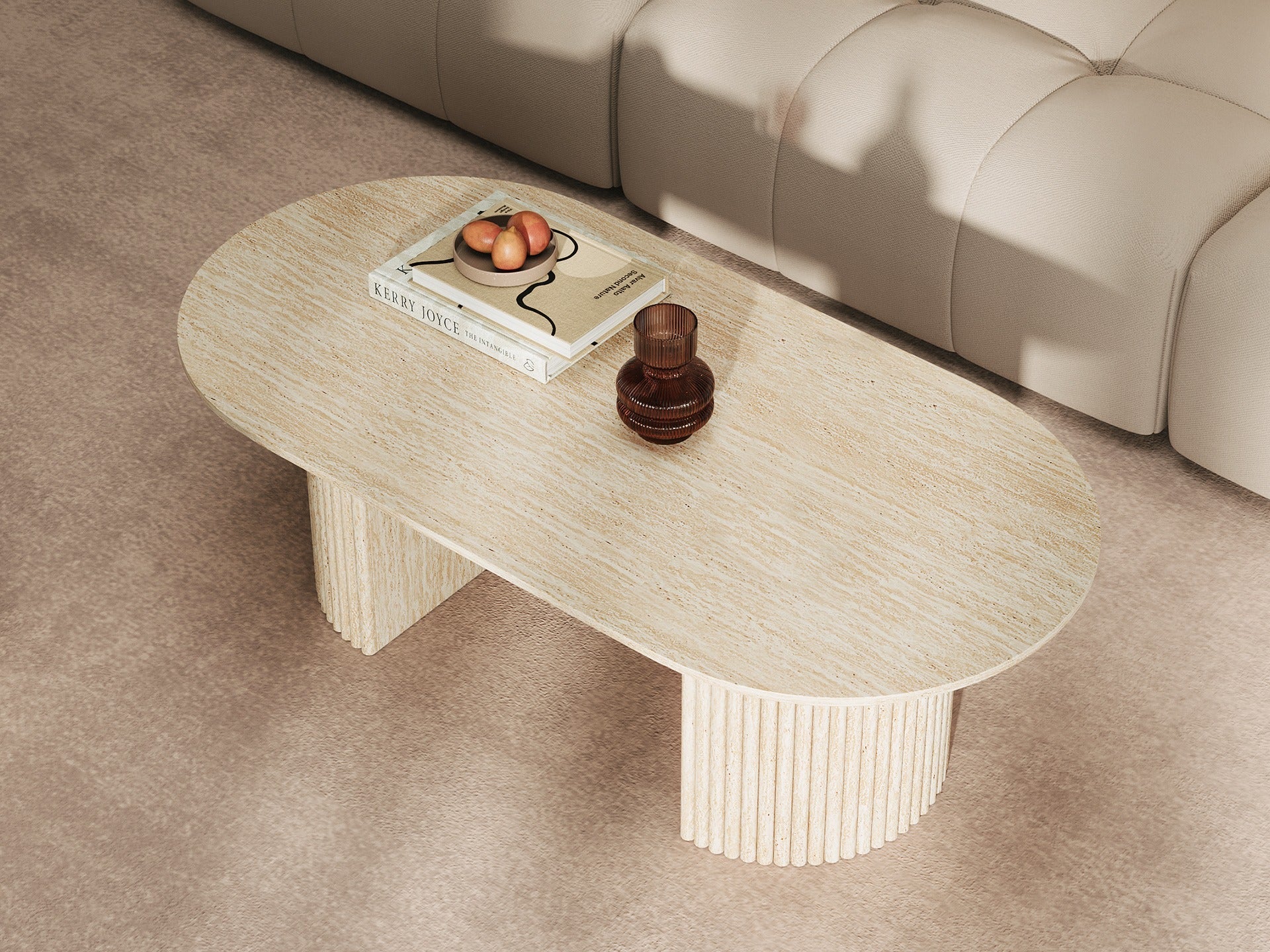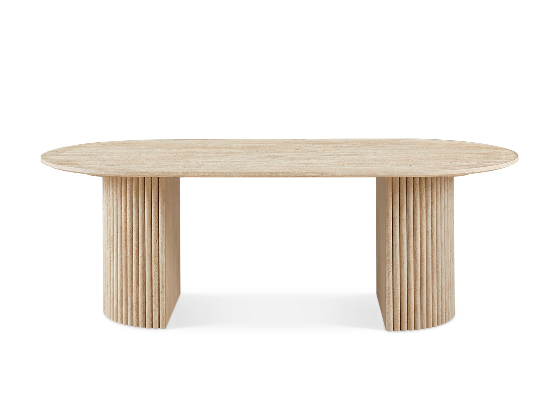Designed for stylish living, this oval coffee table boasts a travertine-look top and a bold dual pedestal base. The generous surface offers ample space for coffee essentials, decor, and everyday use, making it a chic yet practical centrepiece.