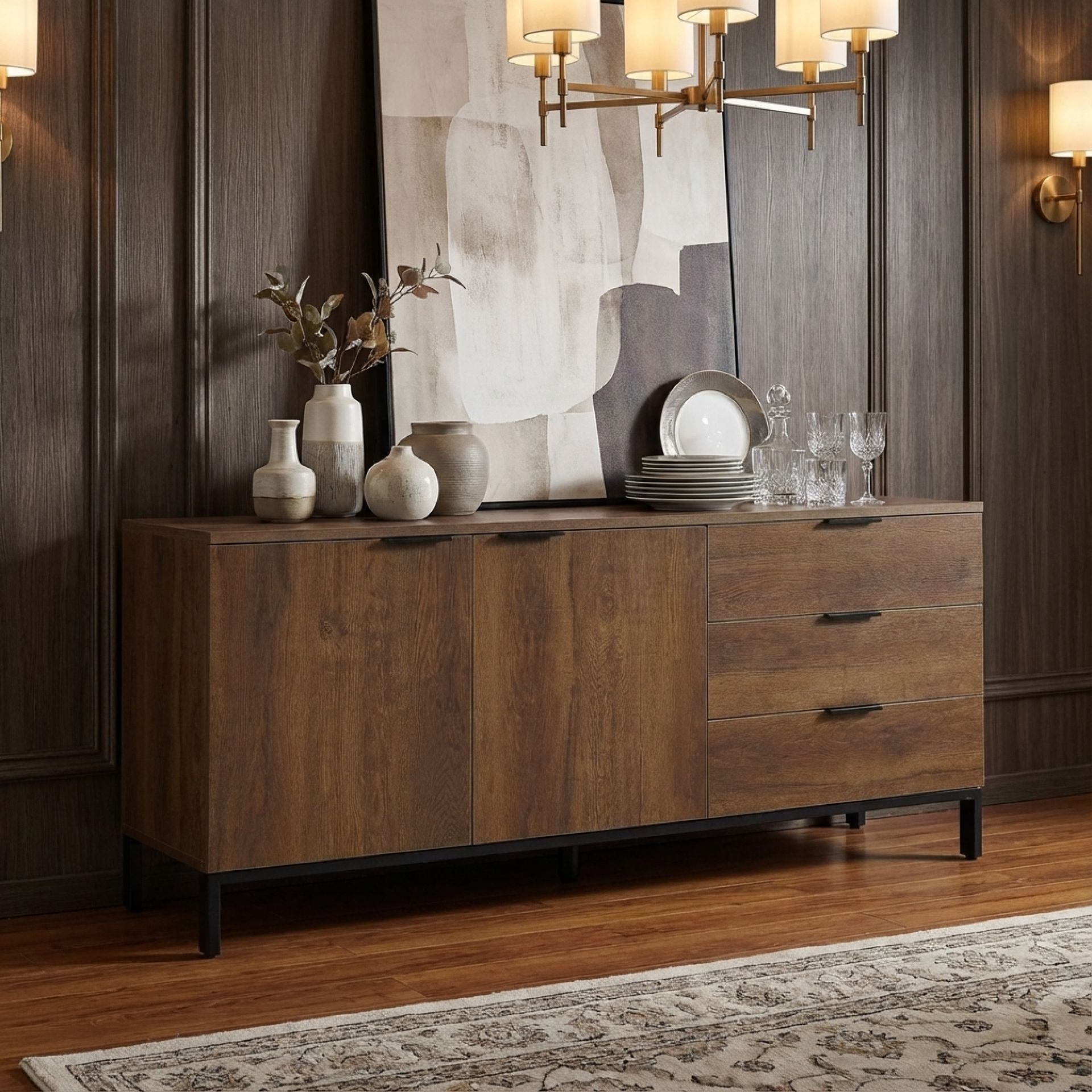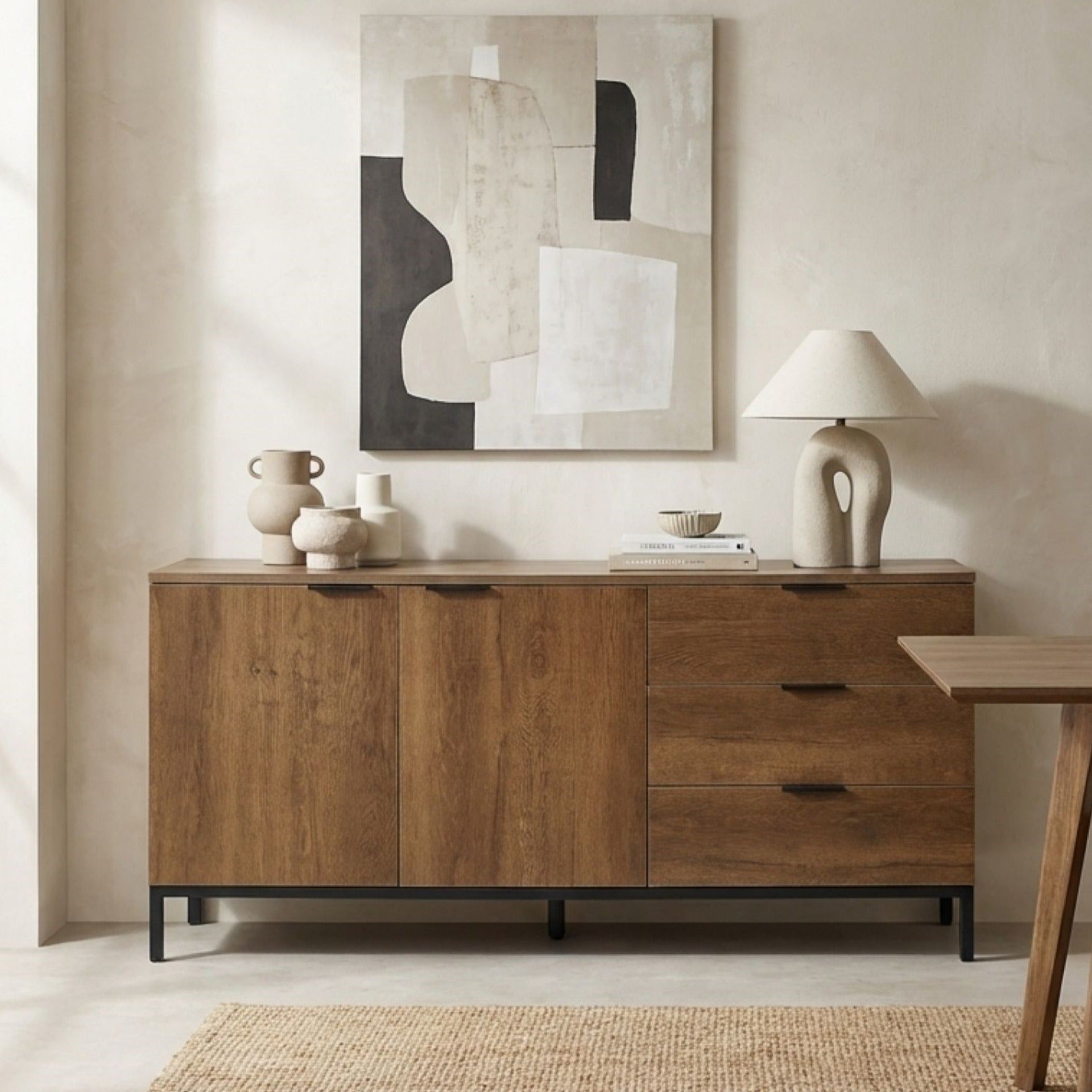 This OCALA Buffet Table is one of our OCALA range products which will be a perfect addition to your dining room and suits any modern or rustic décor perfectly. Made of high quality MDF board with black metal accents, this buffet table is sturdy and durable; the table top offers an ample space to display the serve ware; come with 2 cabinets and 3 drawers for storage plates and cutlery and keep your rooms tidy; while the black alloy handles and smooth drawers with metal runners make it a pleasure to use.