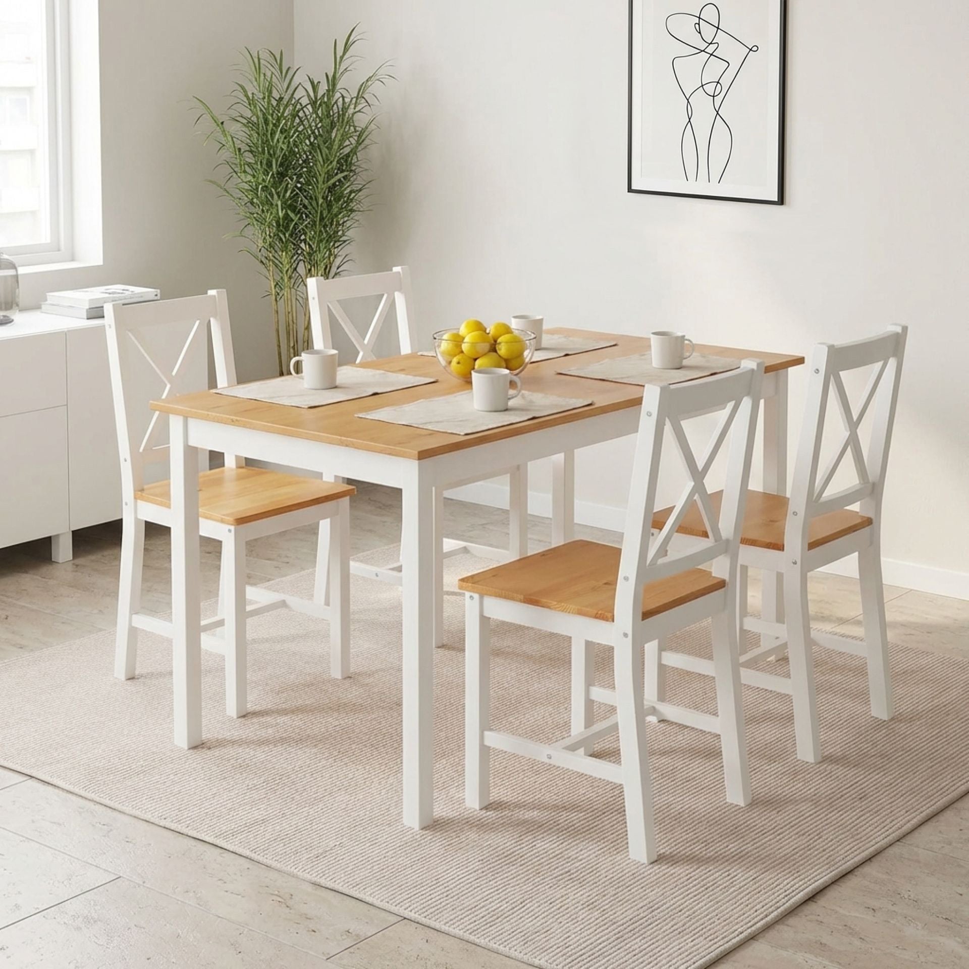 The four chairs are ergonomically designed for maximum comfort during extended meals and conversations. Their classic white finish matches the table seamlessly, creating a cohesive and inviting dining atmosphere.
