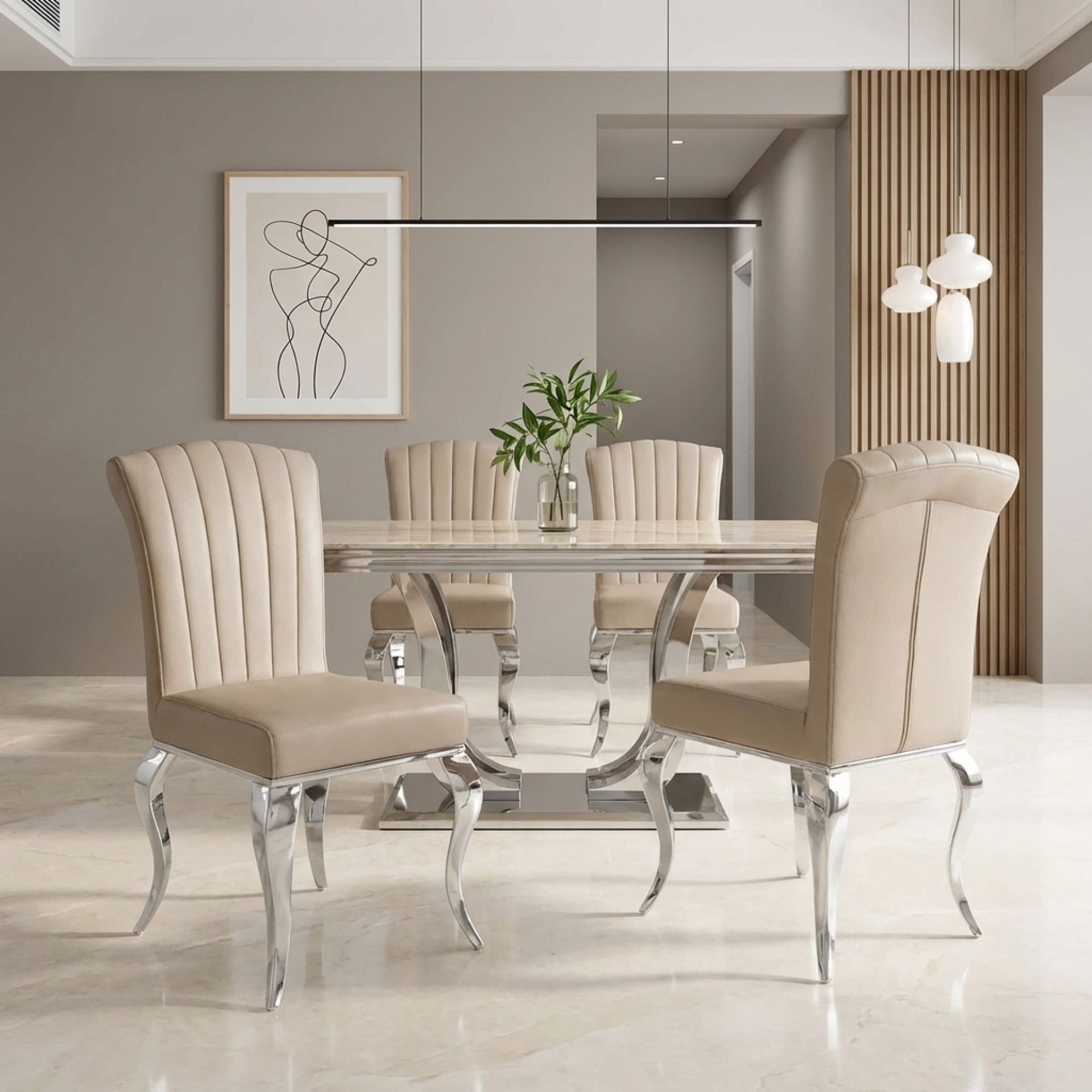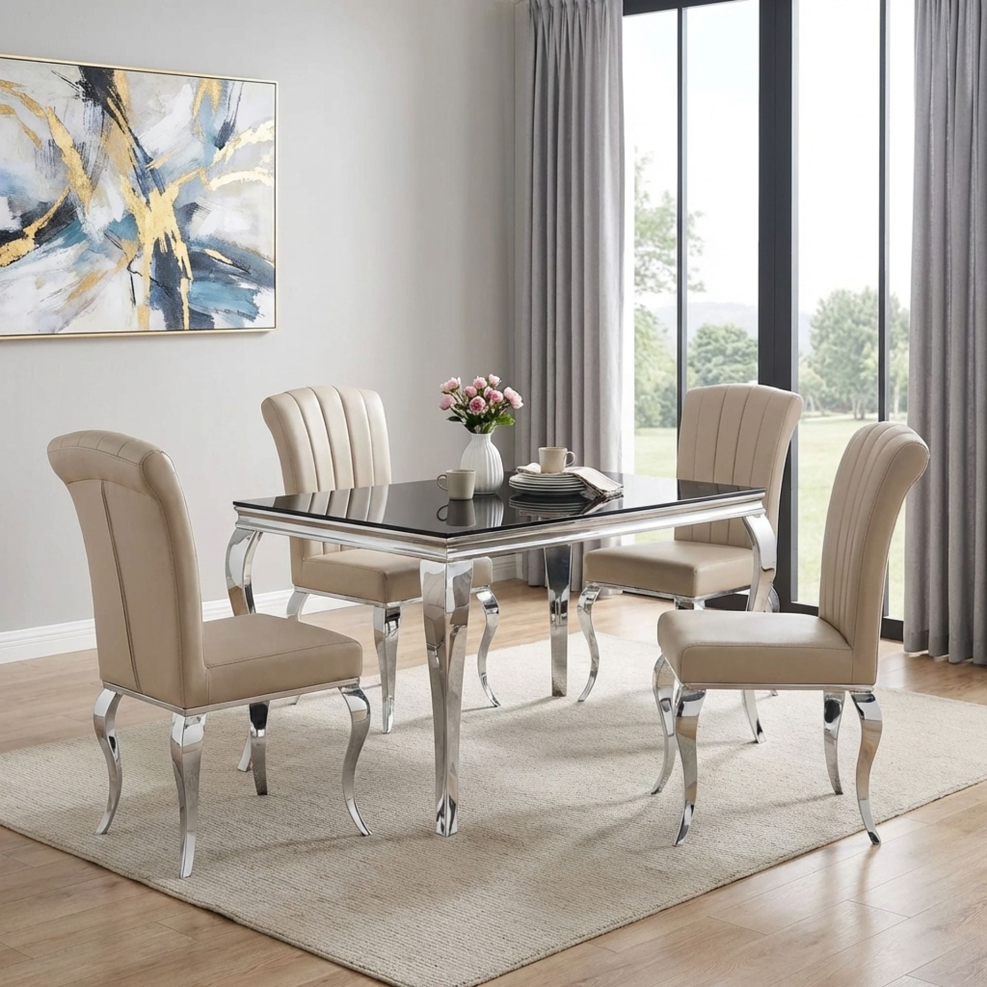 - Cabriole-style stainless steel legs create a graceful silhouette