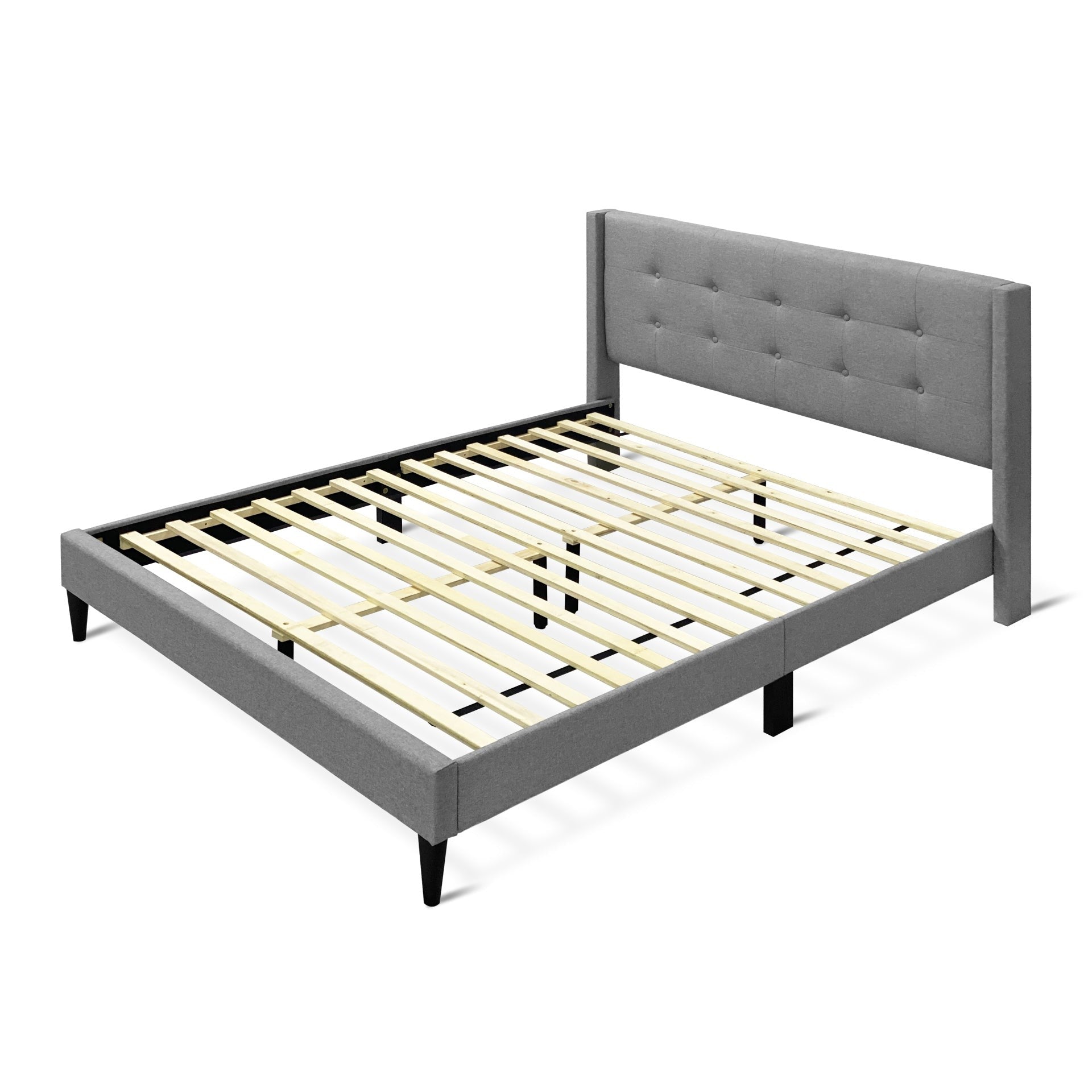 - Material: Polyester fabric upholstery / Metal struts / High density foam padded / Wooden flat slats / Plastic legs