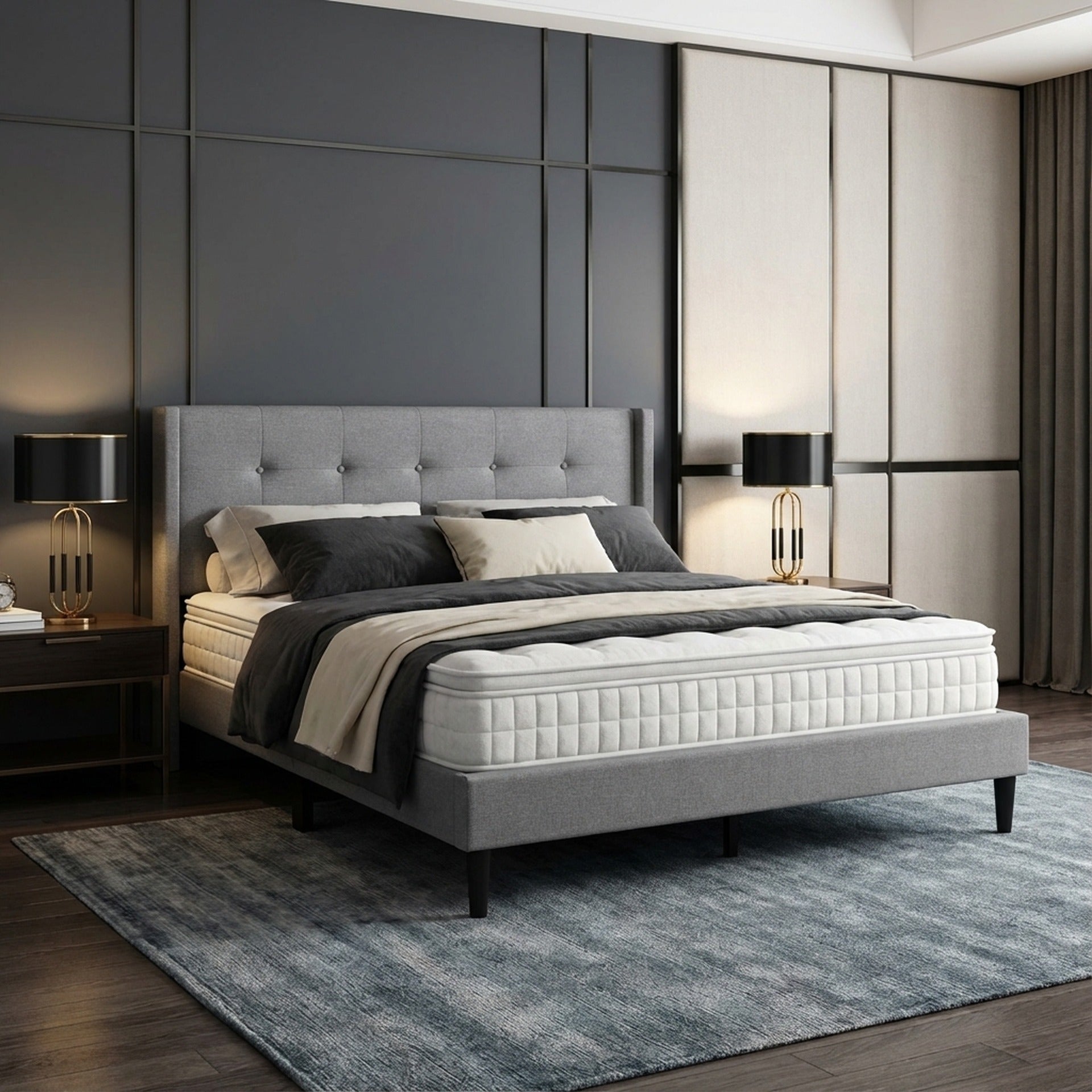 Constructed from high-quality polyester fabric, the Sealy Bed Frame not only looks stunning but promises durability for years to come. It boasts a complete set: a headboard, frame, and slat base, seamlessly blending practicality with modern elegance. Experience the plush comfort of its high-density foam headboard, further enhanced by a luxurious button-tufted design. The bed frame's sturdy wooden flat slats, reinforced by metal struts, ensure unwavering support for any mattress. And, the chic plastic legs add just the right amount of sophistication to its overall aesthetic.